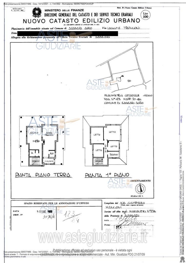 Vendita all'asta Senza incanto - LOTTO UNICO: Sassari (SS) - S.V. Trunconi - Tronco A Bene n. 1. Fabbr civ, pt ingresso, sala da pranzo, cucina, lavanderia, soggiorno, disimpegno, bagno, 2 ripostigli, portico e giardino e p1 2 bagni e 3 camere da letto, C.F. - Fg. 123, P. 84, Bene n. 2. Terreno uliveto C.T. Fg. 123, P. 356, Bene n. 3. Magazzino , C.F. Fg. 123, P. 357, Bene n. 4. Terreno uliveto, C.T. Fg. 123, P. 73, Bene n. 5. Terreno terra, c.t. Fg. 123, P. 39, bene n. 6 Terreno uliveto, C.T. Fg. 123, P. 72,. Prezzo base € 246.248,00 (offerta minima € 184.686,00). Data vendita 30/04/2026 ore 15:30. Giudice Remonti. Professionista delegato alla vendita Avv. Chiara Murgia - Email "avvchiaramurgia@gmail.com". Custode Giudiziario Istituto Vendite Giudiziarie Sassari - Email "visitaivgsassari@gmail.com"; Tel. 079260228. Rif. Tribunale di Sassari - Esecuzione immobiliare post legge 80 n. 90/2020