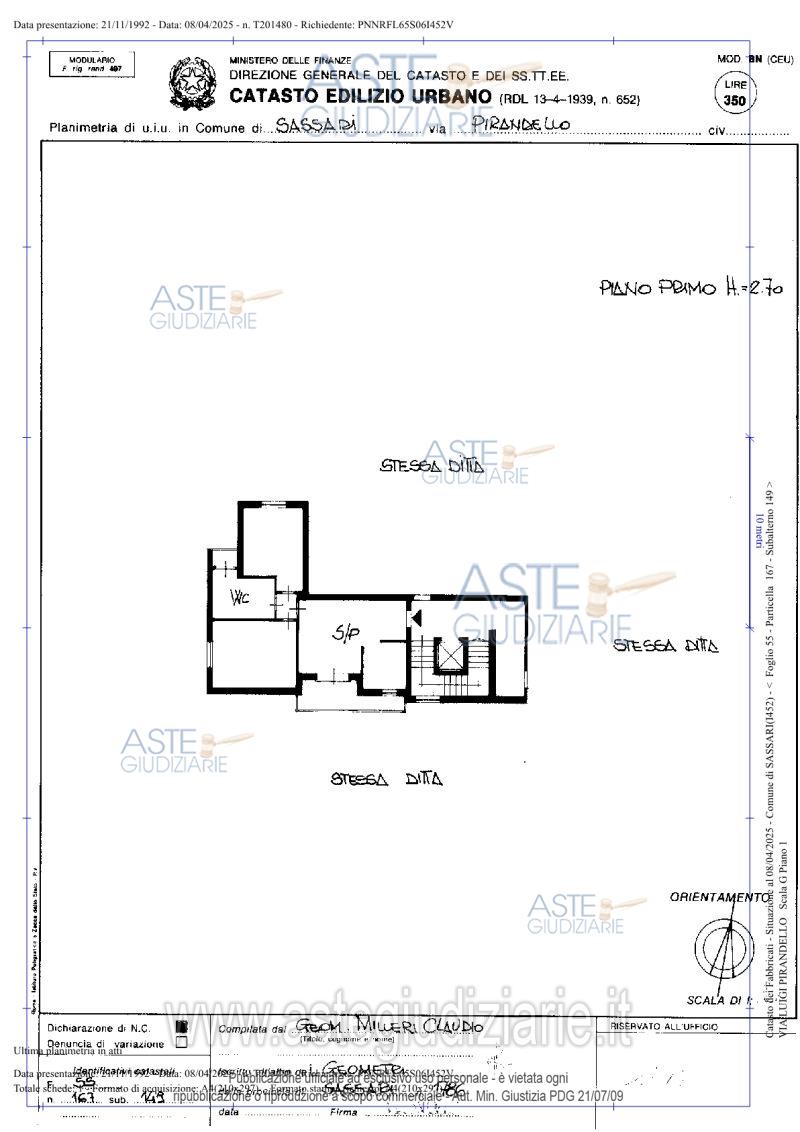 Vendita all'asta Senza incanto, con gara telematica asincrona - LOTTO UNICO: SASSARI (SS) Via Luigi Pirandello n 1/Z SCALA G, edificio 3, scala G, piano 1 Piena proprietà dell’appartamento della consistenza di 4,5 vani. Distinto al NCEU Fg. 55, Part. 167, Sub. 149, Zc. 2, Categoria A3 superficie catastale mq. 77 classe 3 rendita € 406,71L'immobile viene posto in vendita per il diritto di piena proprietà (1/1) . Prezzo base € 99.262,82 (offerta minima € 74.446,88). Data inizio operazioni di vendita: 23/03/2026 ore 12:00. Giudice Dott Ssa Elisa Remonti. Professionista delegato alla vendita Avv. Avv M Diletta Diana - Email "avv.dilettadiana@gmail.com"; Cell. 3397737587; Tel. 3397737587. Custode Giudiziario Istituto Vendite Giudiziarie Sassari - Email "visitaivgsassari@gmail.com"; Tel. 079260228. Rif. Tribunale di Sassari - Espropriazione immobiliare (cartabia) n. 118/2024