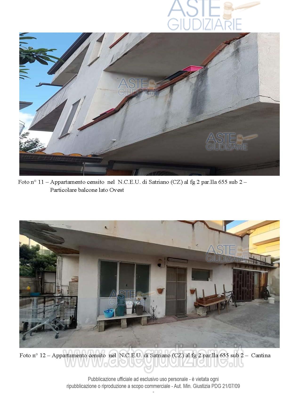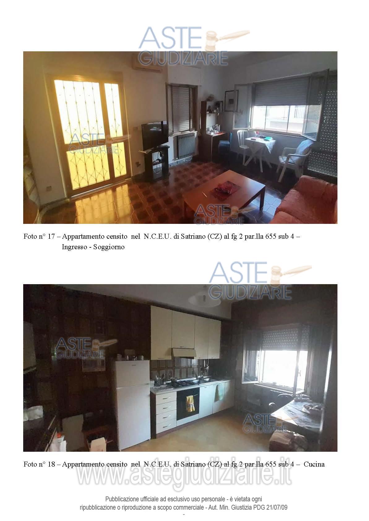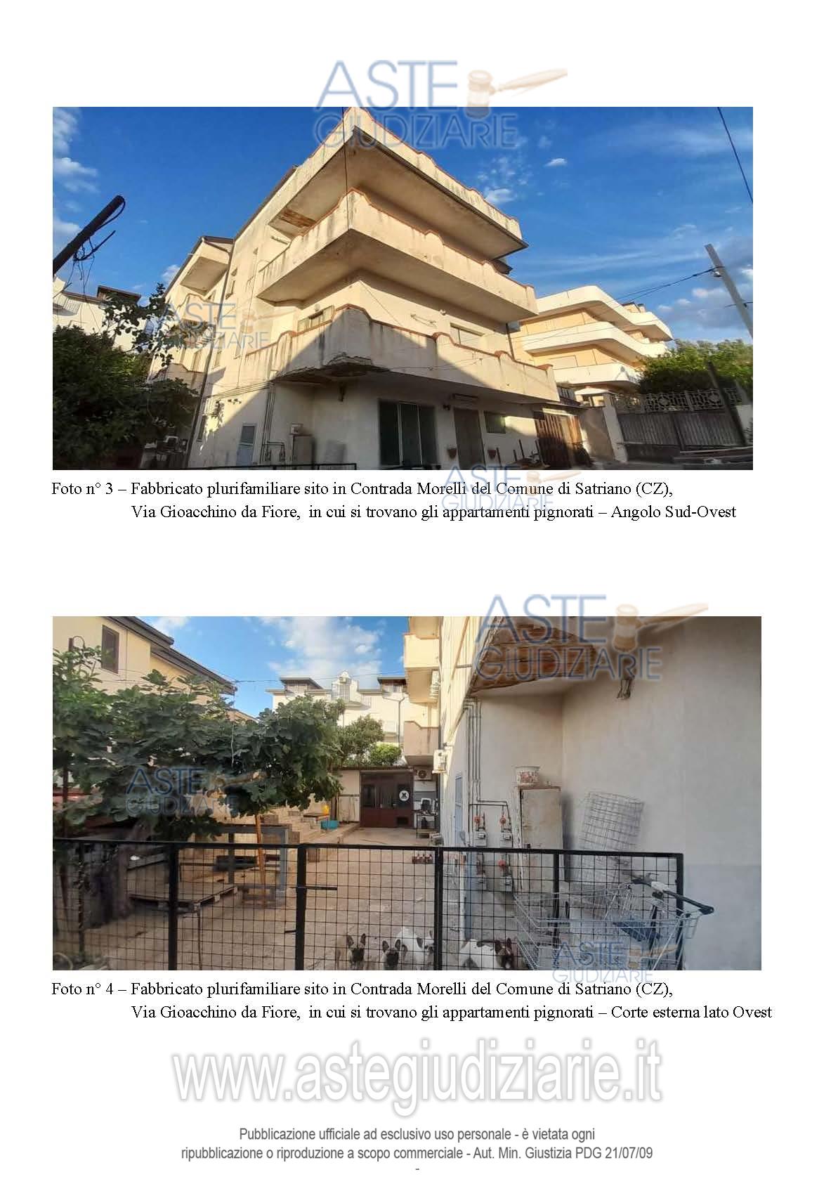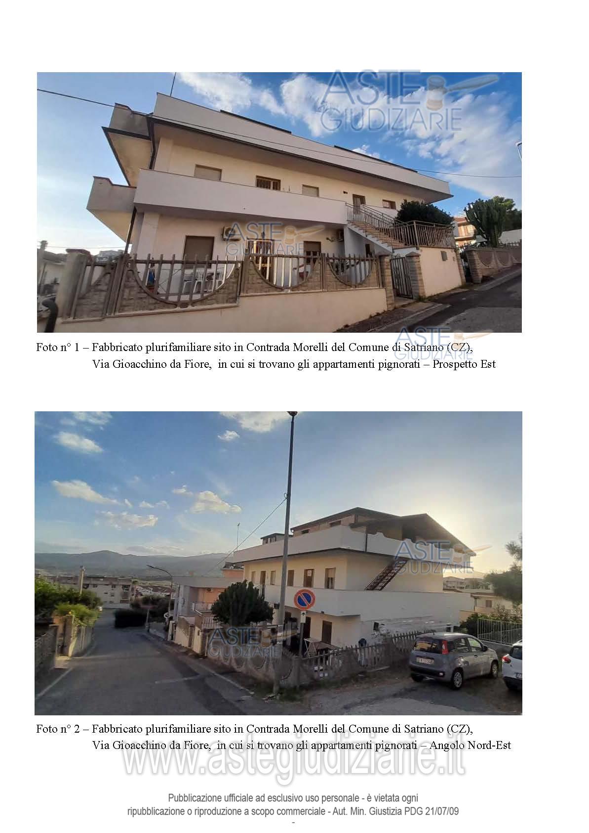 Vendita all'asta Senza incanto, con gara telematica asincrona - LOTTO UNICO: Piena proprietà di: appartamento in Satriano (CZ), Via G. da Fiore n. 21 in N.C.E.U. al F. 2, p.lla 655 sub 2, Piano S1-T, Cat. A/3, Superficie totale 125 mq, Rendita Catastale euro 147,71, comprendente anche una cantina posta al piano seminterrato del fabbricato ; appartamento in Satriano (CZ), Via G. da Fiore n. 19, nel N.C.E.U. al F. 2, p.lla 655 sub 4, Piano T, Cat. A/3, Superficie totale 91 mq, Rendita Catastale euro 120,85; il tutto come descritto nella relazione tecnica di stima dell’Ing. Mario Bitonti. Prezzo base € 100.800,00 (offerta minima € 75.600,00). Data inizio operazioni di vendita: 30/06/2026 ore 10:00. Professionista delegato alla vendita Avv. Alessandra Tassoni - Email "avv.atassoni@gmail.com"; Cell. 3384248637. Custode Giudiziario Avv. Alessandra Tassoni - Email "avv.atassoni@gmail.com"; Cell. 3384248637. Rif. Tribunale di Catanzaro - Espropriazione immobiliare (cartabia) n. 67/2024