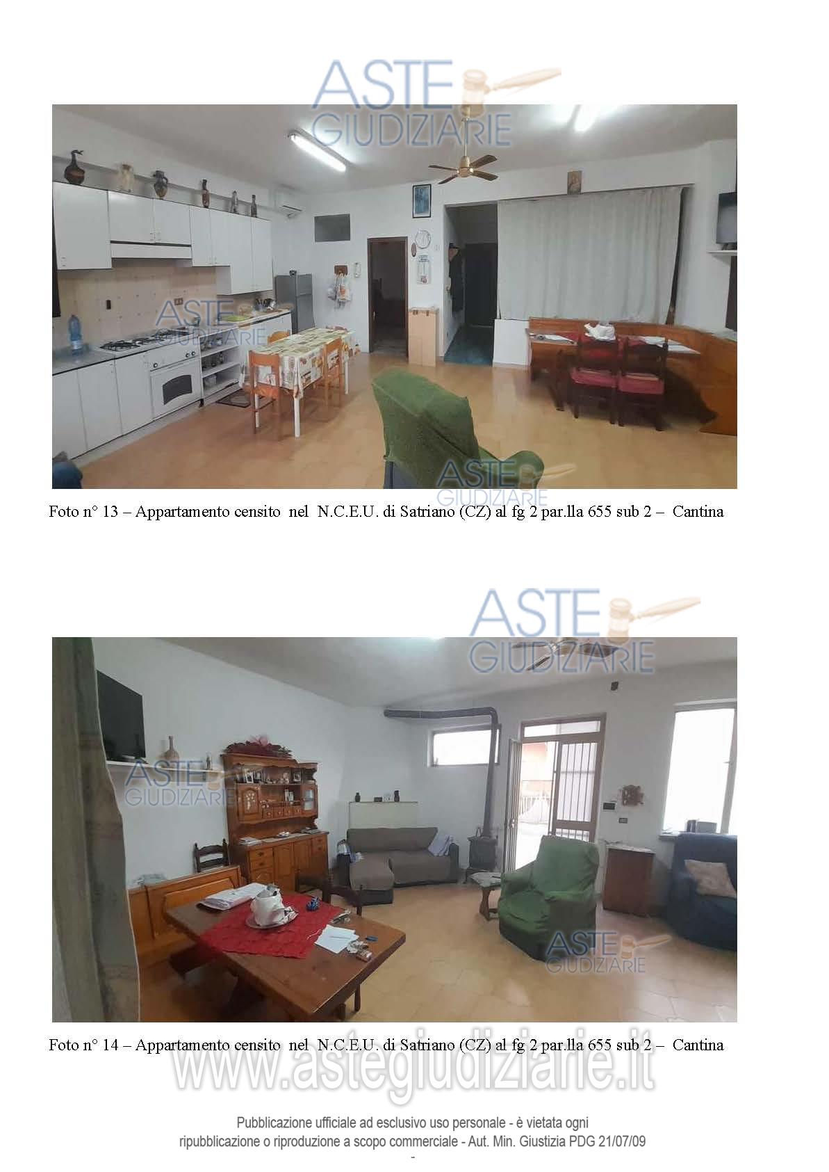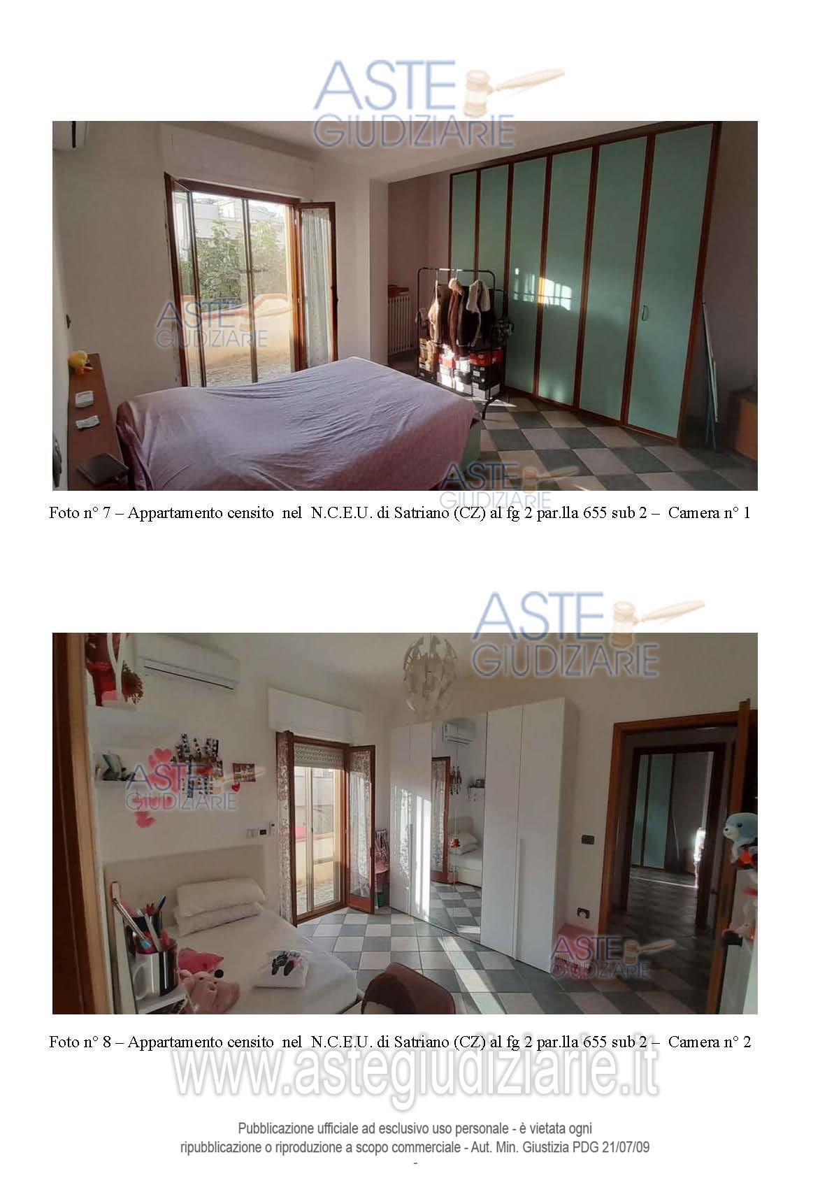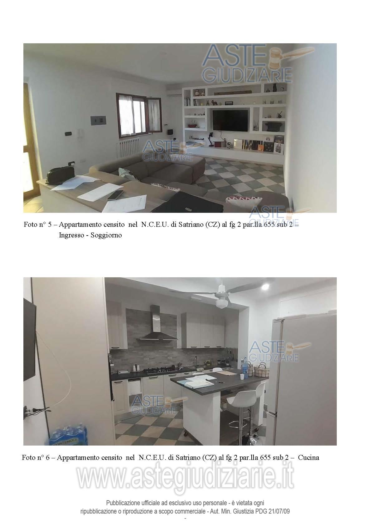 Vendita all'asta Senza incanto, con gara telematica asincrona - LOTTO UNICO: Piena proprietà di: appartamento in Satriano (CZ), Via G. da Fiore n. 21 in N.C.E.U. al F. 2, p.lla 655 sub 2, Piano S1-T, Cat. A/3, Superficie totale 125 mq, Rendita Catastale euro 147,71, comprendente anche una cantina posta al piano seminterrato del fabbricato ; appartamento in Satriano (CZ), Via G. da Fiore n. 19, nel N.C.E.U. al F. 2, p.lla 655 sub 4, Piano T, Cat. A/3, Superficie totale 91 mq, Rendita Catastale euro 120,85; il tutto come descritto nella relazione tecnica di stima dell’Ing. Mario Bitonti. Prezzo base € 100.800,00 (offerta minima € 75.600,00). Data inizio operazioni di vendita: 30/06/2026 ore 10:00. Professionista delegato alla vendita Avv. Alessandra Tassoni - Email "avv.atassoni@gmail.com"; Cell. 3384248637. Custode Giudiziario Avv. Alessandra Tassoni - Email "avv.atassoni@gmail.com"; Cell. 3384248637. Rif. Tribunale di Catanzaro - Espropriazione immobiliare (cartabia) n. 67/2024