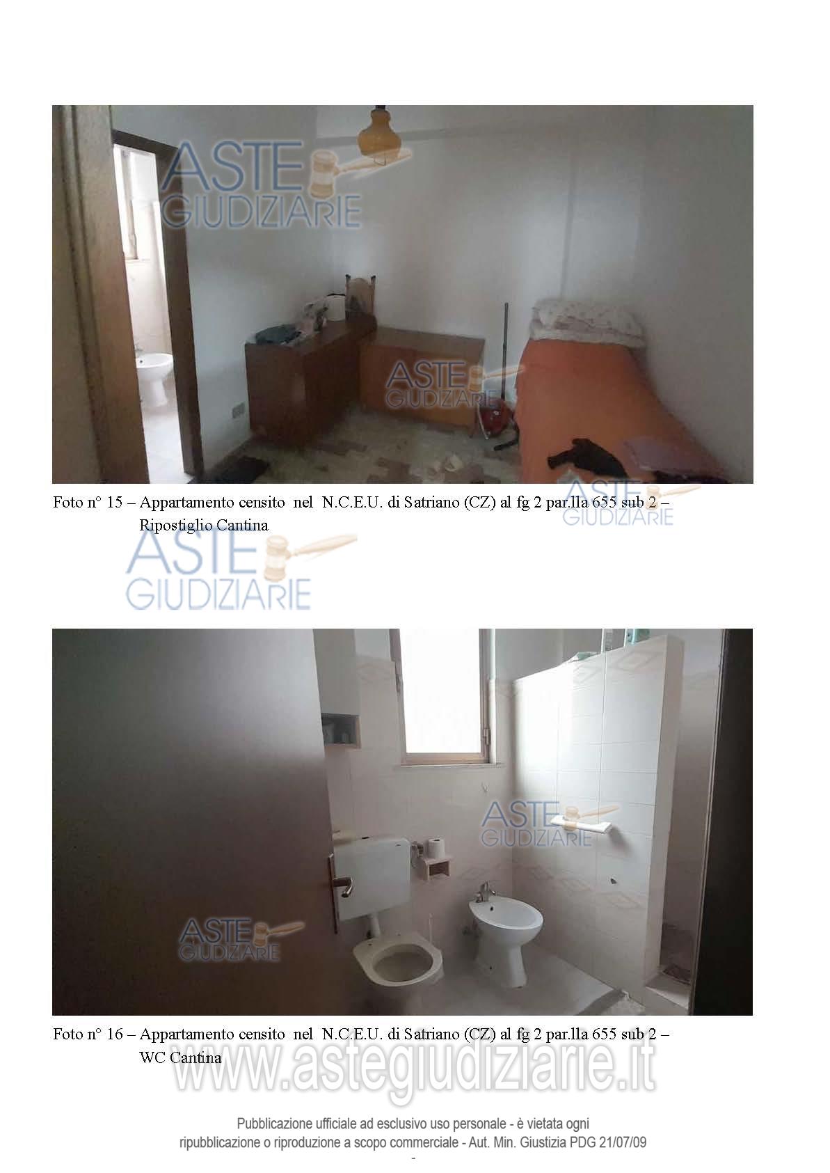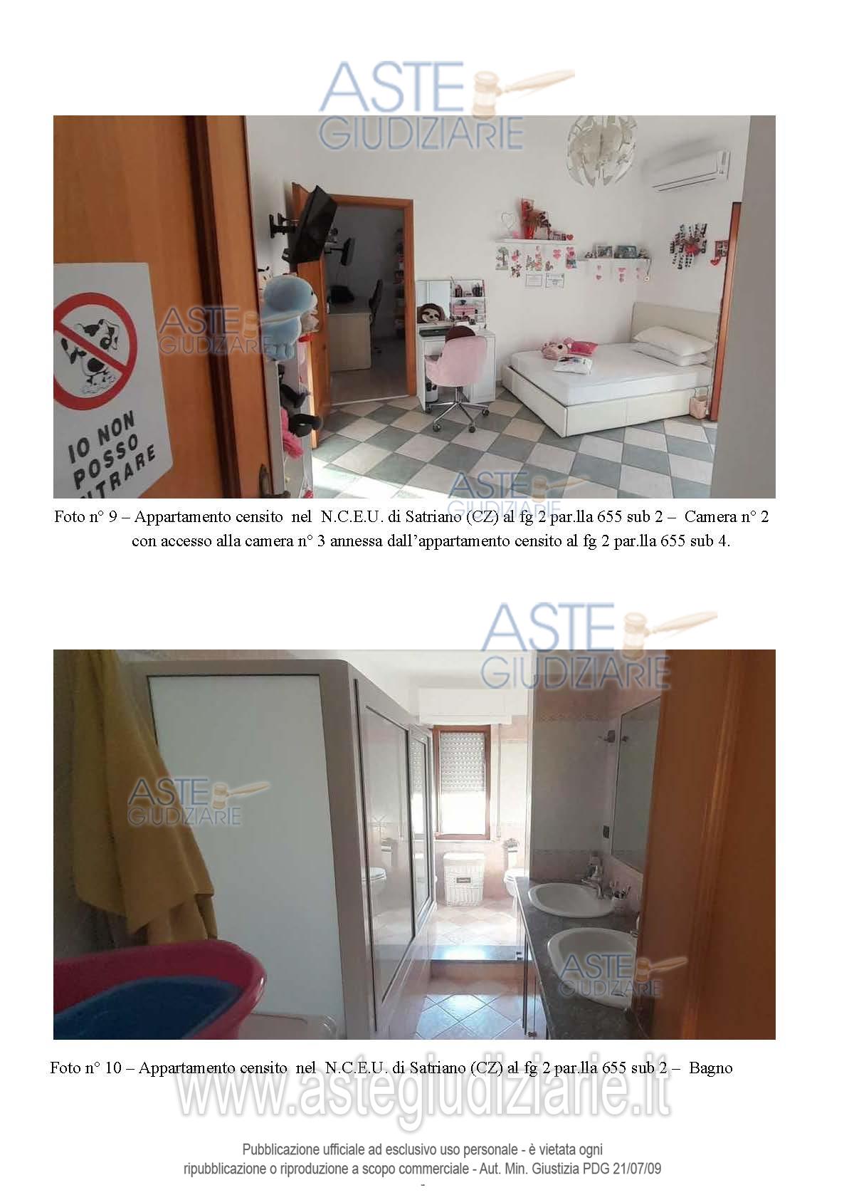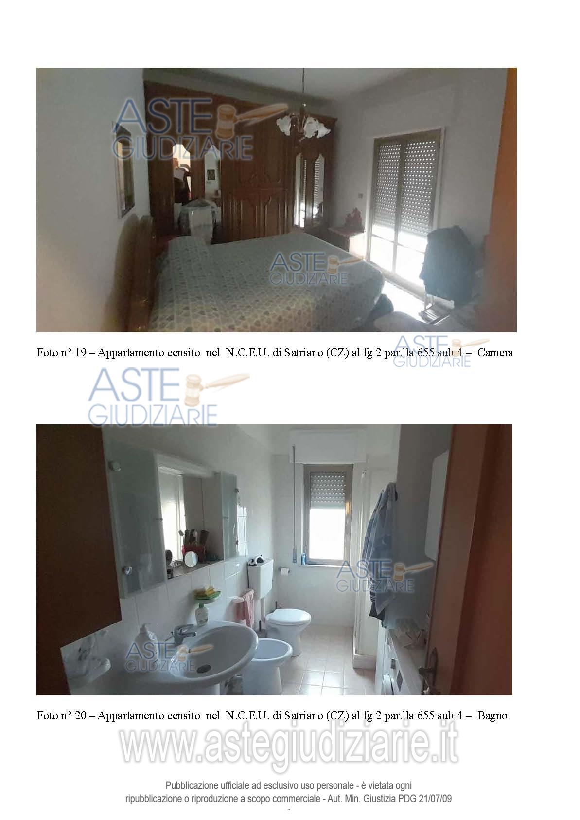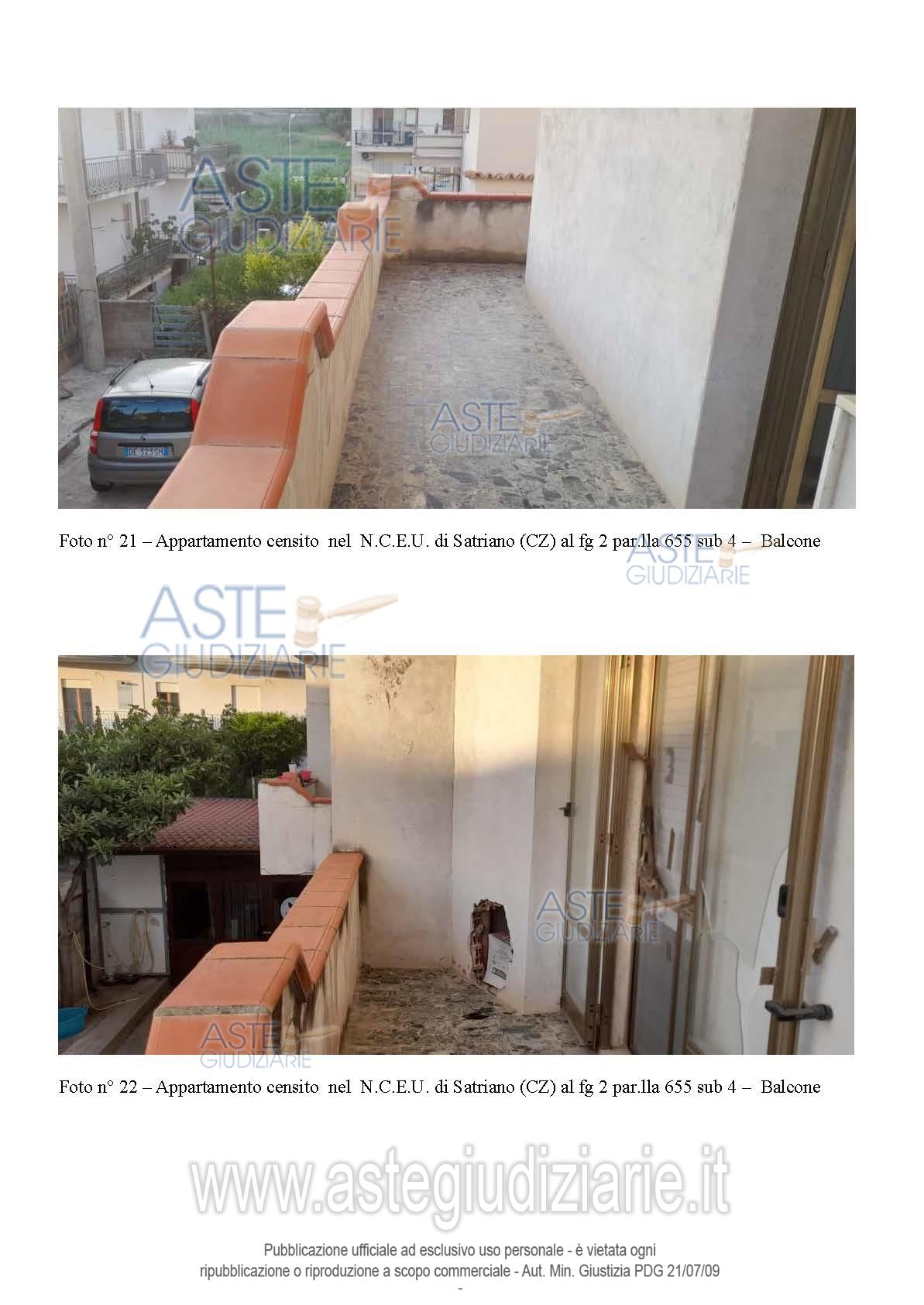 Vendita all'asta Senza incanto, con gara telematica asincrona - LOTTO UNICO: Piena proprietà di: appartamento in Satriano (CZ), Via G. da Fiore n. 21 in N.C.E.U. al F. 2, p.lla 655 sub 2, Piano S1-T, Cat. A/3, Superficie totale 125 mq, Rendita Catastale euro 147,71, comprendente anche una cantina posta al piano seminterrato del fabbricato ; appartamento in Satriano (CZ), Via G. da Fiore n. 19, nel N.C.E.U. al F. 2, p.lla 655 sub 4, Piano T, Cat. A/3, Superficie totale 91 mq, Rendita Catastale euro 120,85; il tutto come descritto nella relazione tecnica di stima dell’Ing. Mario Bitonti. Prezzo base € 100.800,00 (offerta minima € 75.600,00). Data inizio operazioni di vendita: 30/06/2026 ore 10:00. Professionista delegato alla vendita Avv. Alessandra Tassoni - Email "avv.atassoni@gmail.com"; Cell. 3384248637. Custode Giudiziario Avv. Alessandra Tassoni - Email "avv.atassoni@gmail.com"; Cell. 3384248637. Rif. Tribunale di Catanzaro - Espropriazione immobiliare (cartabia) n. 67/2024