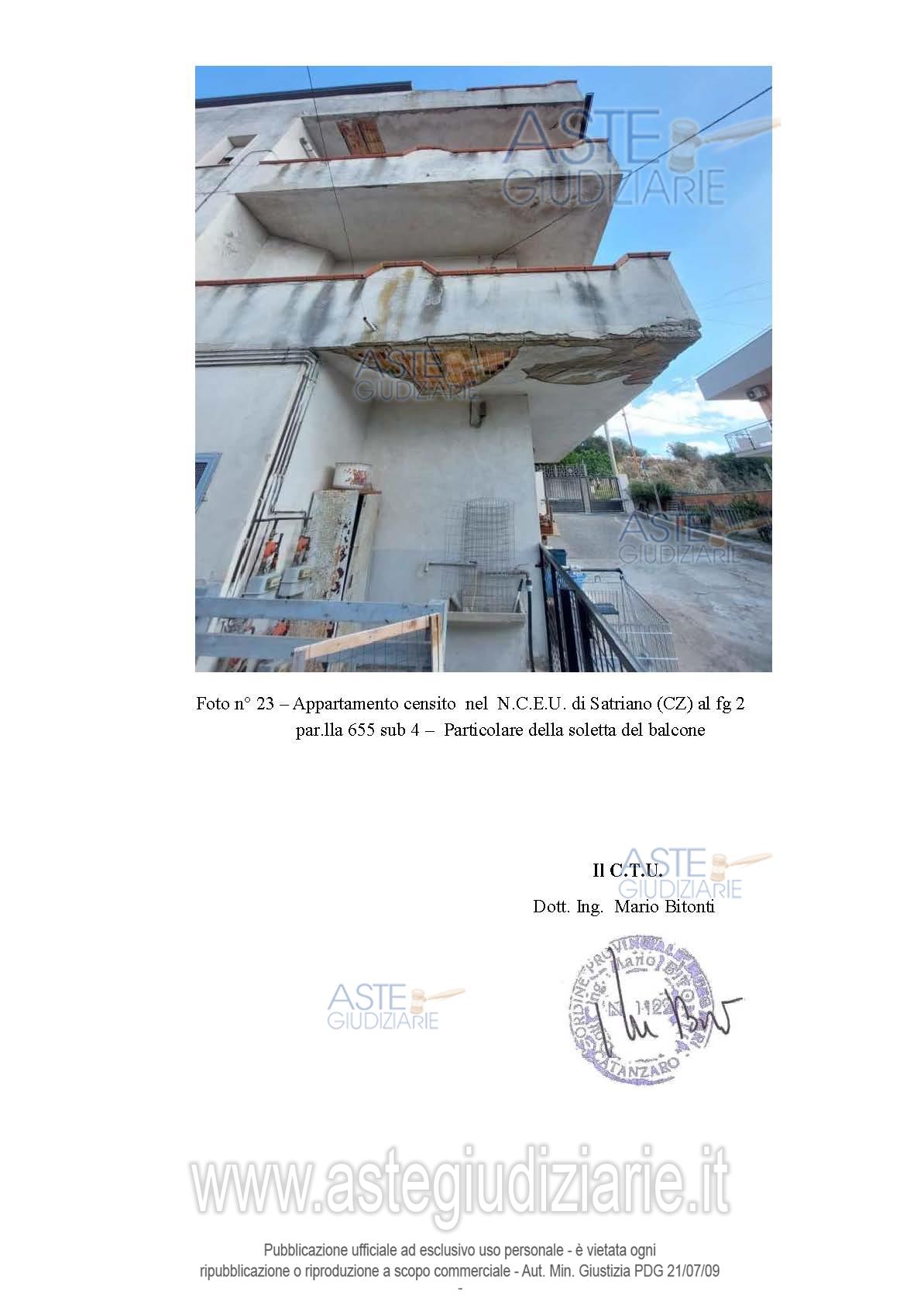 Vendita all'asta Senza incanto, con gara telematica asincrona - LOTTO UNICO: Piena proprietà di compendio immobiliare costituito da: appartamento in Satriano (CZ), Via G. da Fiore n. 21 nel NCEU al F. 2, p.lla 655 sub 2, Piano S1-T, Cat. A/3, Cl. 1, consistenza 5,5 vani, comprendente anche una cantina al piano seminterrato del fabbricato stesso; appartamento in Satriano (CZ), alla Via Gioacchino da Fiore n. 19, nel NCEU al F. 2, p.lla 655 sub 4, Piano T, Cat. A/3, Cl. 1, consistenza 4,5 vani, Sup. totale 91 mq; tutto meglio descritto nella relazione di stima dell’Ing. Mario Bitonti. Prezzo base € 168.000,00 (offerta minima € 126.000,00). Data inizio operazioni di vendita: 15/12/2025 ore 16:30. Professionista delegato alla vendita Avv. Alessandra Tassoni - Email "avv.atassoni@gmail.com"; Cell. 3384248637. Custode Giudiziario Avv. Alessandra Tassoni - Email "avv.atassoni@gmail.com"; Cell. 3384248637. Rif. Tribunale di Catanzaro - Espropriazione immobiliare (cartabia) n. 67/2024
