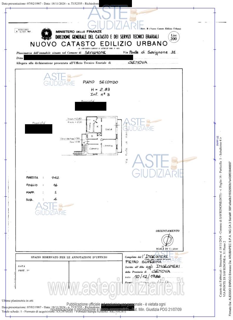 Vendita in attesa dell'emissione del nuovo bando d'asta. LOTTO UNICO: Comune di Savignone, l'alloggio oggetto di stima è di tipo economico, inserito al pianosecondo di una casa isolata di modeste dimensioni. Nei pressi dell'edificio vi è possibilità di parcheggiareautoveicoli. Gli alloggi che compongono il fabbricato (tre) hanno accesso diretto dall'esterno. Si accede all'alloggio attraverso l'area esterna ed unascala in muratura a cielo aperto. L'appartamento si compone di ingresso/corridoio, bagno, cucina, soggiorno etre camere. Ultimo prezzo base € 42.712,00 (offerta minima € 32.034,00). Giudice Dott. Roberto Braccialini. Professionista delegato alla vendita Dott. Fabrizio Vigo - Email "fvigo@studiovigo.eu"; Tel. 010540929. Custode Giudiziario Dott. Sovemo Srl - Email "IMMOBILIARE@SOVEMO.COM"; Tel. 0105299253. Rif. Tribunale di Genova - Espropriazione immobiliare (cartabia) n. 331/2024