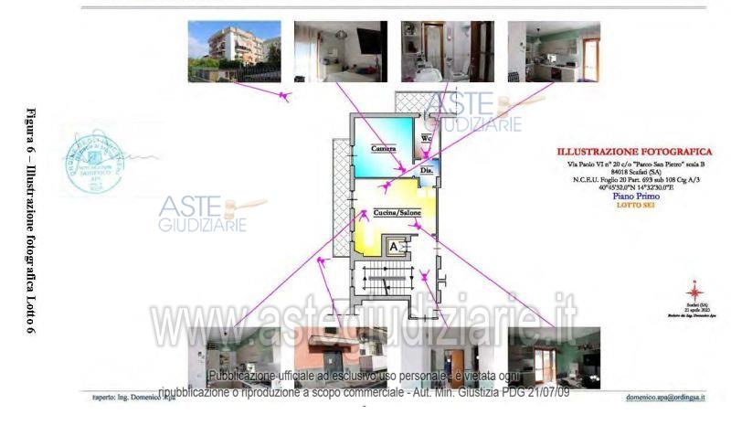 Vendita all'asta Senza incanto, con gara telematica asincrona - LOTTO 6: Piena ed intera proprietà di un Appartamento in condominio, ubicato in Scafati (SA) via Paolo VI, n.20, scala B, Piano Primo; il bene è composto da una cucina/salone, un disimpegno, una camera da letto matrimoniale, un bagno e due balconi. L’altezza interna è di mt 2,75, ha una superficie calpestabile pari a mq 46,00 e superficie balconi di mq 12,50. Prezzo base € 70.082,50 (offerta minima € 52.562,00). Data inizio operazioni di vendita: 05/06/2026 ore 16:00. Professionista delegato alla vendita Avv. Giuseppina Parrilli. Custode Giudiziario Avv. Giuseppina Parrilli - Email "g.parrilli@studiolegaleparrilli.it"; Cell. 3393418155. Rif. Tribunale di Nocera Inferiore - Esecuzione immobiliare post legge 80 n. 87/2009