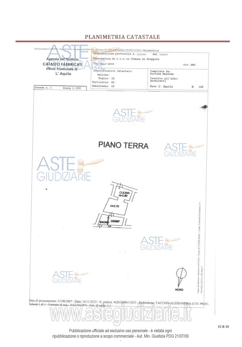 Vendita all'asta Senza incanto - LOTTO UNICO: Porzione di fabbricato sito in Scoppito, Via dell’Arco (AQ) censito all’NCEU al Fg. 15 particella 40 sub 16, categoria A/3, piano T. L’immobile viene posto in vendita per i diritti di proprietà pari ad 1/1. Prezzo base € 14.374,00 (offerta minima € 10.781,00). Data vendita 29/01/2026 ore 16:30. Giudice Maura Manzi. Professionista delegato alla vendita Avv. Cristiana Burgamazzi - Email "cribur@tiscali.it"; Cell. 348-2921304. Custode Giudiziario Dott. Istituto Vendite Giudiziarie Abruzzo - Email "ivgavezzano@gmail.com"; Cell. 3285943787-366467037; Tel. 0863-1940168. Rif. Tribunale di L'Aquila - Esecuzione immobiliare post legge 80 n. 47/2022