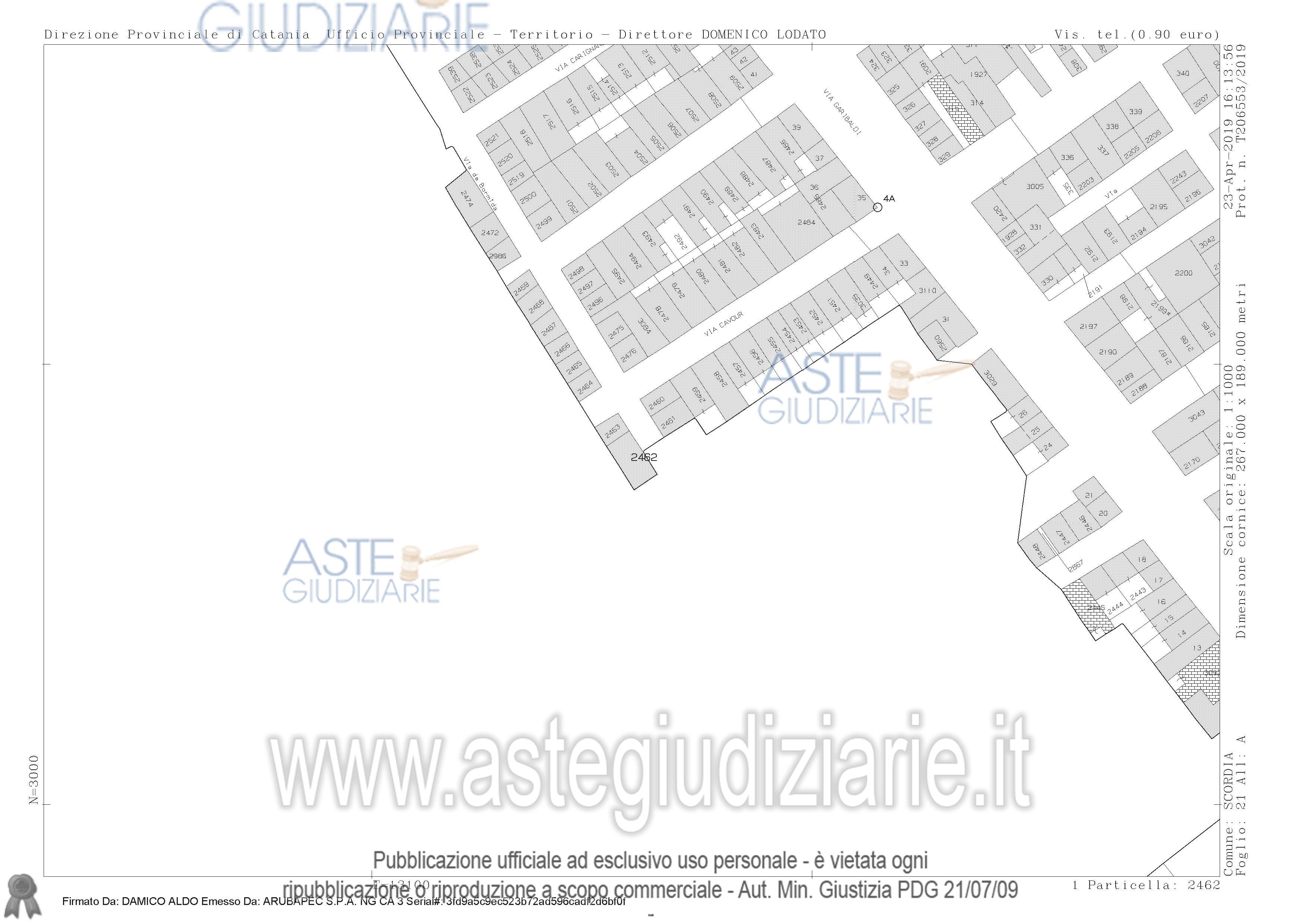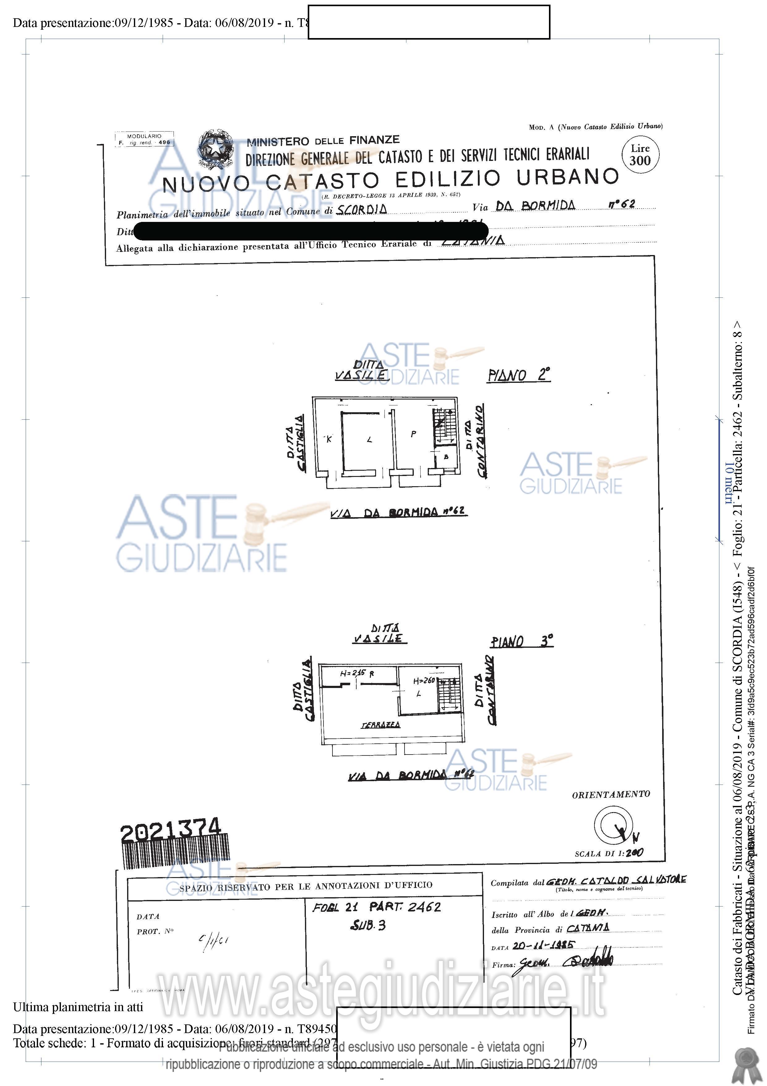 Vendita all'asta Senza incanto, con gara telematica sincrona mista - LOTTO UNICO: Immobile residenziale sito in Scordia (CT), via Dabormida n. 62, ai piani secondo e terzo di un edificio plurifamiliare, costituito da tre vani più disimpegno e bagno al piano secondo, per complessivi 56 mq circa calpestabili più balconi, e da un vano più servizio al piano terzo per circa 31 mq utili e ampia terrazza coperta di 38 mq circa e balcone, censito al N.C.E.U. del Comune di Scordia al Foglio 21, p.lla 2462 sub 8, piano secondo e terzo, Cat. A/3, classe 6, vani 5, superficie catastale totale 108 mq. Prezzo base € 22.219,00 (offerta minima € 16.664,25). Data vendita 06/11/2025 ore 17:00. Professionista delegato alla vendita Avv. Giuseppe Rota - Email "rota.giuseppe@tiscali.it"; Cell. 3473690385; Tel. 0933942899. Custode Giudiziario Avv. Giuseppe Rota - Email "rota.giuseppe@tiscali.it"; Cell. 3473690385; Tel. 0933942899. Rif. Tribunale di Caltagirone - Esecuzione immobiliare post legge 80 n. 40/2018