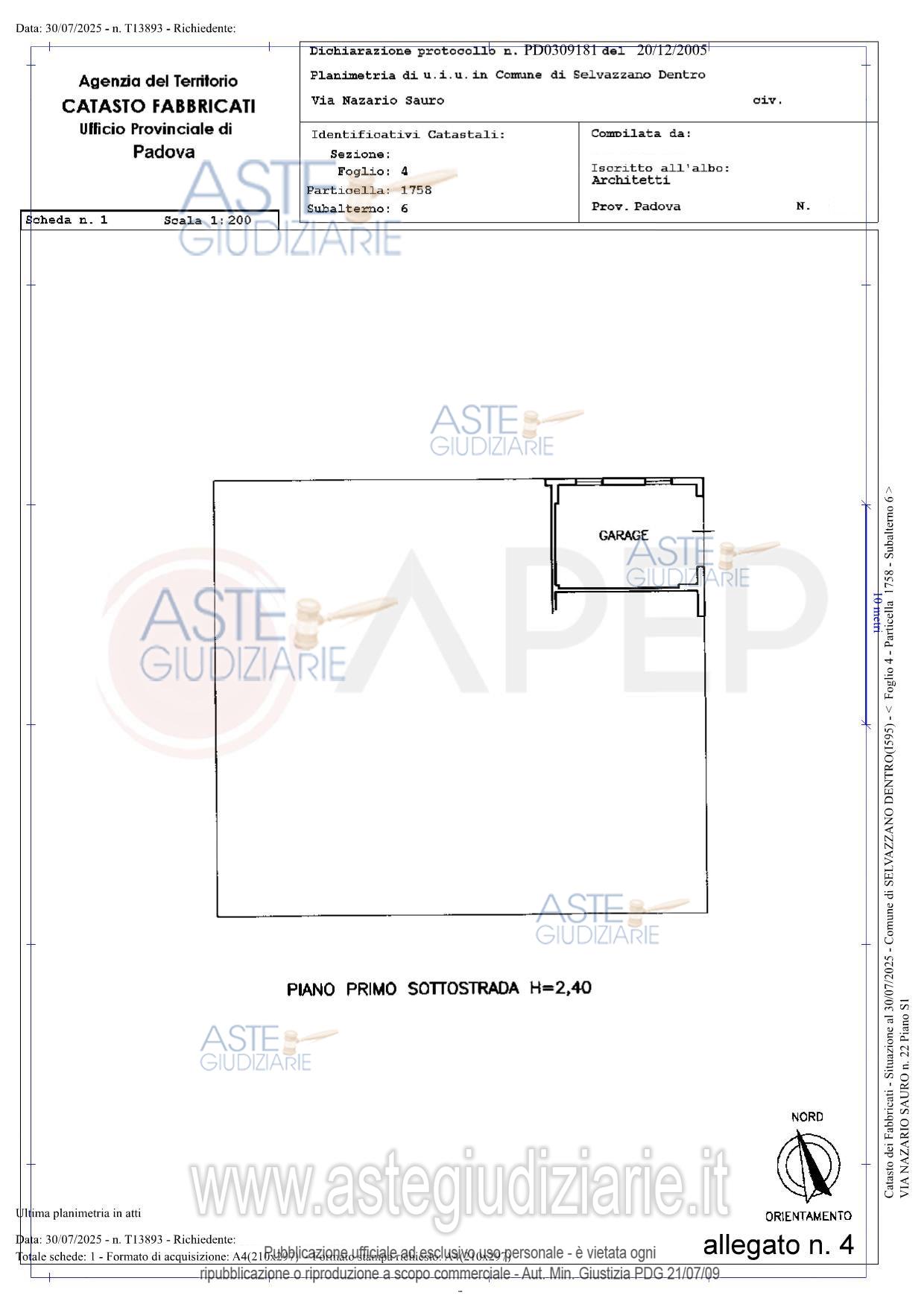 Vendita all'asta Senza incanto, con gara telematica sincrona - LOTTO UNICO: Lotto Unico - piena proprietà di unità immobiliari facenti parte del fabbricato condominiale, denominato "Condominio Laura", sito in Comune di Selvazzano Dentro (PD), Via Nazario Sauro n. 22, edificato unitamente ad altro edificio e precisamente l'appartamento al piano primo, esposizione lati nord ed est con soffitta al piano secondo e garage al piano primo sottostrada, per una superficie commerciale complessiva di mq. 163. Occupato dal debitore. Prezzo base € 209.000,00 (offerta minima € 156.750,00). Data vendita 25/06/2026 ore 10:45. Giudice Pasqualetto.