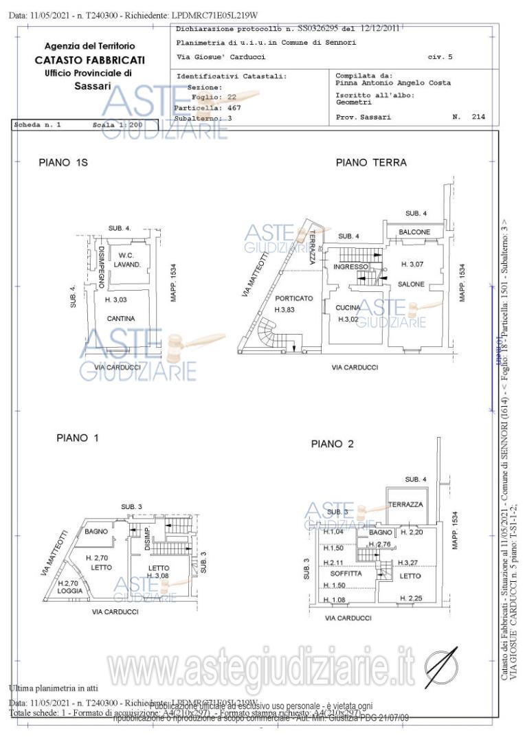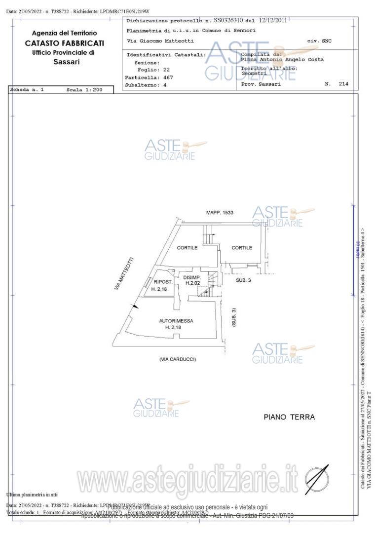 Vendita all'asta Senza incanto - LOTTO UNICO: Diritto: Piena Proprietà Occupato senza titolo opponibilePalazzina residenziale indipendente, dislocata su tre livelli di piano ed un secondo interrato a destinazione garage e cantina, cortile.Dati Catastali: NCEU del Comune di Sennori (SS):- Foglio 18, Mappale 1501, Sub 3, Cat. A/3, Classe 2, Consistenza 9, Sup. Cat. 241 mq, Rendita catastale € 511,29, Piani: T-S1-1-2.- Foglio 18, Mappale 1501, Sub 4, Cat. C/6, Classe 2, Consistenza 57, Sup. Cat. 69 mq, Rendita catastale € 129,53, Piani: T. Prezzo base € 42.412,03 (offerta minima € 31.809,02). Data vendita 16/04/2026 ore 10:00. Giudice Claudia Manconi. Professionista delegato alla vendita Avv. Margherita Angius - Email "avvmargheritaangius@libero.it"; Tel. 0792006660. Custode Giudiziario Istituto Vendite Giudiziarie Sassari - Email "visitaivgsassari@gmail.com"; Tel. 079260228. Rif. Tribunale di Sassari - Esecuzione immobiliare post legge 80 n. 87/2018
