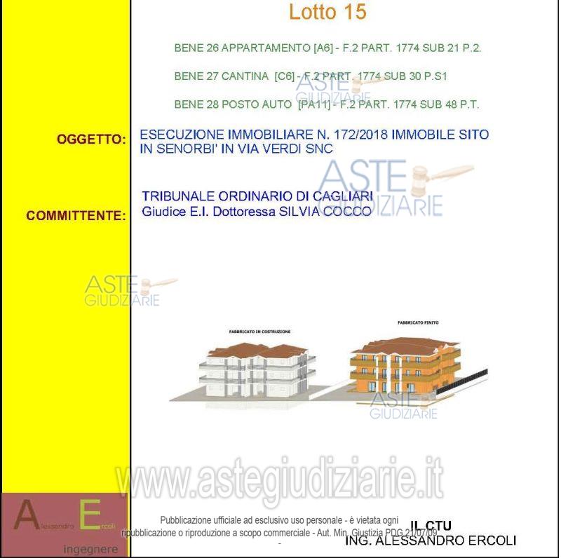 Vendita all'asta Senza incanto, con gara telematica asincrona - LOTTO 15: Quota pari all’intero del diritto di proprietà dell’unità immobiliare composta da abitazione al piano secondo del fabbricato in Via Giuseppe Verdi, Edificio A, interno 9, cantina al piano seminterrato e posto auto al piano terra. Prezzo base € 74.400,00 (offerta minima € 55.800,00). Data inizio operazioni di vendita: 13/02/2026 ore 11:00. Giudice Silvia Cocco. Professionista delegato alla vendita Dott. Antonio Garau - Email "ufficiouniconotai@pec.it"; Tel. 07060222574. Custode Giudiziario Ivg Cagliari - Email "ivg.visiteimmobili@tiscali.it"; Tel. 0702299036. Rif. Tribunale di Cagliari - Esecuzione immobiliare post legge 80 n. 172/2018