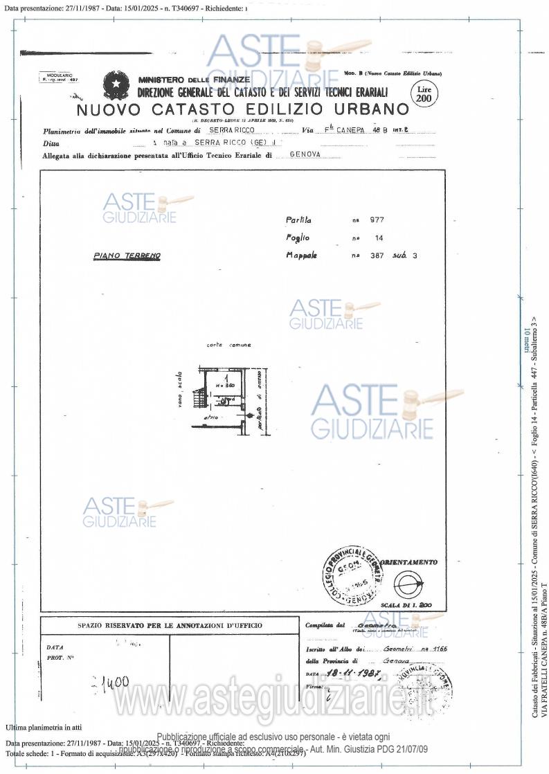 Vendita all'asta Senza incanto, con gara telematica sincrona mista - LOTTO 15: PIENA PROPRIETA' DI MONOLOCALE AD USO ABITAZIONE A SERRA RICCO' (GE) IN VIA FRATELLI CANEPA CIV. 48 A AL PIANO TERRA, COMPOSTO DA UN LOCALE CON ANNESSO ANGOLO COTTURA E BAGNO. SUPERFICIE CATASTALE 19 MQ. CLASSE ENERGETICA F. Prezzo base € 11.695,00 (offerta minima € 8.771,25). Data vendita 10/12/2025 ore 12:00. Professionista delegato alla vendita Avv. Elio Sbisa - Email "elio.sbisa1@gmail.com"; Cell. 3395666960. Custode Giudiziario Ivg Sovemo Srl - Email "visitegenova@sovemo.com"; Tel. 0105299253. Rif. Tribunale di Genova - Esecuzione immobiliare post legge 80 n. 520/2024