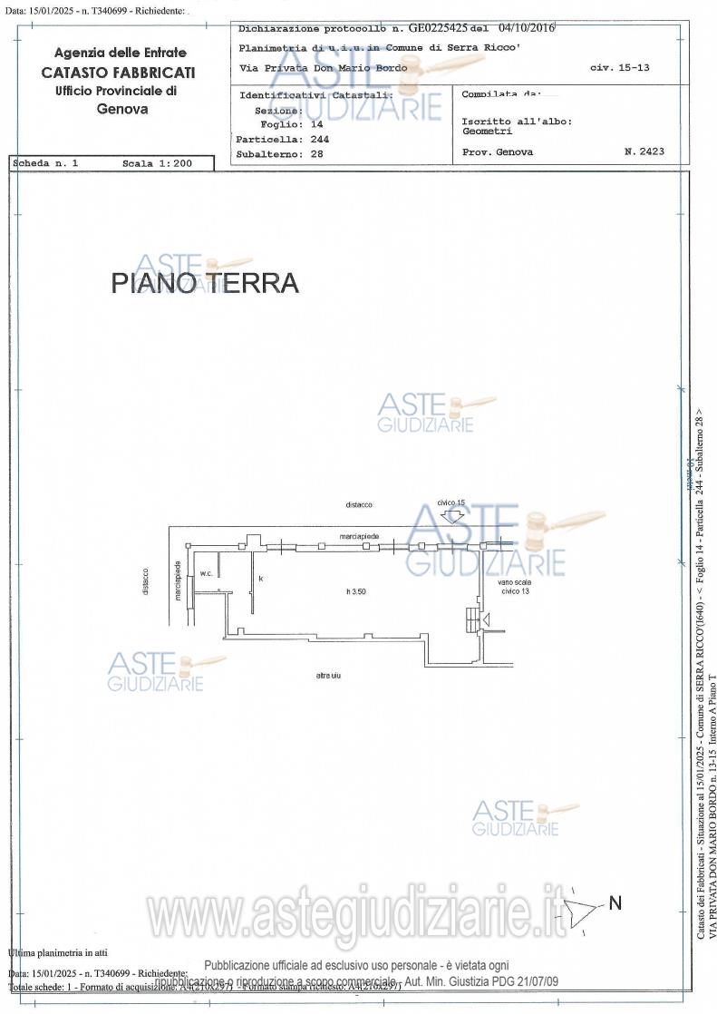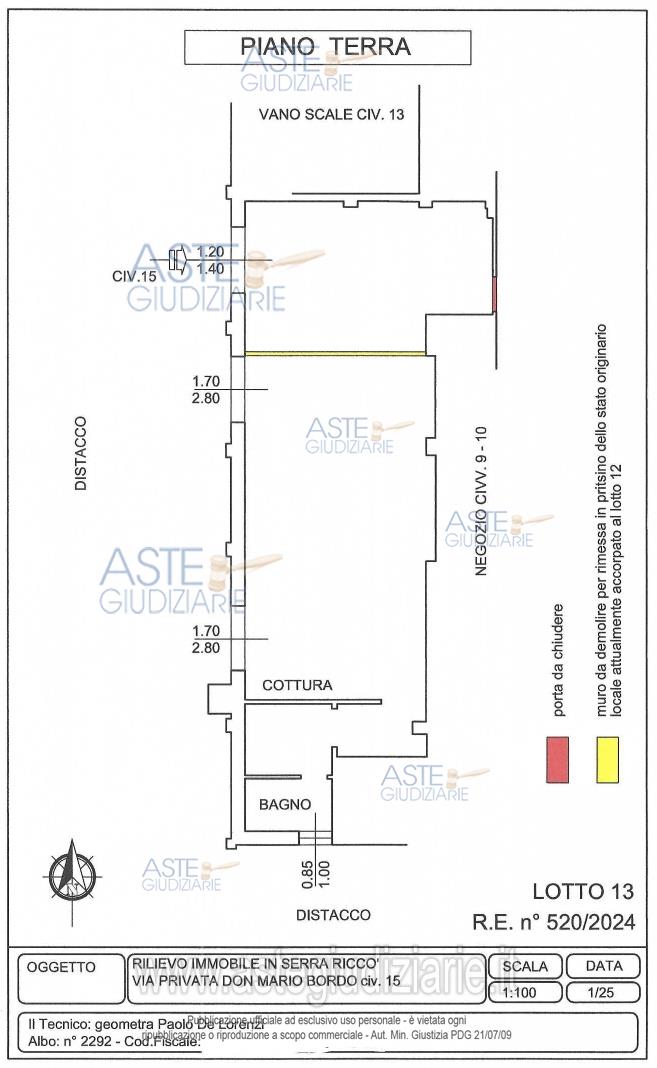Vendita all'asta Senza incanto, con gara telematica sincrona mista - LOTTO 13: PIENA PROPRIETA' DI LOCALE A SERRA RICCO' (GE) IN VIA PRIVATA DON MARIO BORDO 15 AL PIANO TERRA LEGITTIMATO URBANISTICAMENTE COME UFFICIO (ACCATASTATO COME ABITAZIONE CAT. A/3), COMPOSTO DA UN OPEN SPACE CON ANNESSO BAGNO. SUPERFICIE CATASTALE 89 MQ. CLASSE ENERGETICA F. Prezzo base € 29.279,00 (offerta minima € 21.959,25). Data vendita 10/12/2025 ore 12:00. Professionista delegato alla vendita Avv. Elio Sbisa - Email "elio.sbisa1@gmail.com"; Cell. 3395666960. Custode Giudiziario Ivg Sovemo Srl - Email "visitegenova@sovemo.com"; Tel. 0105299253. Rif. Tribunale di Genova - Esecuzione immobiliare post legge 80 n. 520/2024
