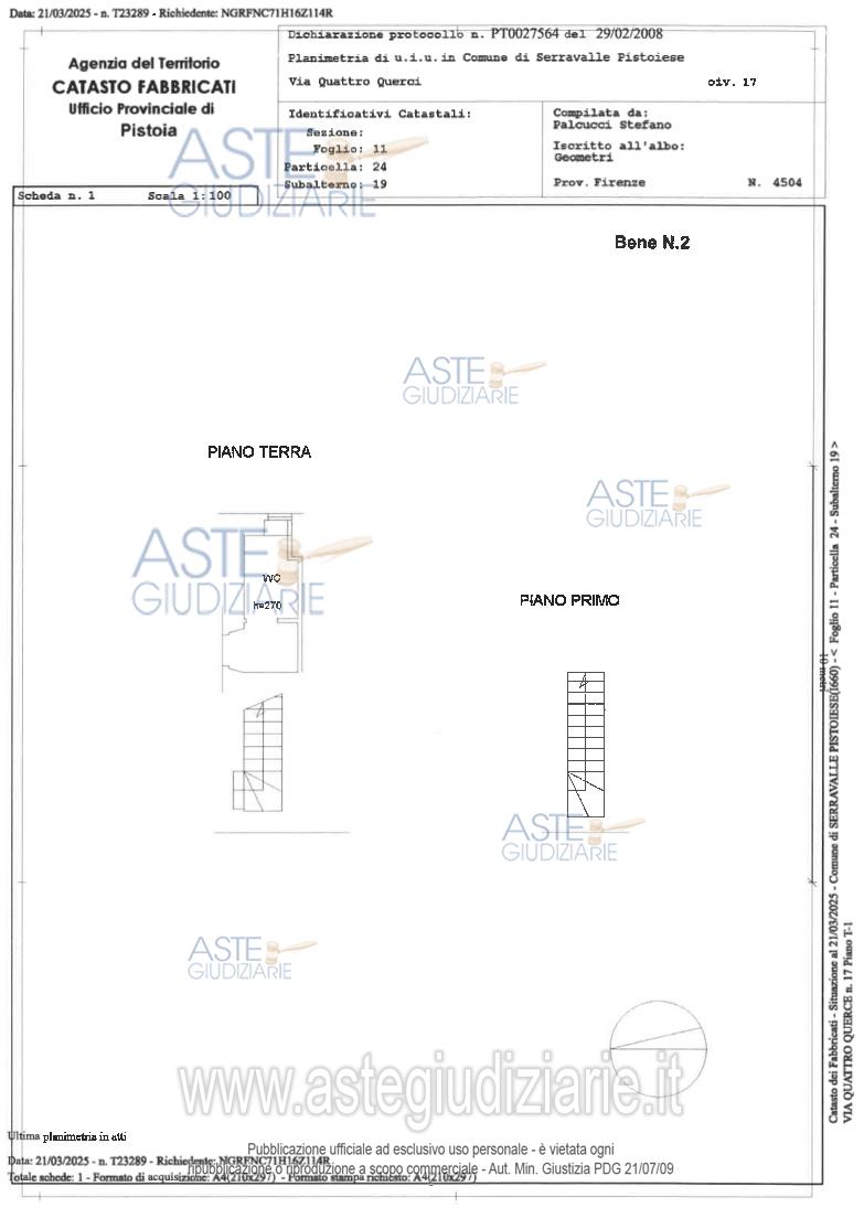 Vendita all'asta Senza incanto, con gara telematica asincrona - LOTTO 1: Lotto 1 oggetto della procedura n. 99/2019 R.E. a cui è riunita la n. 143/2024 R.E. Composto dai seguenti beni: Bene n. 1 - Appartamento piano T-1 (proprietà 1/1); Bene n. 2 - Porzione d'immobile a completamento del Bene 1 (w.c. e scale interne - proprietà 1/1) ; Bene n. 3 - Corte o resede (proprietà 1/2). Prezzo base € 73.000,00 (offerta minima € 54.750,00). Data inizio operazioni di vendita: 29/05/2026 ore 10:00. Giudice Dott. Nicoletta Maria Caterina Curci. Professionista delegato alla vendita Avv. Silvia Vignolini - Email "vignolinis@studiozogheri.it"; Tel. 0573977566. Custode Giudiziario Isveg - Email "prenota.pt@isveg.it". Rif. Tribunale di Pistoia - Esecuzione immobiliare post legge 80 n. 50/2021