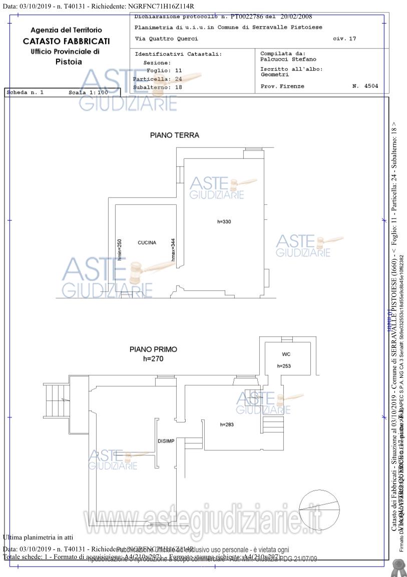 Vendita all'asta Senza incanto, con gara telematica asincrona - LOTTO 1: Lotto 1 oggetto della procedura n. 99/2019 R.E. a cui è riunita la n. 143/2024 R.E. Composto dai seguenti beni: Bene n. 1 - Appartamento piano T-1 (proprietà 1/1); Bene n. 2 - Porzione d'immobile a completamento del Bene 1 (w.c. e scale interne - proprietà 1/1) ; Bene n. 3 - Corte o resede (proprietà 1/2). Prezzo base € 97.000,00 (offerta minima € 72.750,00). Data inizio operazioni di vendita: 11/02/2026 ore 10:00. Giudice Nicoletta Maria Caterina Curci. Professionista delegato alla vendita Avv. Silvia Vignolini - Email "vignolinis@studiozogheri.it"; Tel. 0573977566. Custode Giudiziario Isveg - Email "prenota.pt@isveg.it". Rif. Tribunale di Pistoia - Esecuzione immobiliare post legge 80 n. 50/2021