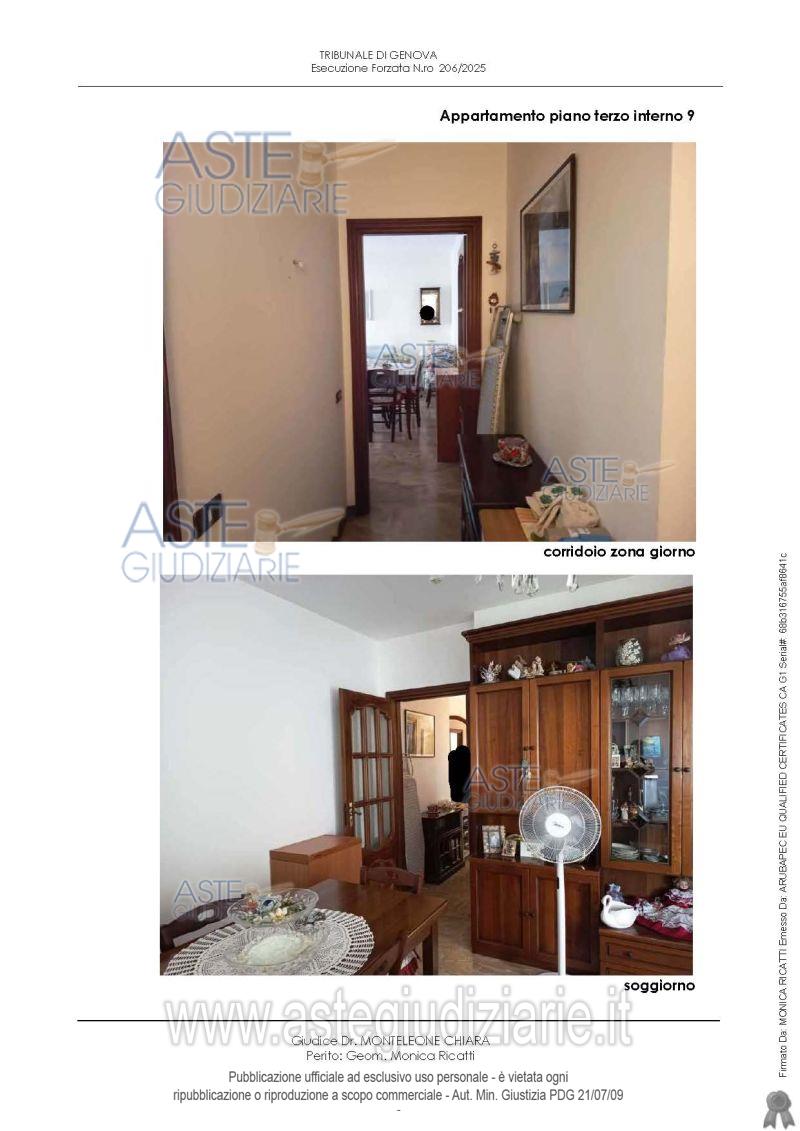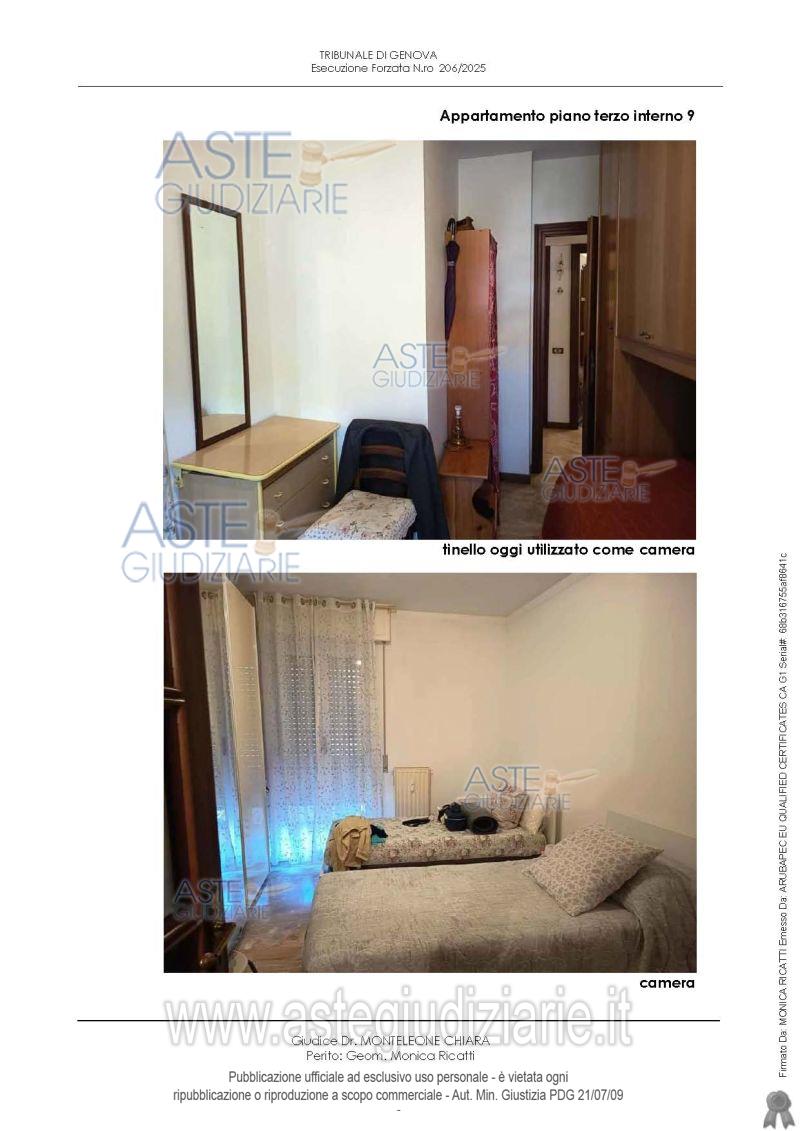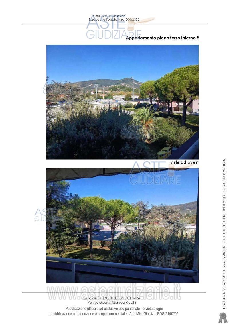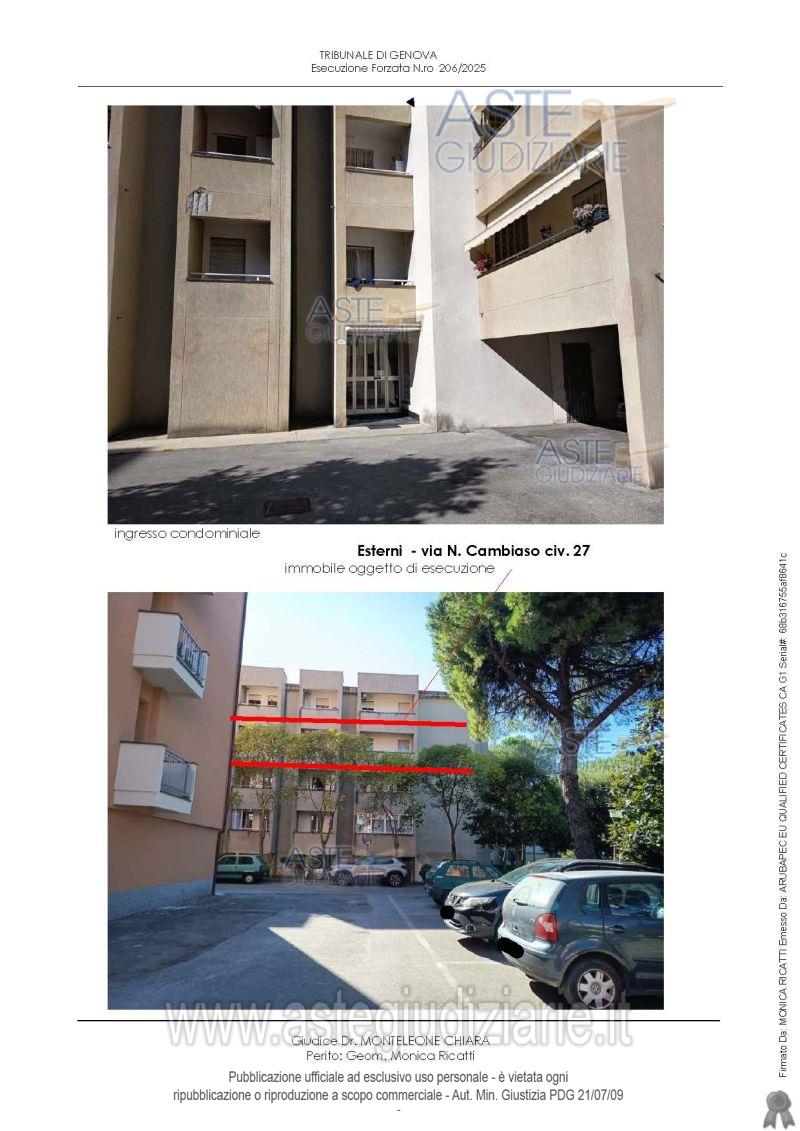 Vendita all'asta Senza incanto, con gara telematica sincrona mista - LOTTO UNICO: Appartamento distinto con int. 9, piano terzo, composto da ingresso, disimpegno, cucina/tinello, soggiorno, due camere, ripostiglio, due bagni e quattro terrazzi, cantina al piano terra, un posto auto nell’area di parcheggio dei fondi. Il fabbricato è dotato di ascensore. L’appartamento è situato nel fabbricato “B” del Condominio LA TECA SECONDA (Via Cambiaso 17-35). Prezzo base € 168.000,00 (offerta minima € 126.000,00). Data vendita 23/04/2026 ore 16:00. Giudice Dott. Chiara Monteleone. Professionista delegato alla vendita Dott. Giuseppe Balza - Email "balza.dott.giuseppe@gmail.com"; Cell. 3396547706; Tel. 3396547706. Custode Giudiziario So.Ve.Mo. Srl - Email "visitegenova@sovemo.com"; Tel. 0105299253. Rif. Tribunale di Genova - Espropriazione immobiliare (cartabia) n. 206/2025
