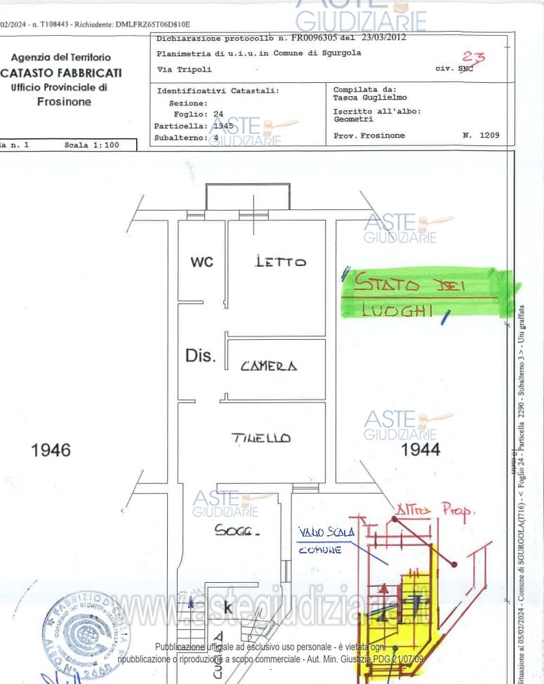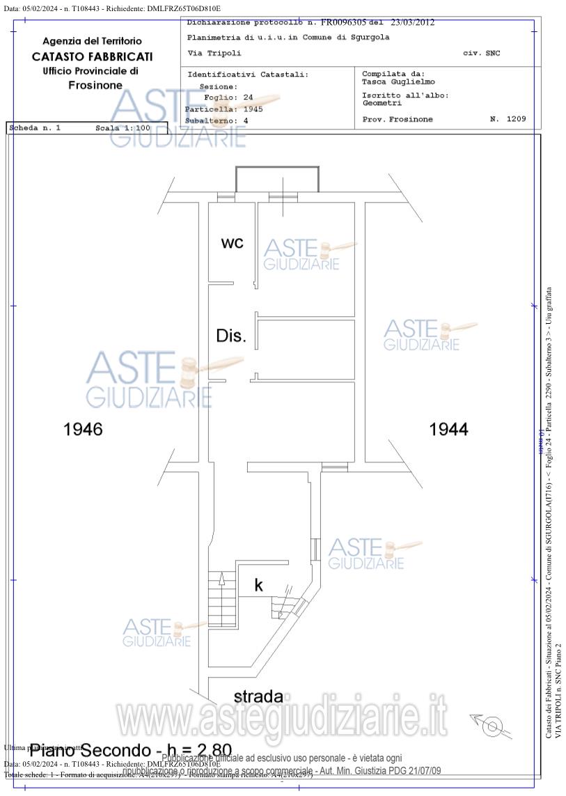 Vendita all'asta Senza incanto, con gara telematica asincrona - LOTTO UNICO: Appartamento ubicato a Sgurgola (FR)-VIA TRIPOLI n. 23, ad uso civile abitazione ai piani 1-2-3 (sottotetto). Identificato al catasto Fabbricati - Foglio 24, Part. 1945, Sub. 4, Cat A4, Graffato con P.lla 2290 SUB 3, composto da 3 piani fuori terra e copertura mista, struttura in muratura, vano scala in marmo con pianerottolo in marmette di graniglia di marmo e portone d'ingresso in legno, a servizio degli appartamenti ai piani 1e 2. L'immobile viene posto in vendita per il diritto di Proprietà (1/1). Prezzo base € 25.312,50 (offerta minima € 18.984,38). Data inizio operazioni di vendita: 05/05/2026 ore 10:00. Professionista delegato alla vendita Avv. Francesca Sibilia - Email "francesca.sibilia@libero.it"; Cell. 3396122419. Custode Giudiziario Avv. Francesca Sibilia - Email "francesca.sibilia@libero.it"; Cell. 3396122419. Rif. Tribunale di Frosinone - Espropriazione immobiliare (cartabia) n. 154/2023