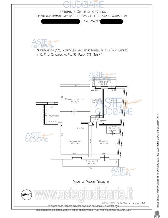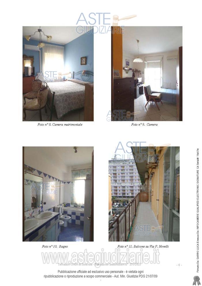 Vendita all'asta Senza incanto, con gara telematica sincrona mista - LOTTO UNICO: Piena proprietà dell’appartamento sito nel Comune di Siracusa in Via Pietro Novelli n° 15, piano 4°, interno 18, composto da ingresso soggiorno, due camere, disimpegno ,cucina e bagno ; Censito nel Catasto Fabbricati del Comune di Siracusa al foglio 33, particella 972, sub 44 (già foglio 33, p.lla 1096, sub 44), categoria A/3, classe 2, rendita Euro 348,61, consistenza 4,5 vani, superficie totale 113 mq, superficie escluse aree scoperte 109 mq. Prezzo base € 46.743,75 (offerta minima € 35.057,82). Data vendita 30/04/2026 ore 12:00. Giudice Maria Cristina Di Stazio. Professionista delegato alla vendita Avv. Sabrina Giuliano - Email "avv.sabrinagiuliano@gmail.com"; Tel. 0931412001. Custode Giudiziario Avv. Sabrina Giuliano - Email "avv.sabrinagiuliano@gmail.com"; Tel. 0931412001. Rif. Tribunale di Siracusa - Esecuzione immobiliare post legge 80 n. 251/2023