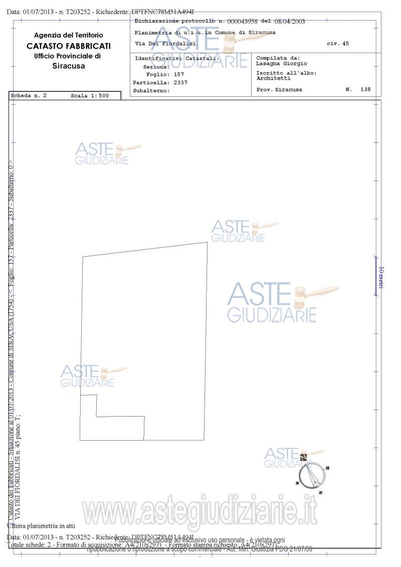 Vendita all'asta Senza incanto - LOTTO UNICO:  Appartamento in Cassibile –Siracusa- Via Dei Fiordalisi,45 Piano terra Cat. A/4  al NCEU foglio 157 p.lla 2337, con terreno di pertinenza di mq. 1936 al Catasto foglio 157 p.lla 2337; . Prezzo base € 24.078,52 (offerta minima € 18.058,89). Data vendita 21/11/2025 ore 10:30. Professionista delegato alla vendita Avv. Antonio Messina - Email "antoniomessina097@gmail.com"; Cell. 3397961479; Tel. 093168236. Custode Giudiziario Avv. Antonio Messina - Email "antoniomessina097@gmail.com"; Cell. 3397961479; Tel. 093168236.  Rif. Tribunale di Siracusa - Esecuzione immobiliare post legge 80 n. 533/2011
