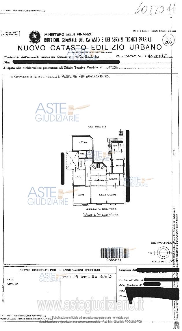 Vendita all'asta Senza incanto, con gara telematica asincrona - LOTTO 11: Piena proprietà per la quota di 1000/1000 di appartamento sito in Supersano (Le), alla via Vittorio Emanuele 119, della superficie commerciale di 185,00 mq. Prezzo base € 68.910,00 (offerta minima € 51.683,00). Data inizio operazioni di vendita: 20/05/2026 ore 09:30. Professionista delegato alla vendita Dott. Alessandro De Rinaldis - Email "alessandroderinaldis@virgilio.it"; Tel. 0832458450. Custode Giudiziario Dott. Alessandro De Rinaldis - Email "alessandroderinaldis@virgilio.it"; Tel. 0832458450. Rif. Tribunale di Lecce - Espropriazione immobiliare (cartabia) n. 315/2023