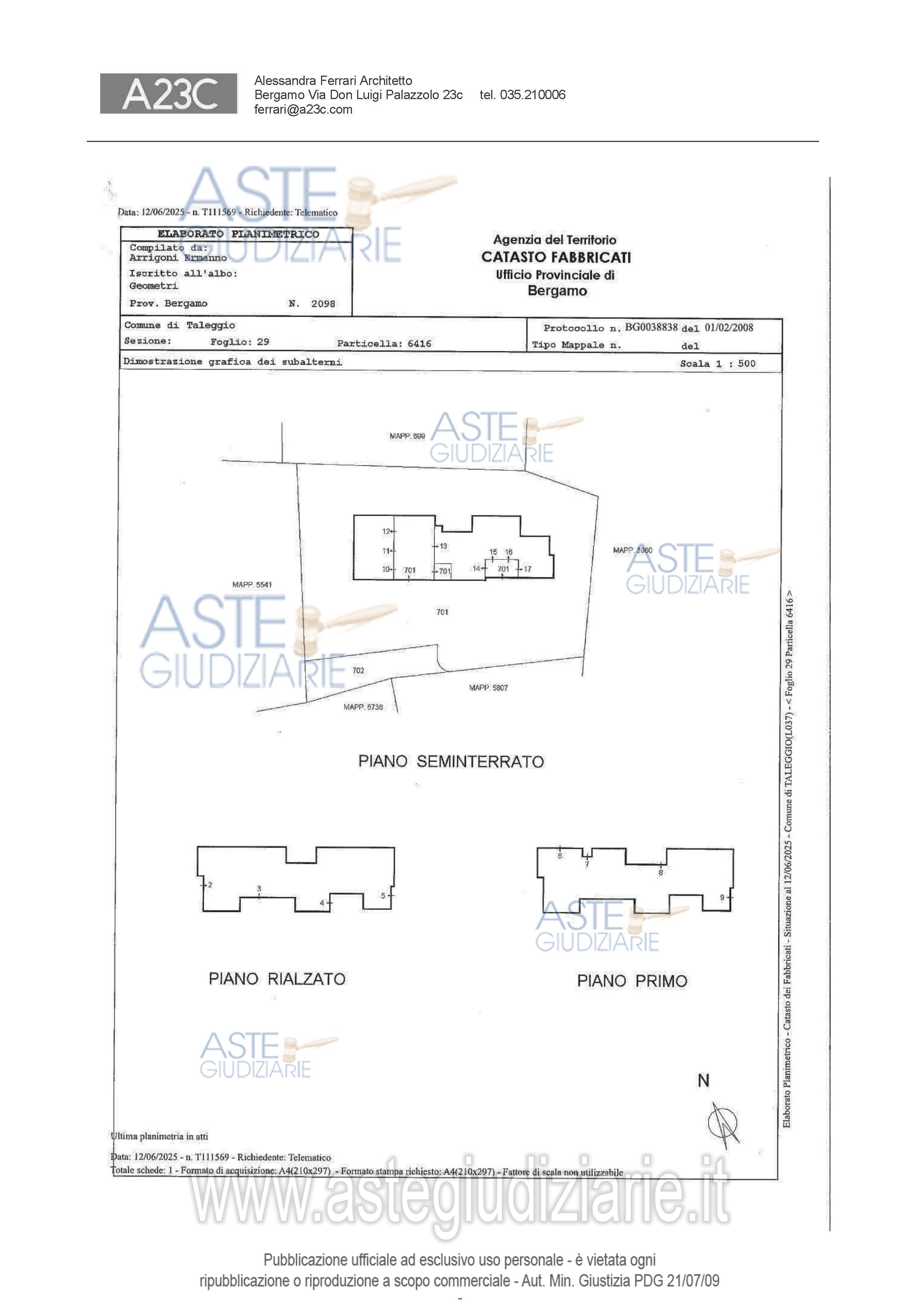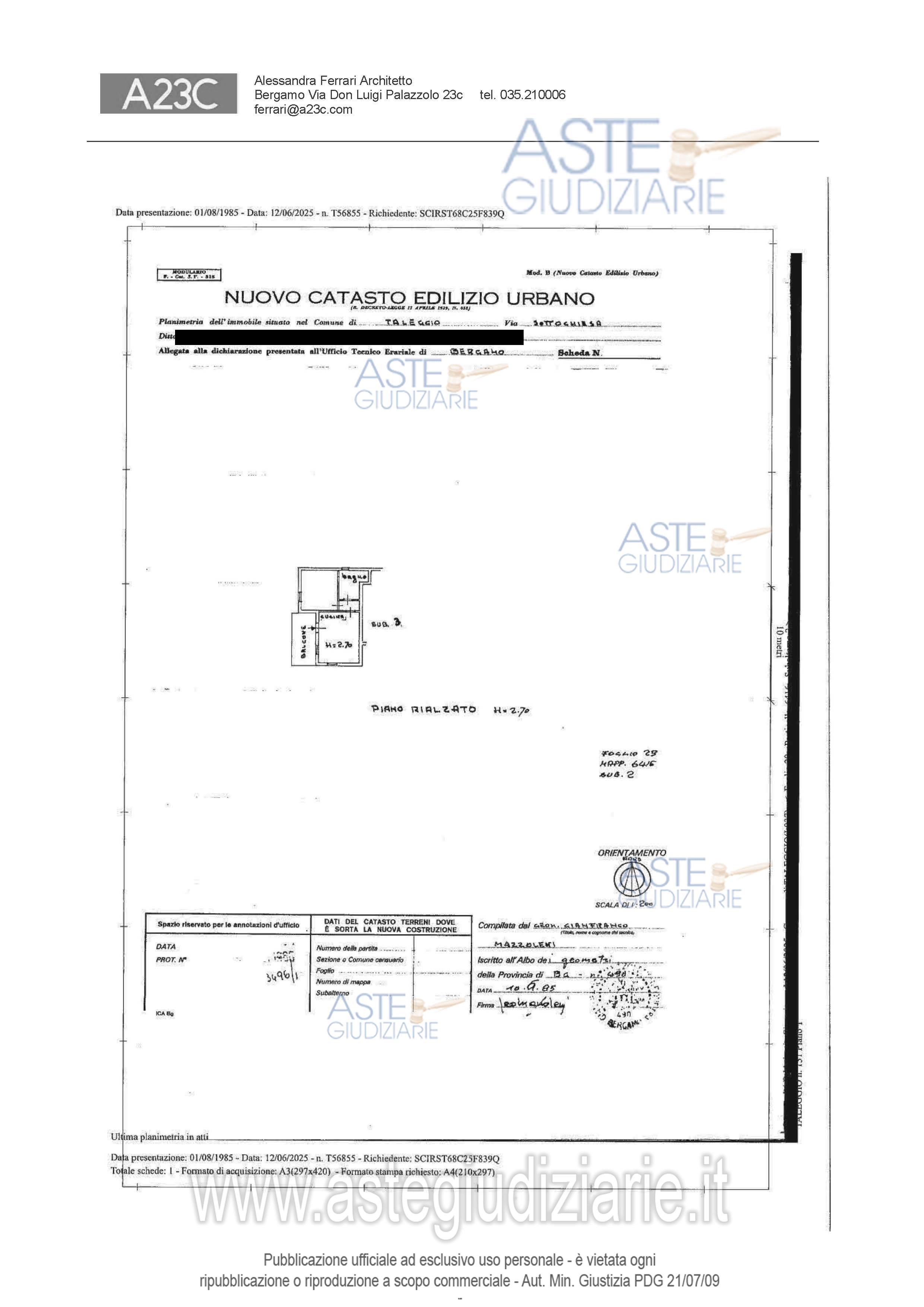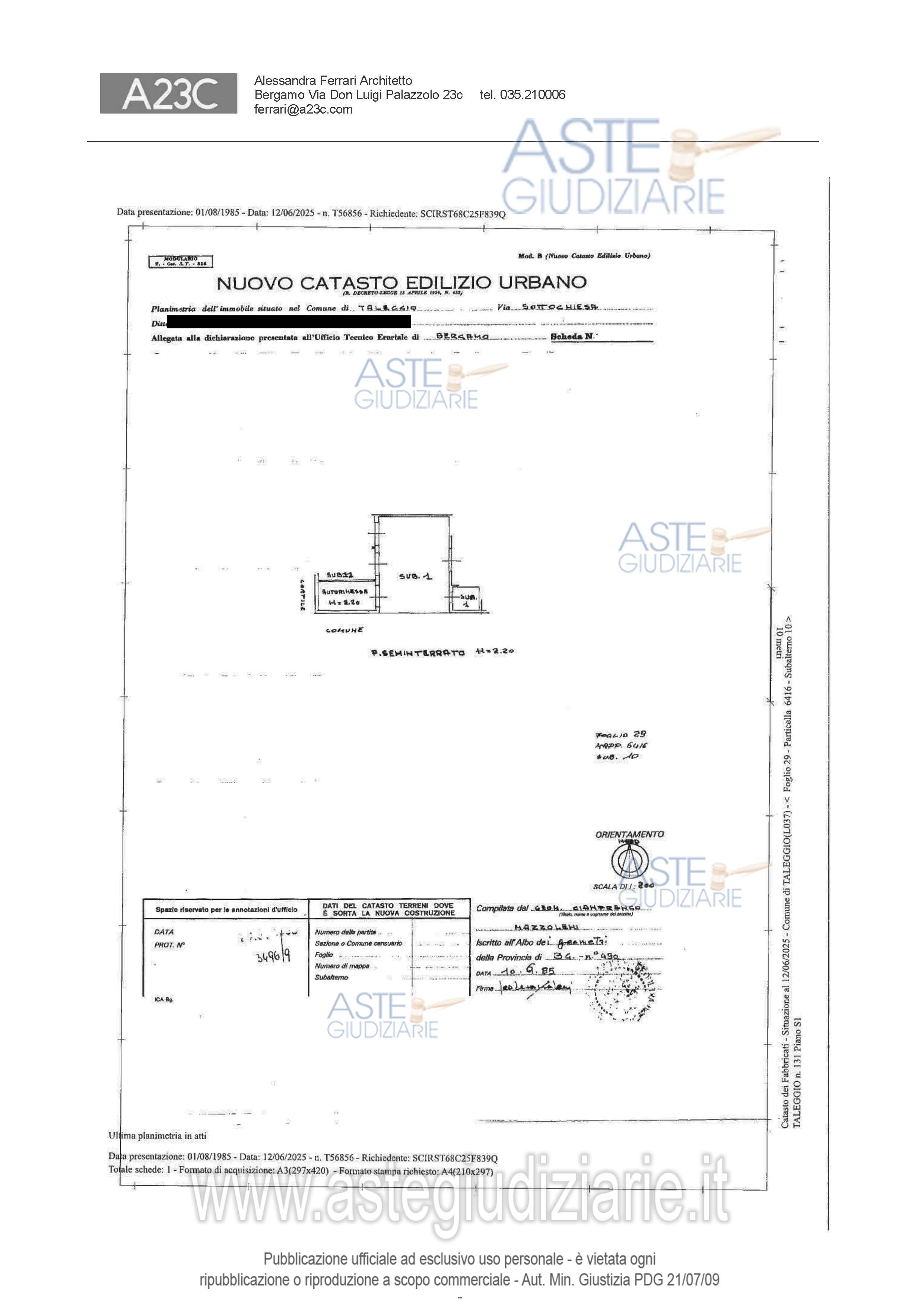 Vendita all'asta Senza incanto, con gara telematica asincrona - LOTTO 001: bilocale di c.a 45 mq lordi (composto da zona cottura e sala, disimpegno, un bagno, una camera) oltre ad un "balcone" ad uso esclusivo di circa 8,60 mq, sito nella fraz. di Sottochiesa del Comune di Taleggio (BG), in via Rognoni civ. 699, posto al piano rialzato di una palazzina di due piani fuori terra e un piano seminterrato, priva di ascensore; box di pertinenza ad uso di autorimessa privata di c.a 16.50 mq lordi collocato al piano seminterrato. Prezzo base € 30.073,27 (offerta minima € 22.554,95). Data inizio operazioni di vendita: 10/06/2026 ore 15:00. Professionista delegato alla vendita Dott. Carla Rinaldi - Email "studiocarlarinaldi@gmail.com"; Cell. 3388128967; Tel. 0345247174. Custode Giudiziario Dott. Carla Rinaldi - Email "studiocarlarinaldi@gmail.com"; Cell. 3388128967; Tel. 0345247174. Rif. Tribunale di Bergamo - Espropriazione immobiliare (cartabia) n. 239/2025