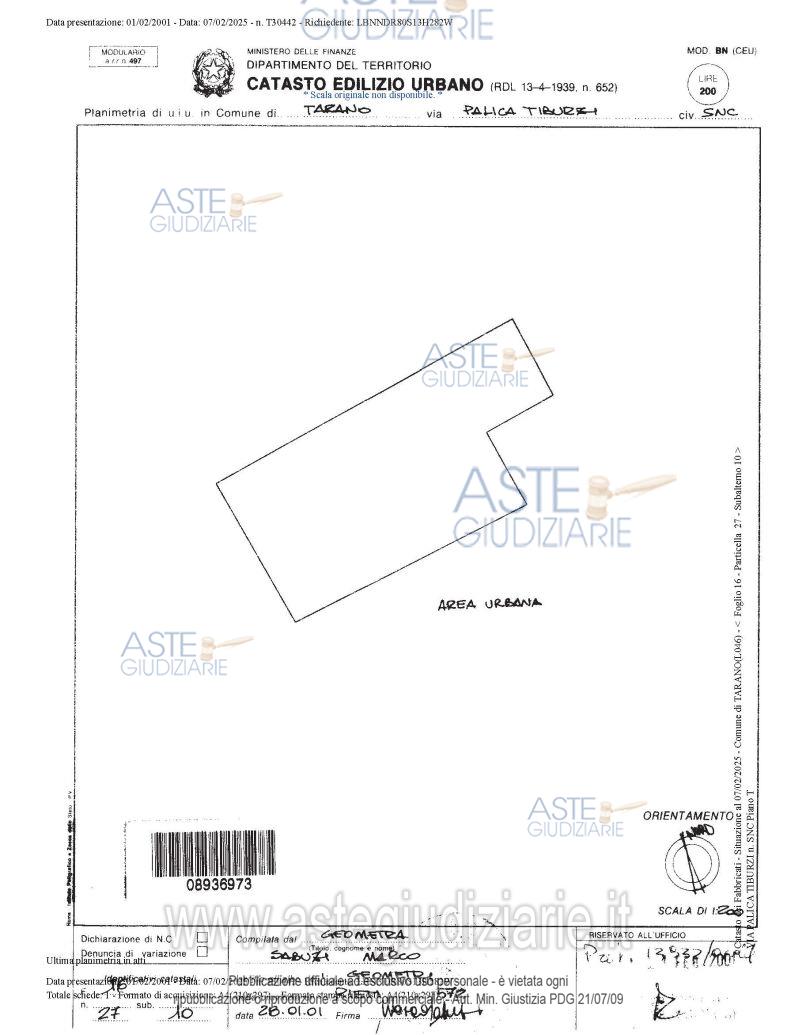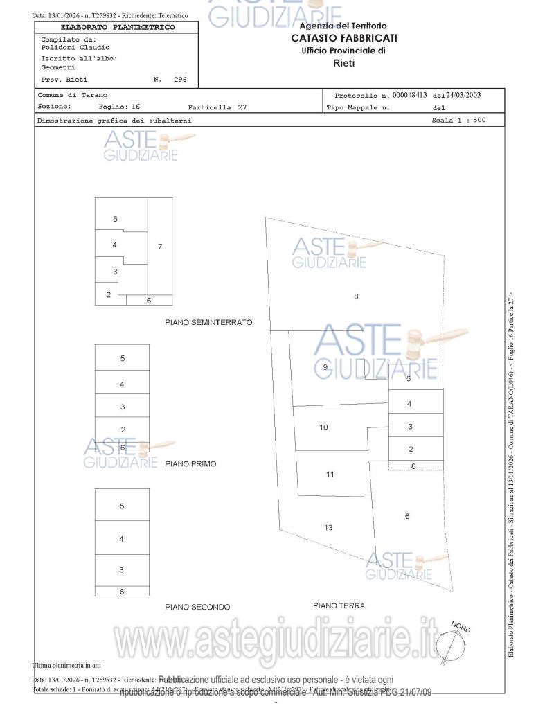Vendita all'asta Senza incanto, con gara telematica asincrona - LOTTO 0: Piena proprietà per la quota di 1000/1000 di immobile residenziale sito nel Comune di Tarano (RI) alla via Palica Tiburzi snc, L'unità immobiliare oggetto di stima si compone di porzione di edificio quadrifamiliare, che si sviluppa su tre livelli comunicanti attraverso scala di interconnesione interna, con annessa corte esclusiva oltre a due locali cantina seminterrati. Prezzo base € 65.211,60 (offerta minima € 48.908,70). Data inizio operazioni di vendita: 17/06/2026 ore 12:45. Giudice: Dott. Marilina Guglielmi.