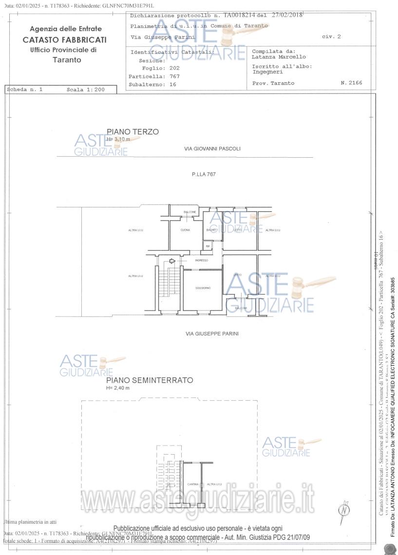 Vendita all'asta Senza incanto, con gara telematica asincrona - LOTTO 1: Appartamento posto al terzo ed ultimo composto da un ingresso/disimpegno, cucina, soggiorno, due vani principali, bagno e un piccolo ripostiglio, oltre cantinola pertinenziale al piano seminterrato. Prezzo base € 28.509,00 (offerta minima € 21.382,00). Data inizio operazioni di vendita: 24/02/2026 ore 16:00. Giudice Andrea Paiano. Professionista delegato alla vendita Avv. Francesca Bommino. Custode Giudiziario Avv. Francesca Bommino - Email "francesca.bommino@legalmail.it"; Cell. 3389359422. Rif. Tribunale di Taranto - Espropriazione immobiliare (cartabia) n. 25/2024
