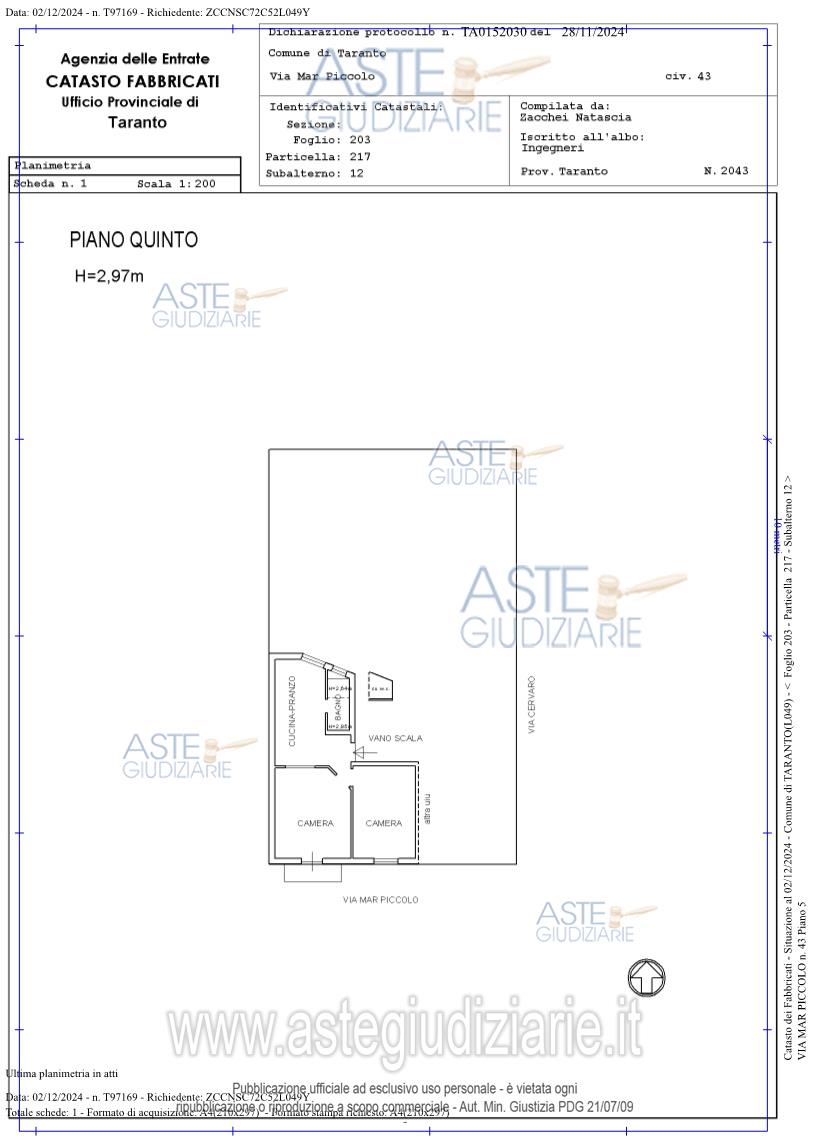 Vendita in attesa dell'emissione del nuovo bando d'asta. LOTTO UNICO: Piena proprietà di appartamento situato nel Comune di Taranto, Quartiere Tamburi, alla via Mar Piccolo n. 43, al quinto piano senza ascensore, composto da ingresso-cucina-pranzo, soggiorno, una camera, un bagno con sovrastante tramezzo e un balcone. Ultimo prezzo base € 26.000,00 (offerta minima € 19.500,00). Professionista delegato alla vendita Avv. Fabiana Miraglia. Custode Giudiziario Avv. Fabiana Miraglia - Email "avvfabianamiraglia@gmail.com". Rif. Tribunale di Taranto - Espropriazione immobiliare (cartabia) n. 3/2024