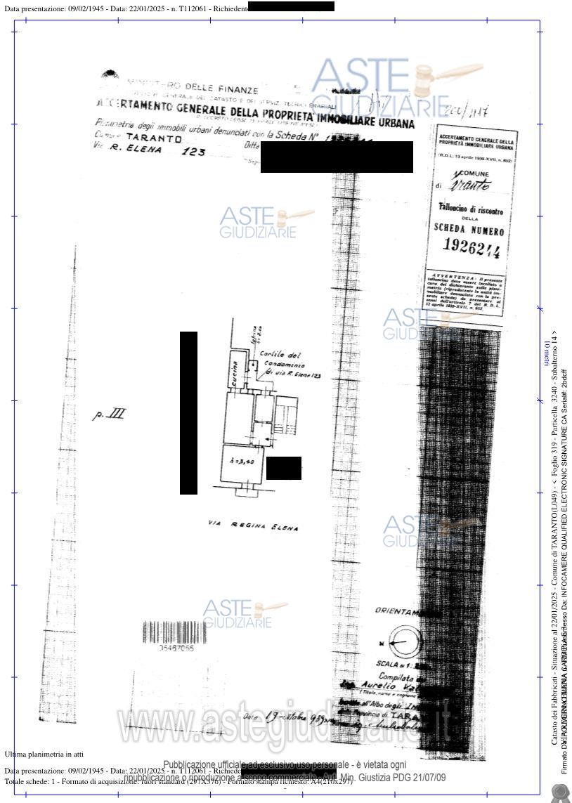 Vendita in attesa dell'emissione del nuovo bando d'asta. LOTTO 1: Appartamento al piano terzo senza ascensore, composto da quattro vani ed accessori con affaccio alla strada e su cortile interno . Ultimo prezzo base € 29.700,00 (offerta minima € 22.275,00). Giudice Andrea Paiano. Professionista delegato alla vendita Avv. Alessandra Giusti - Email "avv.alessandragiusti@gmial.com"; Tel. 099377413. Custode Giudiziario  Ivg Taranto - Email "ivgta.visiteimmobili@gmail.com".  Rif. Tribunale di Taranto - Espropriazione immobiliare (cartabia) n. 266/2024