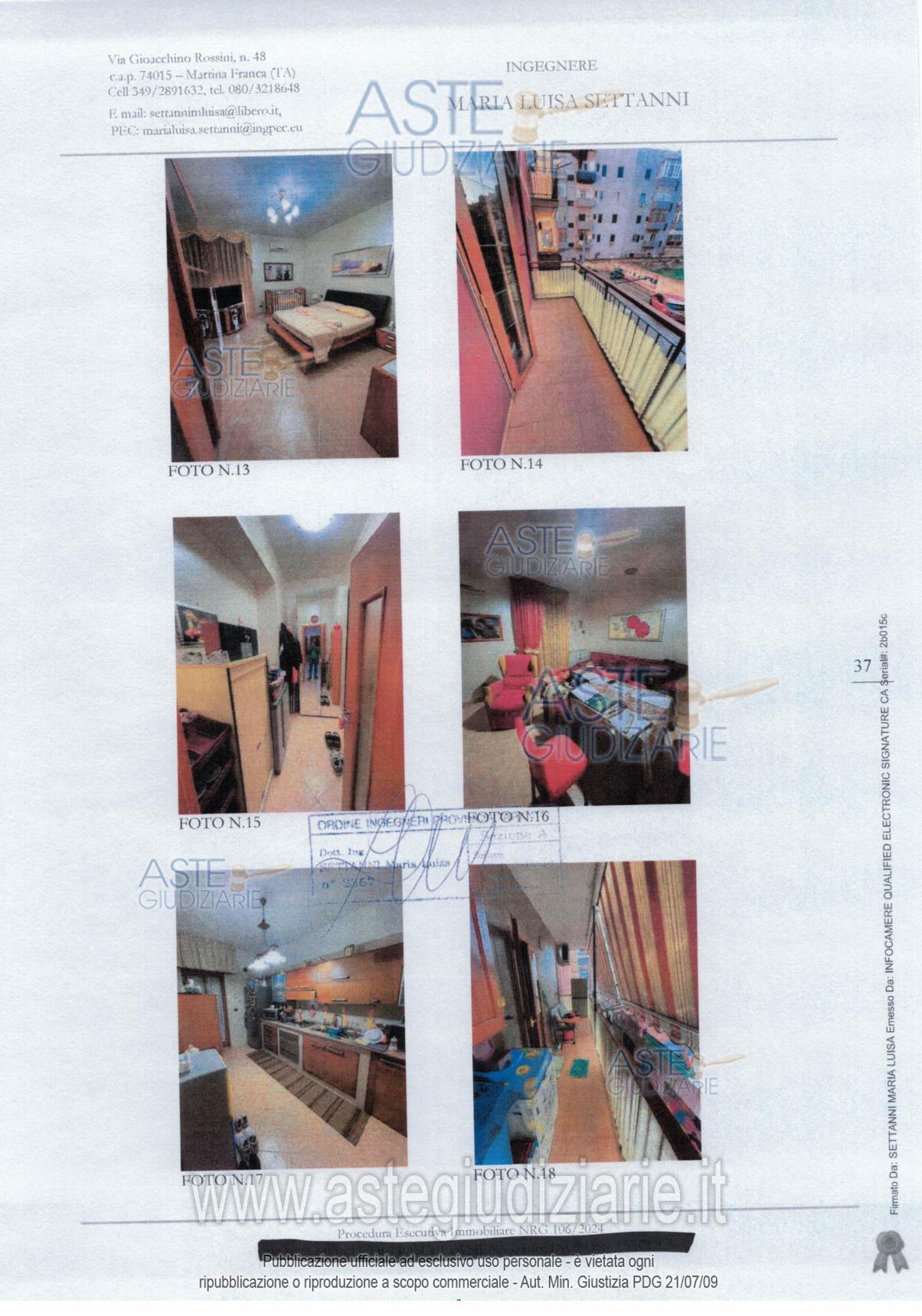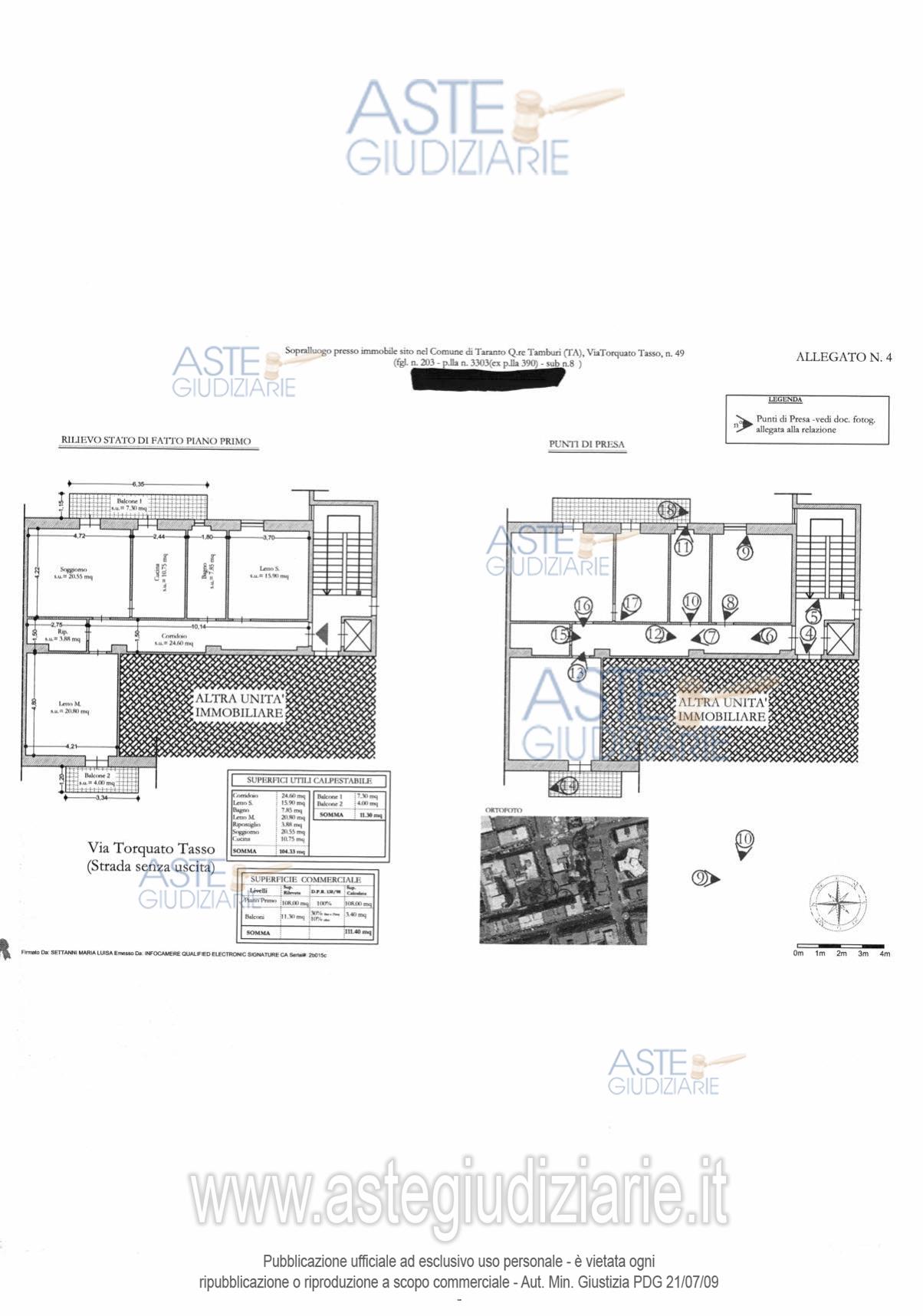 Vendita all'asta Senza incanto, con gara telematica asincrona - LOTTO UNICO: Piena proprietà 1/1 di una abitazione di tipo economico sita nel Comune di Taranto Q.re Tamburi (TA), in Via Torquato Tasso, n. 49, al piano primo, censito al catasto urbano al foglio 203, p.lla 3303 (ex 390), sub. 8., categoria A/3, classe 3, vani 4.5, superficie catastale 106 mq, escluse le aree scoperte, rendita euro 464,81. Prezzo base € 33.750,00 (offerta minima € 25.313,00). Data inizio operazioni di vendita: 01/04/2026 ore 17:00. Giudice Dott. Andrea Paiano. Professionista delegato alla vendita Avv. Cristina Marotta. Custode Giudiziario Ivg Taranto - Email "ivgta.visiteimmobili@gmail.com"; Tel. 0999946442. Rif. Tribunale di Taranto - Espropriazione immobiliare (cartabia) n. 106/2024