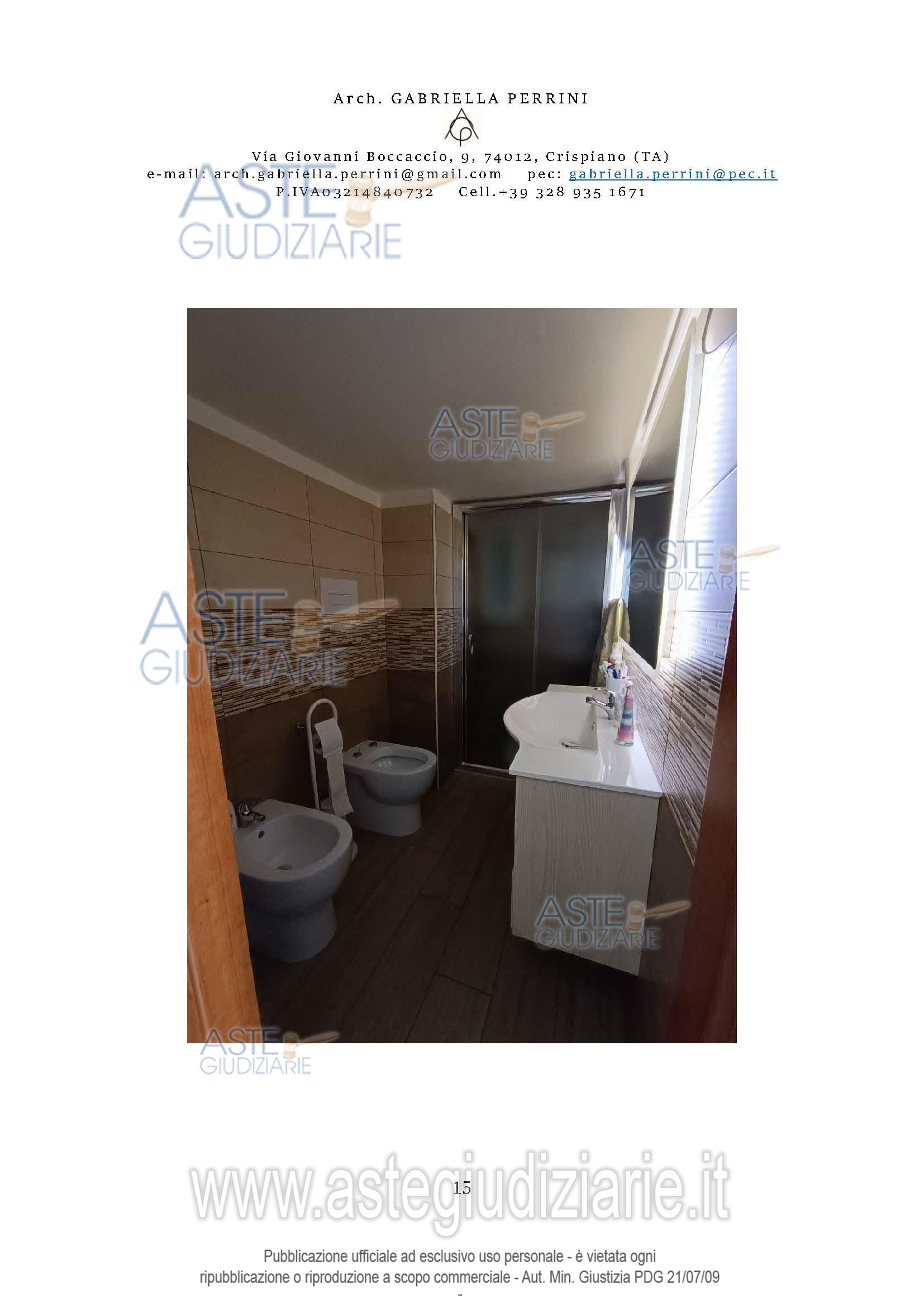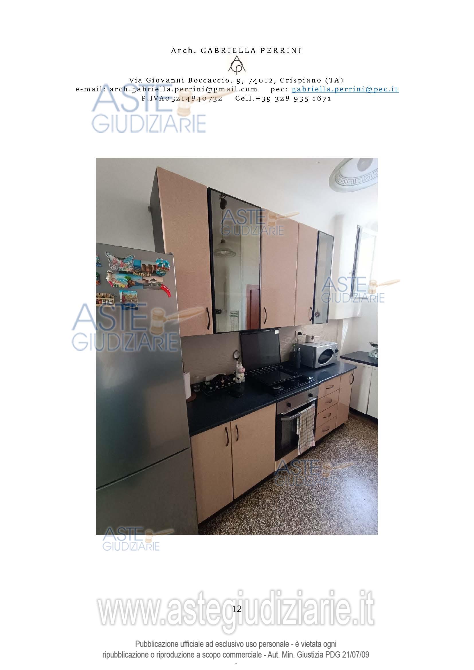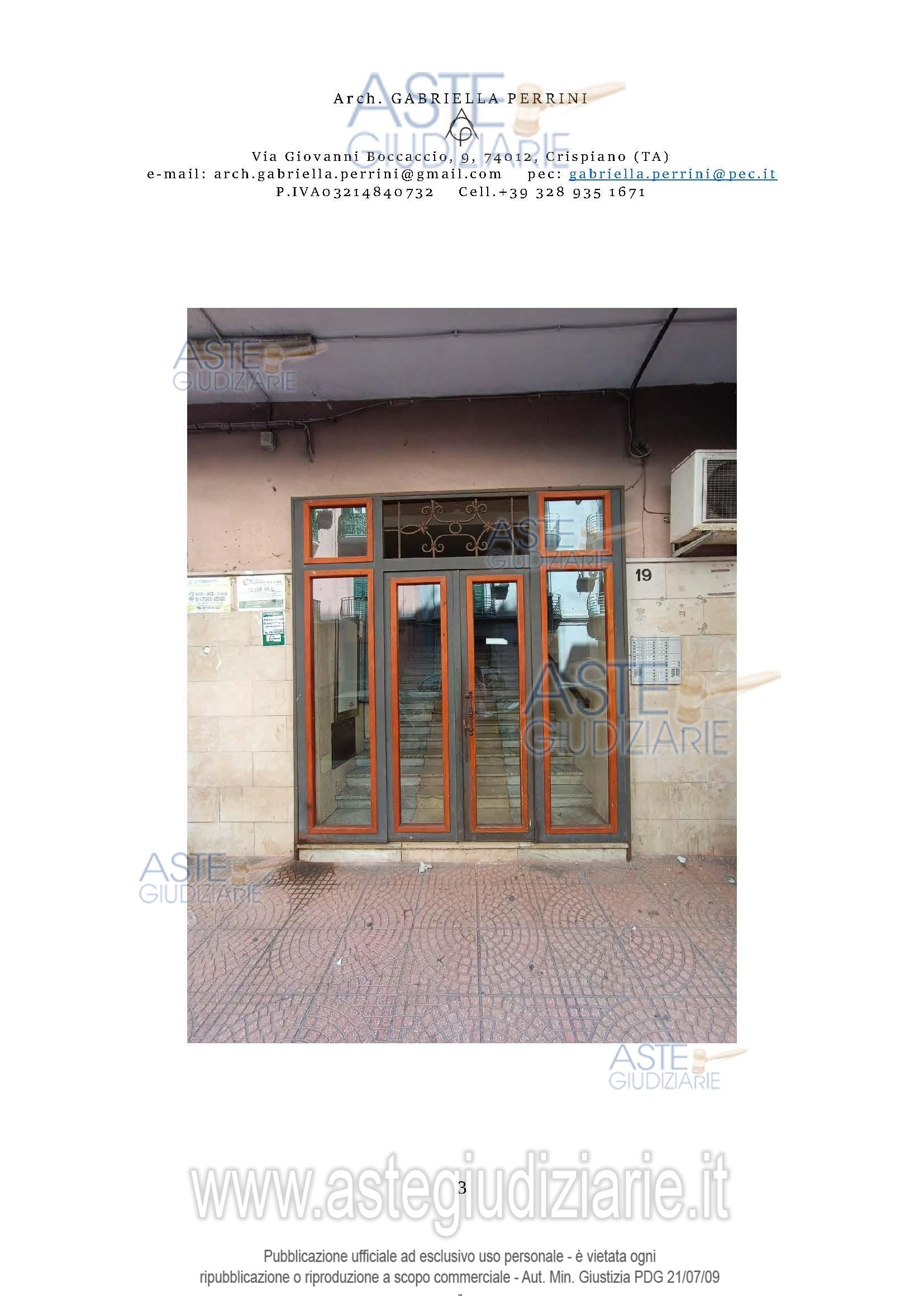 Vendita all'asta Senza incanto, con gara telematica asincrona - LOTTO UNICO: Piena proprietà dell’appartamento composto da corridoio, camera da letto matrimoniale, soggiorno collegato con camera singola, cucina abitabile collegata con servizio igienico. L’appartamento, in condizioni di buona manutenzione è dotato di impianti funzionanti (idrico, elettrico, gas, citofonico, raffrescamento tramite condizionatore); gli ambienti cucina e bagno sono rivestiti totalmente o parzialmente da ceramiche in grès porcellanato, mentre il resto caratterizzato da intonaco civile e pitture lavabili. Prezzo base € 35.250,00 (offerta minima € 26.500,00). Data inizio operazioni di vendita: 10/03/2026 ore 16:00. Giudice Dott. Andrea Paiano. Professionista delegato alla vendita Avv. Anna Francesca Chimienti. Custode Giudiziario Avv. Anna Francesca Chimienti - Email "francesca.chimienti@libero.it"; Cell. 3453002326. Rif. Tribunale di Taranto - Espropriazione immobiliare (cartabia) n. 256/2023