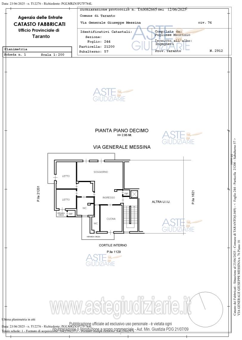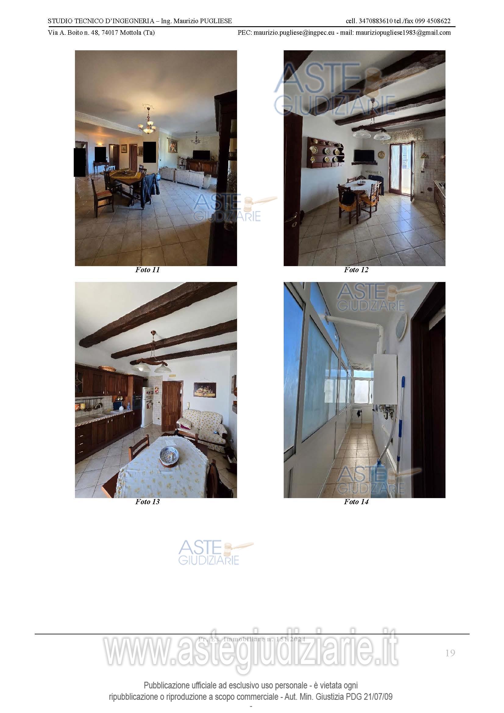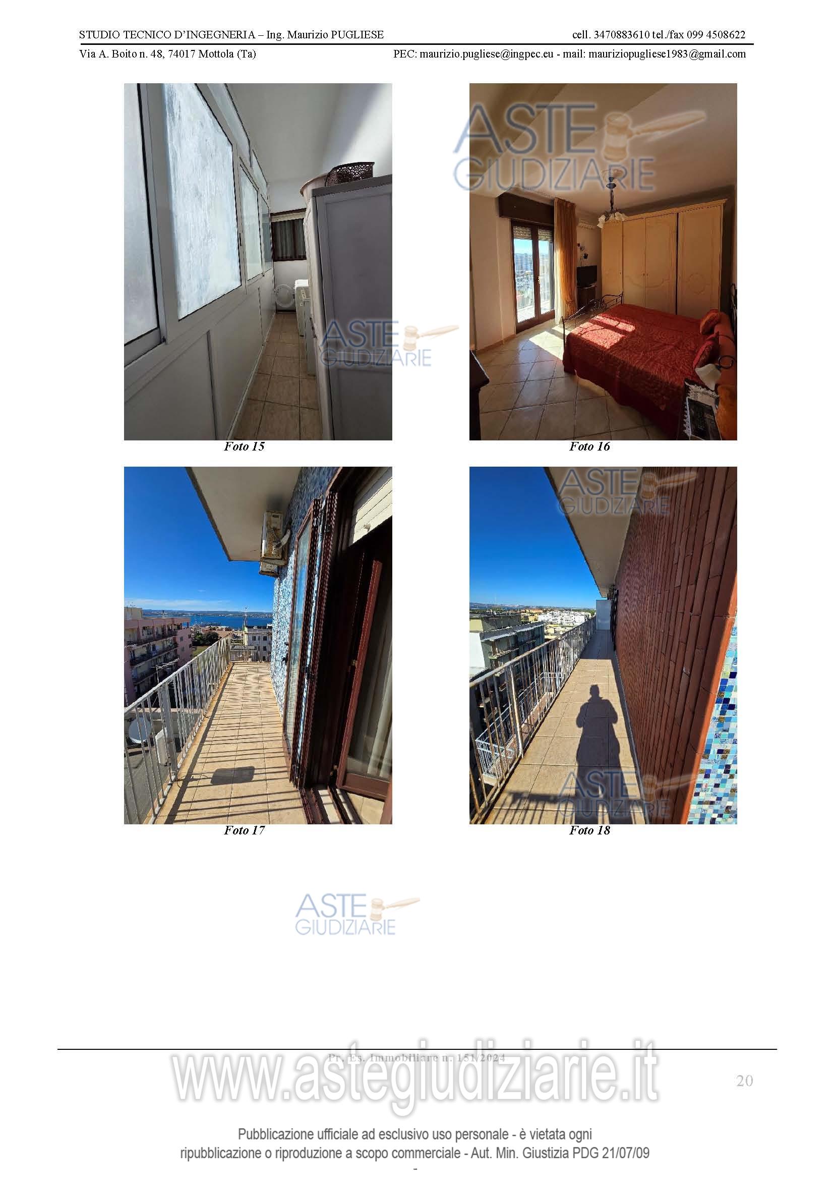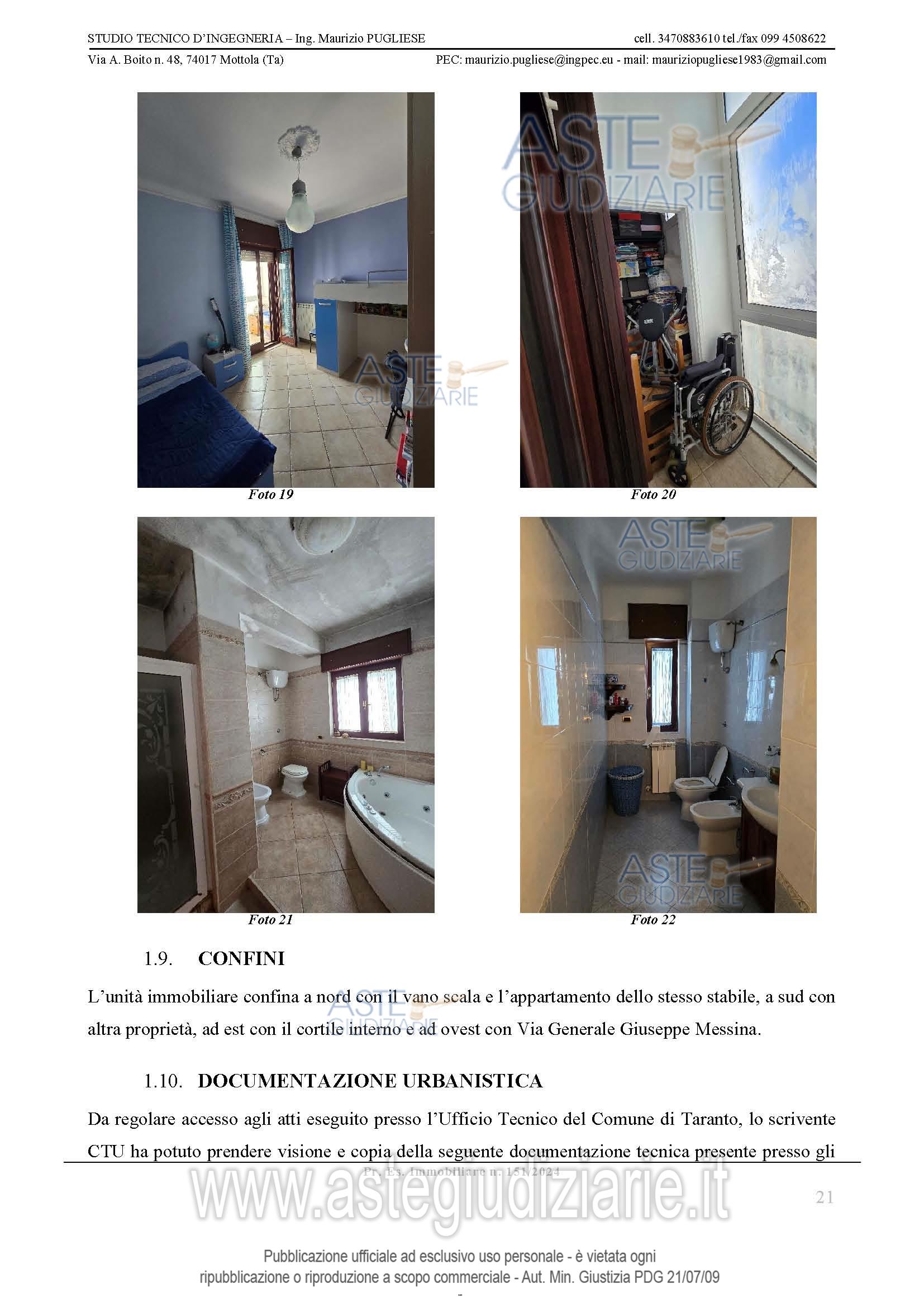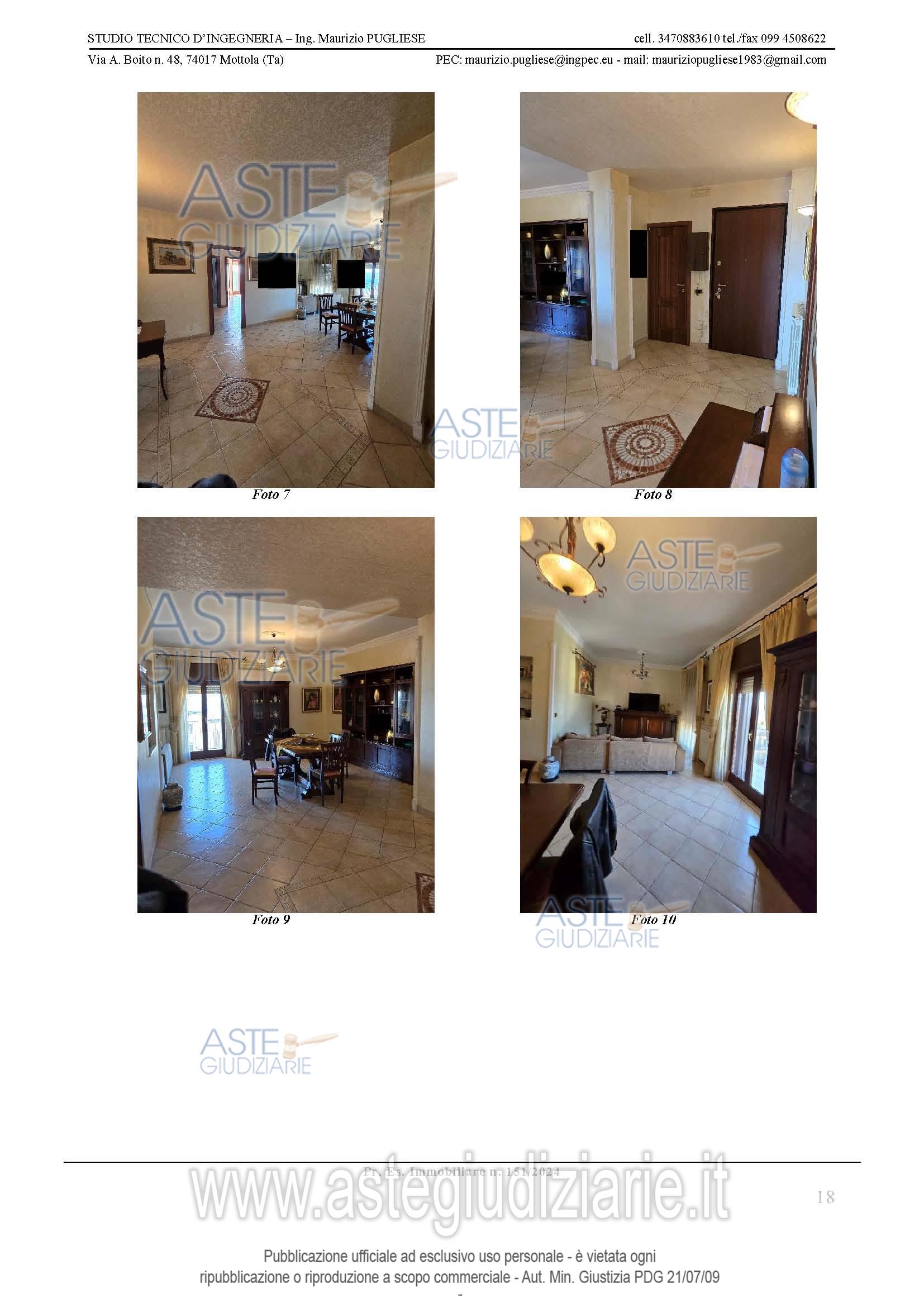 Vendita all'asta Senza incanto, con gara telematica asincrona - LOTTO UNICO: Piena proprietà di un appartamento al decimo piano dotato di ascensore e si compone di ingresso, cucina, soggiorno, disimpegno, due camere da letto, ripostiglio, due bagni e due verande chiuse prospicienti il cortile interno. Prezzo base € 130.600,00 (offerta minima € 97.950,00). Data inizio operazioni di vendita: 03/03/2026 ore 16:00. Giudice Andrea Paiano. Professionista delegato alla vendita Dott. Cosimo Valentini. Custode Giudiziario Dott. Cosimo Valentini - Email "c.valentini@cosimovalentini.it"; Tel. 0997362632. Rif. Tribunale di Taranto - Espropriazione immobiliare (cartabia) n. 151/2024