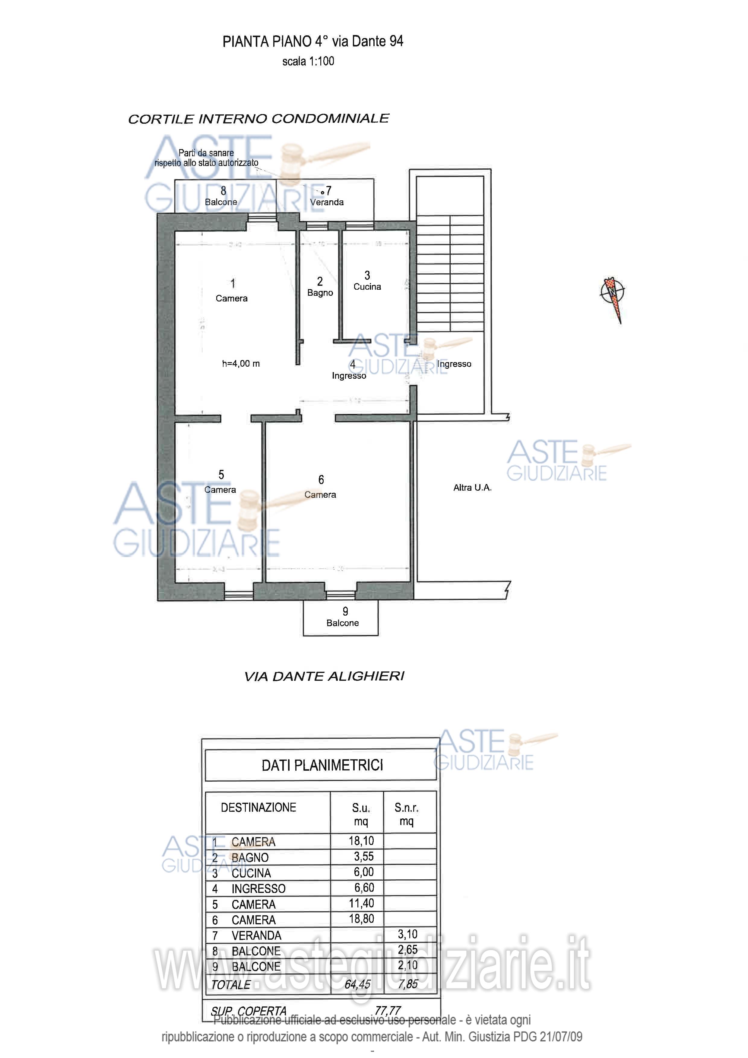 Vendita all'asta Senza incanto, con gara telematica asincrona - LOTTO 1: Piena proprietà dell'alloggio facente parte del fabbricato sito in Taranto -Rione ItaliaMontegranaro-,alla via Dante n.ro 94 privo di ascensore, al piano 4 ° con ingressodalla porta a destra salendo le scale, articolato in ingresso, cucina abitabile, n.ro 3camere, bagno, per una superficie utile di 64,45 mq, 2 balconi di superficie pari a 2,65mq e 2,10, n.ro 1 veranda di 3,10 mq. Altezza di mq 3,25. Si compone di ingresso,cucina abitabile, n.ro 3 camere bagno. Prezzo base € 22.650,00 (offerta minima € 16.988,00). Data inizio operazioni di vendita: 10/03/2026 ore 16:00. Professionista delegato alla vendita Avv. Maria Luisa Lucchese. Custode Giudiziario Avv. Maria Luisa Lucchese - Email "lucchesemarialuisa@libero.it"; Cell. 3471283877. Rif. Tribunale di Taranto - Espropriazione immobiliare (cartabia) n. 304/2023