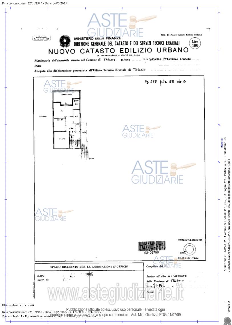 Vendita all'asta Senza incanto, con gara telematica asincrona - LOTTO UNICO: Appartamento ubicato in Taranto (zona San Vito) – Prima Traversa Via Vizzarro n. 1, posto alsecondo piano di un fabbricato su tre livelli, accessibile attraverso una scala esterna inmuratura sino al primo piano e una interna in muratura sino al secondo piano, caratterizzatoda 4,5 vani della superficie utile interna di circa mq. 72,00, oltre ad un balcone scoperto di 20mq circa. Prezzo base € 86.000,00 (offerta minima € 64.500,00). Data inizio operazioni di vendita: 08/04/2026 ore 16:00. Giudice Dott. Andrea Paiano. Professionista delegato alla vendita Avv. Leoluca Laterza. Custode Giudiziario Avv. Leoluca Laterza - Email "laterzaleoluca@gmail.com". Rif. Tribunale di Taranto - Espropriazione immobiliare (cartabia) n. 299/2024
