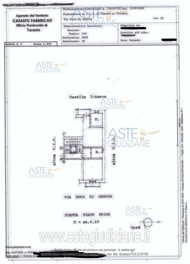 Vendita all'asta Senza incanto, con gara telematica asincrona - LOTTO 1: Appartamento sito in Taranto, Via Duca Di Genova n27, al primo piano, censito all'Agenzia delTerritorio del Comune di Taranto al fg. 319, part. 2692, sub.40, zona cens. 1, cat.A/3, , classe 3,cons. 4 vani, rendita catastale € 413,17. Prezzo base € 73.000,00 (offerta minima € 54.750,00). Data inizio operazioni di vendita: 28/04/2026 ore 16:00. Giudice Dott. Andrea Paiano. Professionista delegato alla vendita Avv. Anna Romeo. Custode Giudiziario Avv. Anna Romeo - Email "romeoavv.anna@alice.it". Rif. Tribunale di Taranto - Espropriazione immobiliare (cartabia) n. 274/2023