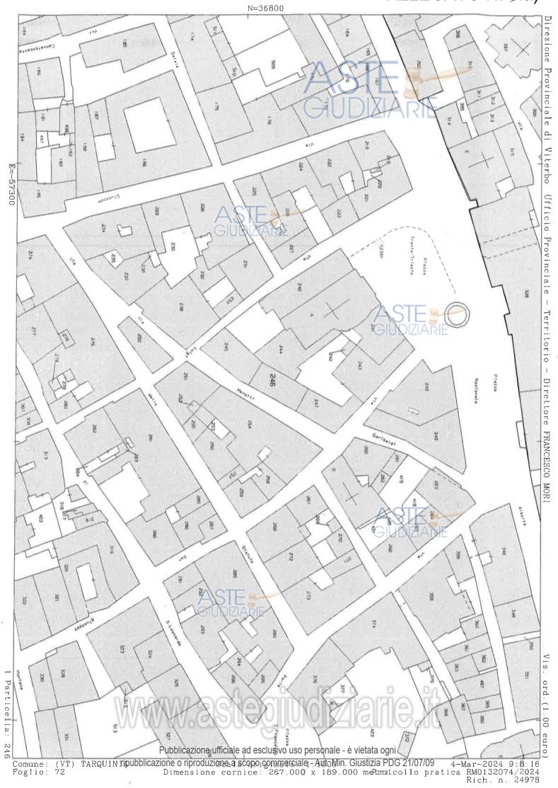 Vendita all'asta Senza incanto, con gara telematica asincrona - LOTTO 1: Appartamento sito al terzo piano di stabile condominiale in centro storico a Tarquinia, in buono stato di conservazione. Composto da ingresso, soggiorno, cucina, 6 stanze, wc, wc di servizio, ripostiglio, balconi. Portoncino di accesso ed infissi interni in legno, infissi esterni parte in legno e parte in alluminio anodizzato. Pavimentazione camere parte in laminato e parte in ceramica. Balconi pavimentati in gres. Dotato di impianto termico autonomo implementato con l’ausilio di condizionatori. Superficie catastale mq 226. Superficie calpestabile mq 192,55. Il tutto contraddistinto in NCEU del Comune di Tarquinia al Foglio 72, part. 246, sub 7, Cat. A/2, classe 2, consistenza 9,5 vani, rendita euro 1152,99. Confinante con Via Della Veronica a sud, subalterno 5 a Ovest, subalterno 7 a Est.