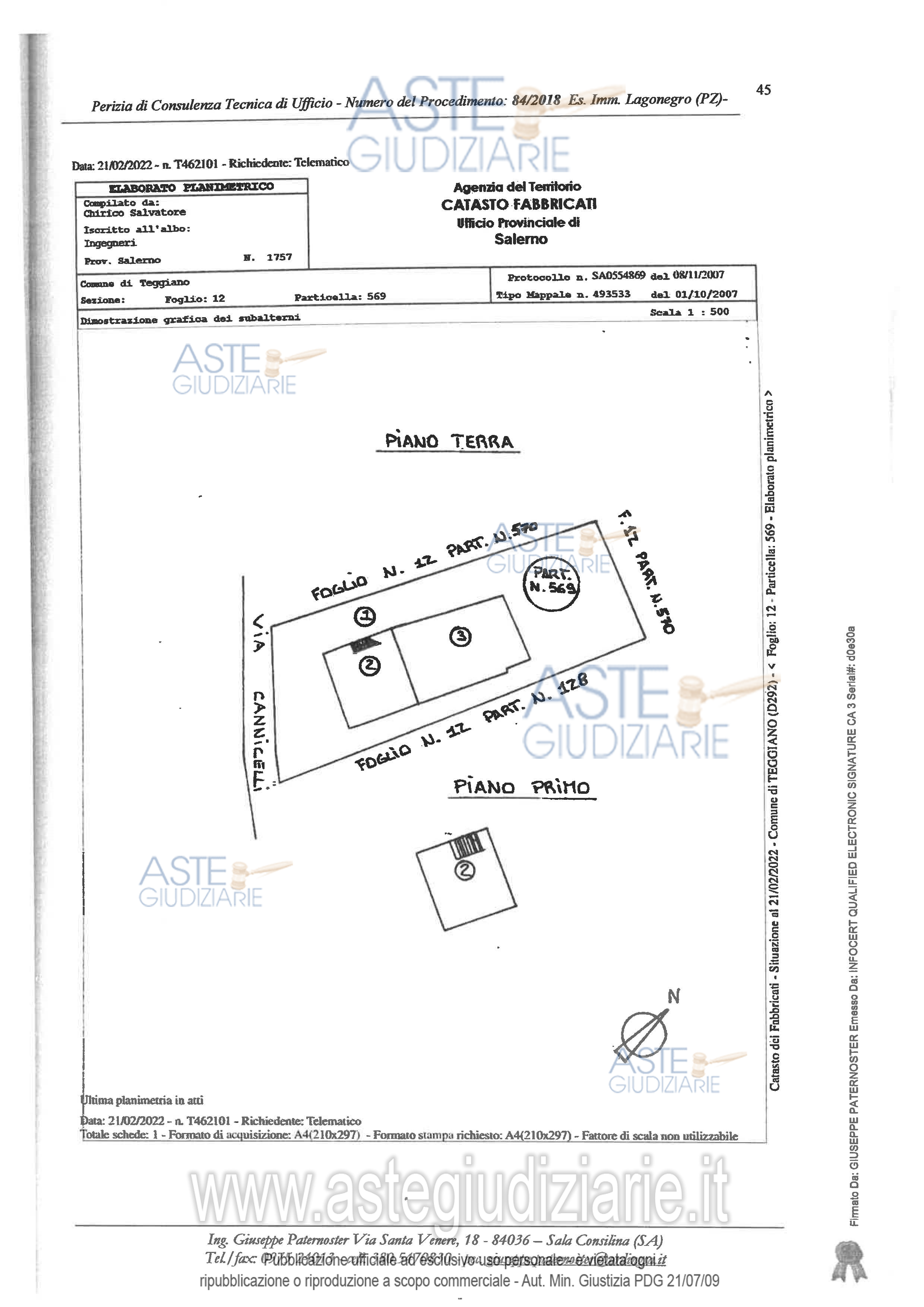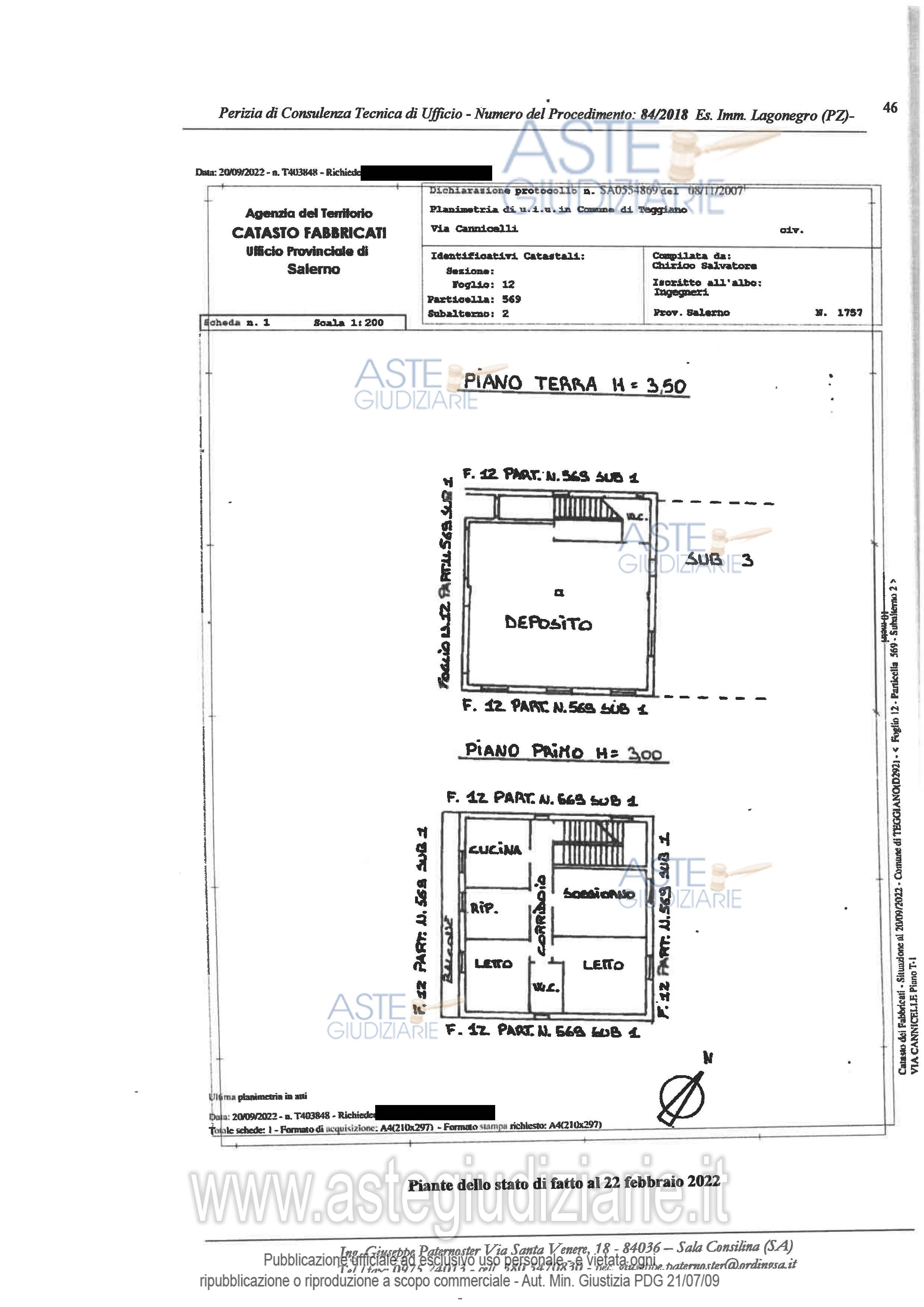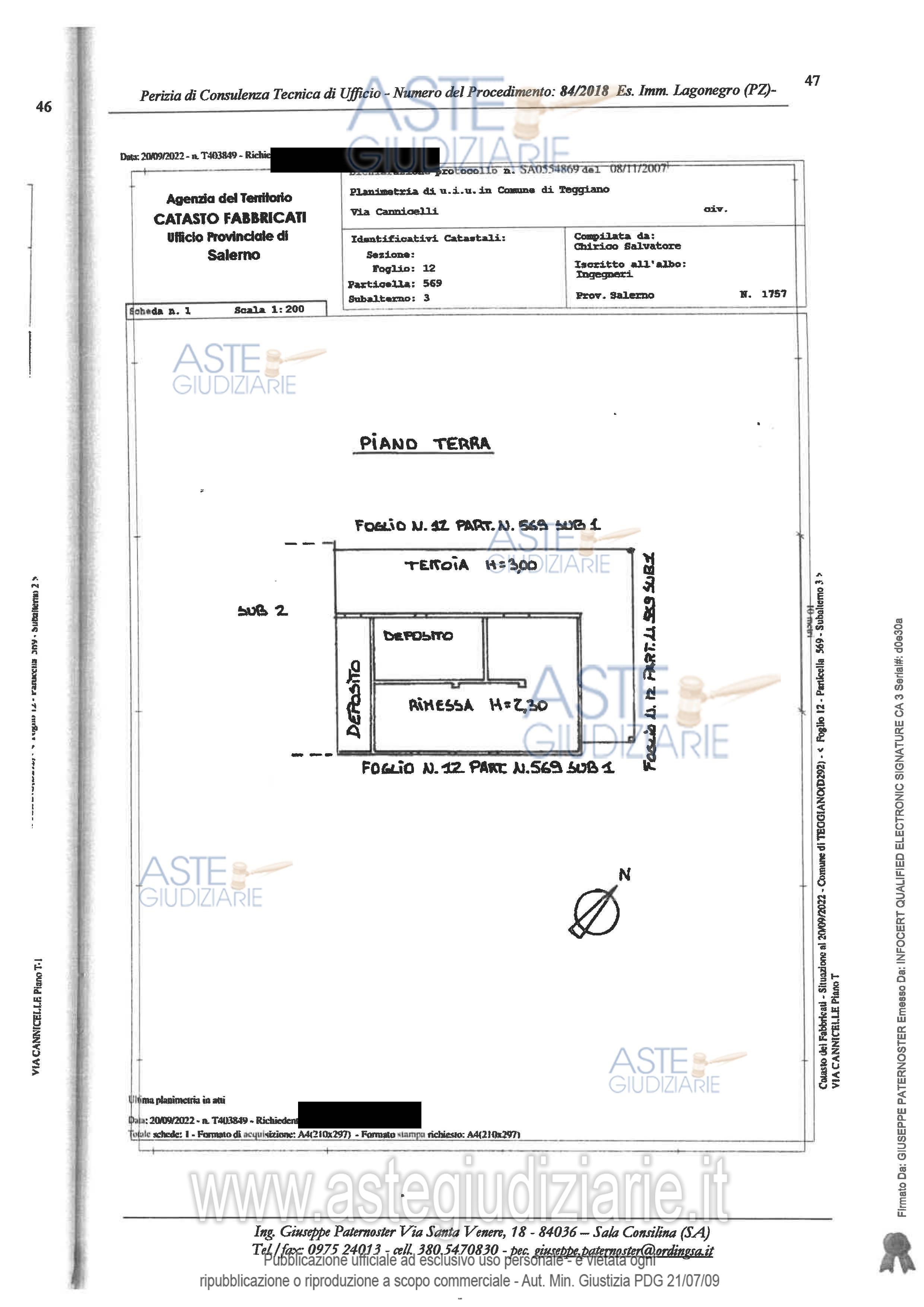 Vendita all'asta Senza incanto, con gara telematica asincrona - LOTTO UNICO: Diritto di piena ed intera proprietà sull’immobile sito in Teggiano (SA), ubicato alla Via Cannicelle snc, in zona periferica - frazione di Prato Perillo (zona E di PUC), distinti al N.C.E.U. al foglio 12 part. lla 569 sub 2-3, ctg A/3, ubicato al piano T-1 e ctg. C/6, ubicato al piano T. Fondo sito in Teggiano (SA), in zona periferica dell'abitato in C. da Perillo, riportato al N.C.T. al Foglio n°12 Particella 570, in zona “E” (Zona Agricola) del P.U.C. adottato. Prezzo base € 37.434,15 (offerta minima € 28.075,61). Data inizio operazioni di vendita: 05/02/2026 ore 12:00. Professionista delegato alla vendita Avv. Barbara Pisoni - Email "studiolegalepisoni@gmail.com"; Cell. 03383615162. Custode Giudiziario Avv. Barbara Pisoni - Email "studiolegalepisoni@gmail.com"; Cell. 03383615162. Rif. Tribunale di Lagonegro - Esecuzione immobiliare post legge 80 n. 84/2018