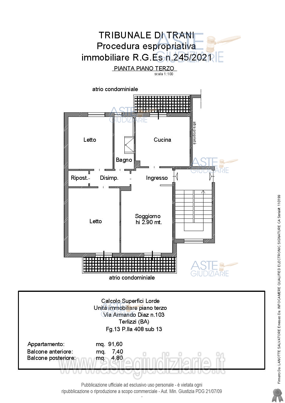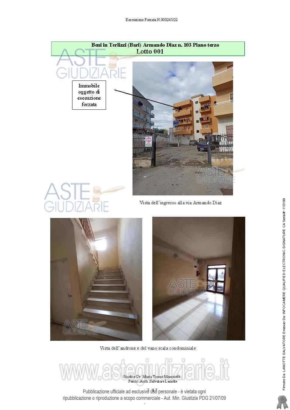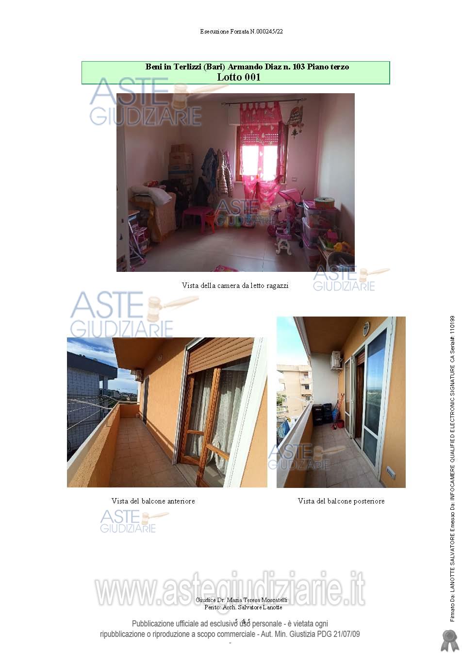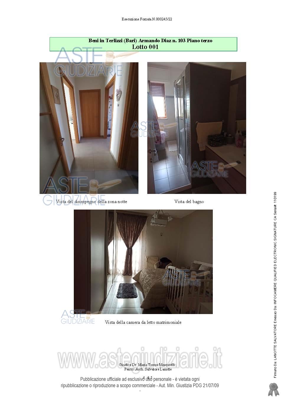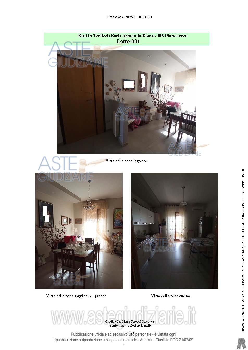 Vendita all'asta Senza incanto, con gara telematica sincrona - LOTTO UNICO: Appartamento al piano terra: soggiorno, cucina, due camere da letto, bagno e ripostiglio, con due balconi. Senza ascensore. Vi è provvedimento di assegnazione della casa coniugale del Tribunale di Trani trascritto il 24.11.2023 Reg. G.le 25111 Reg. Part. 20149; tale formalità a norma dell'art. 586 c.p.c. non potrà essere cancellata. L'immobile è occupato dal coniuge comproprietario in virtù dell’ provvedimento innanzi indicato. Prezzo base € 75.172,59 (offerta minima € 56.379,45). Data vendita 19/12/2025 ore 11:30. Professionista delegato alla vendita Avv. Marianna Catino - Email "catino.avvocati@tin.it"; Tel. 0883403758. Custode Giudiziario Avv. Marianna Catino - Email "catino.avvocati@tin.it"; Tel. 0883403758. Rif. Tribunale di Trani - Esecuzione immobiliare post legge 80 n. 245/2021