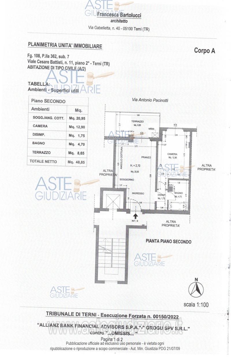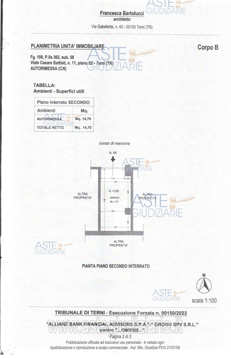 Vendita all'asta Senza incanto, con gara telematica asincrona - LOTTO 1:  appartamento di civile abitazione posto al piano secondo con autorimessa di pertinenza al piano S-2. Si compone di unico ambiente adibito a soggiorno/pranzo con angolo cottura e terrazzo, una camera da letto, un disimpegno e un servizio igienico privo di finestra con aerazione forzata e con vasca idromassaggio. Superficie netta complessiva pari a circa 48,85 mq. Il tutto meglio descritto nella perizia. Prezzo base € 83.280,00 (offerta minima € 62.460,00). Data inizio operazioni di vendita: 05/11/2025 ore 18:00. Giudice Francesco Angelini. Professionista delegato alla vendita Avv. Chiara Bassanelli - Email "avv.chiarabassanelli@gmail.com"; Tel. 3478120198. Custode Giudiziario  Avv. Chiara Bassanelli - Email "avv.chiarabassanelli@gmail.com"; Tel. 3478120198.  Rif. Tribunale di Terni - Esecuzione immobiliare post legge 80 n. 150/2022