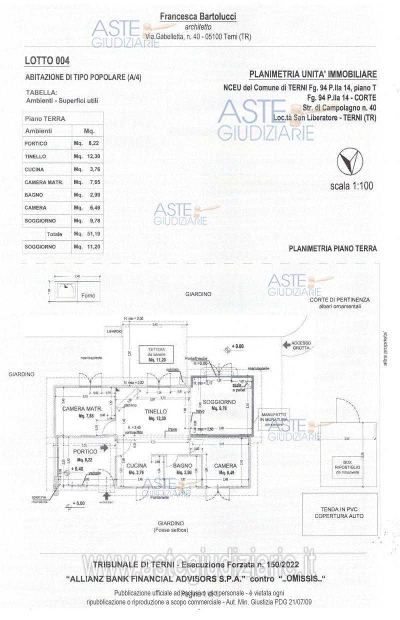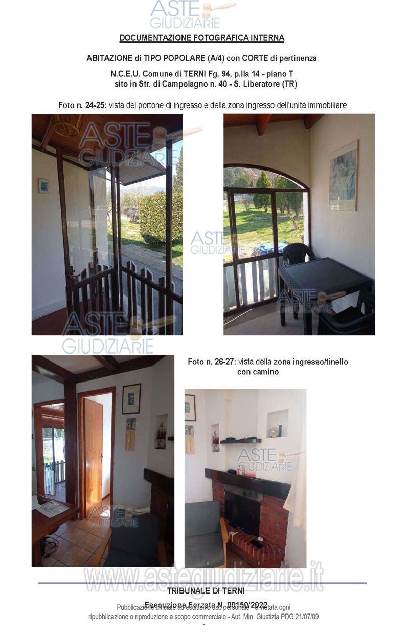 Vendita all'asta Senza incanto, con gara telematica asincrona - LOTTO 4: fabbricato unifamiliare indipendente -abitazione di tipo popolare, di un piano fuori terra con annessa corte pertinenziale; si compone di: portico di accesso chiuso con infissi, ampio locale adibito a cucina e tinello/pranzo con camino, soggiorno, due camere da letto e un servizio igienico. Il tutto meglio descritto nella perizia di stima. Prezzo base € 36.750,00 (offerta minima € 27.562,50). Data inizio operazioni di vendita: 28/01/2026 ore 15:45. Giudice Francesco Angelini. Professionista delegato alla vendita Avv. Chiara Bassanelli - Email "avv.chiarabassanelli@gmail.com"; Tel. 3478120198. Custode Giudiziario Avv. Chiara Bassanelli - Email "avv.chiarabassanelli@gmail.com"; Tel. 3478120198. Rif. Tribunale di Terni - Esecuzione immobiliare post legge 80 n. 150/2022