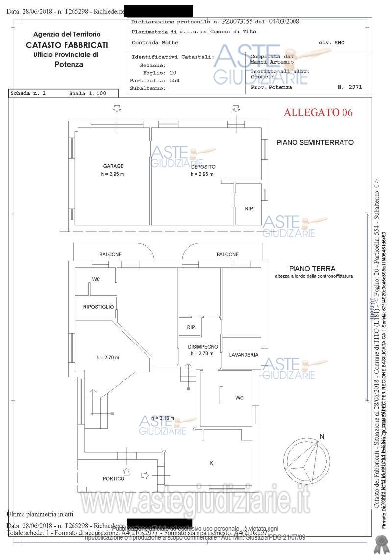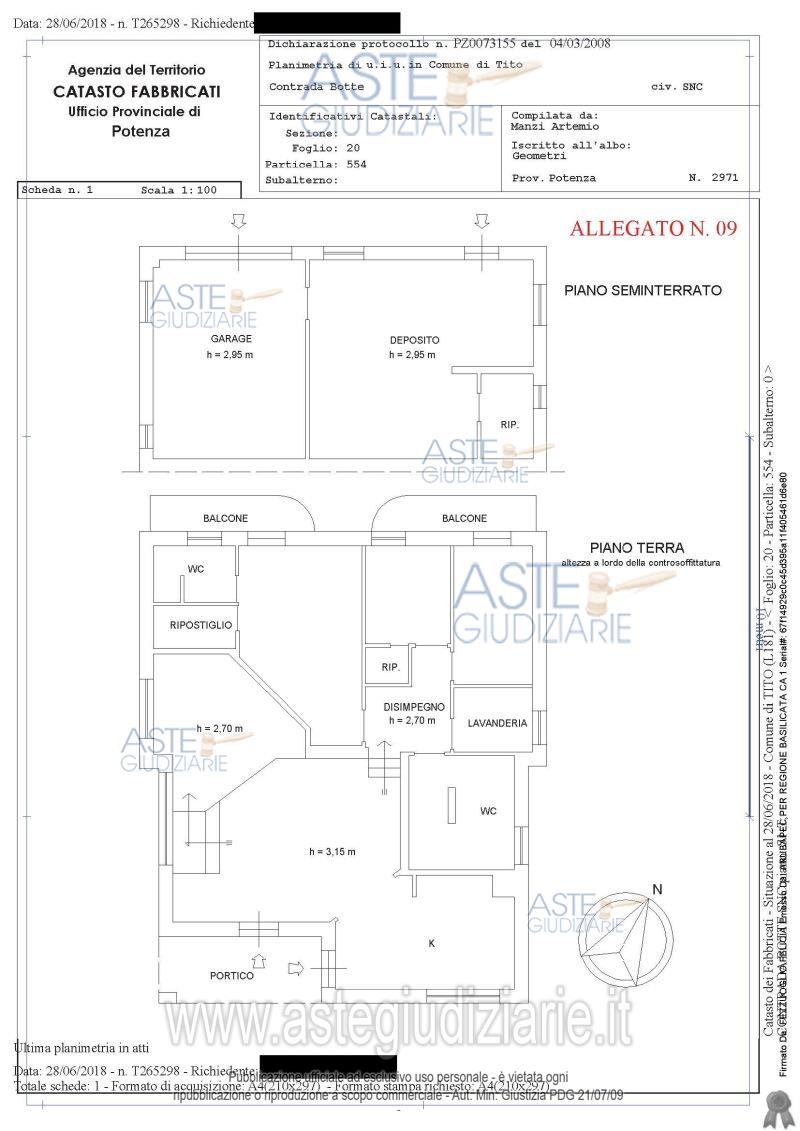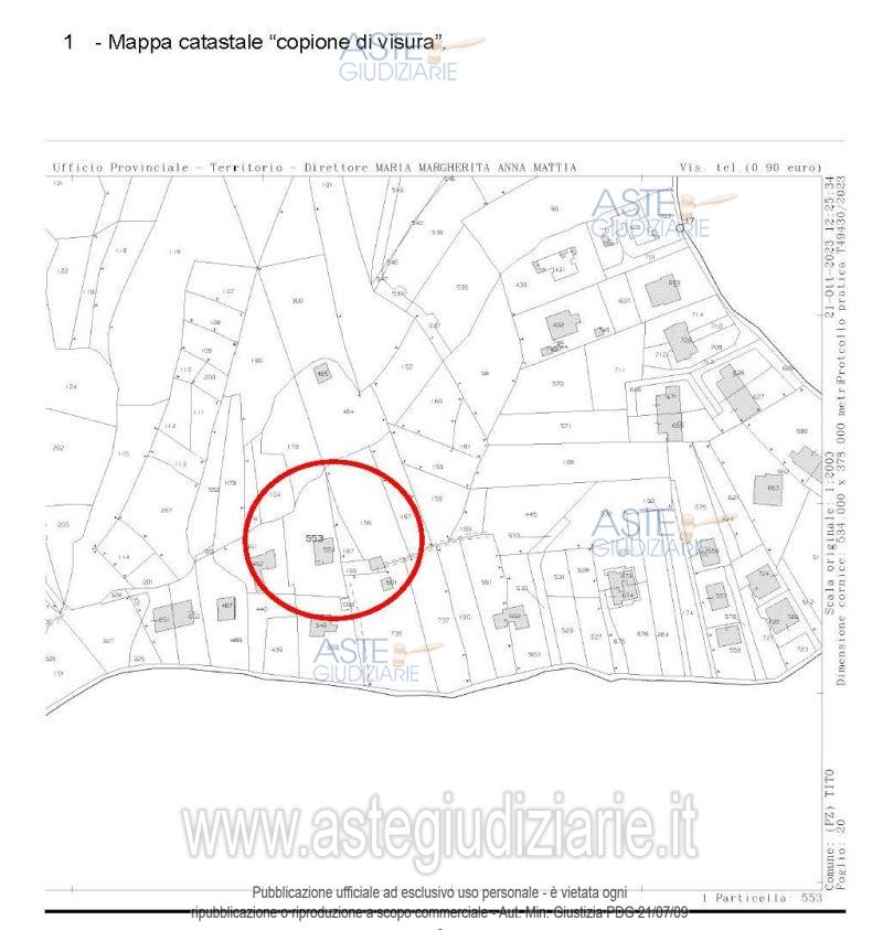 Vendita all'asta Mezzo commissionario, con gara telematica asincrona - LOTTO UNICO: Piena proprietà quota 1/1 in Tito (PZ) alla via E. Berlinguer n. 28 (ex c.da Botte n. 5 bis):- appartamento composto da un piano terra e un piano seminterrato individuato nel Catasto Fabbricati:Foglio 20 p.lla 554, piano S1- T, cat. A/2, cl. 4, vani 8.Terreno individuato nel Catasto Terreni: - Foglio 20 p.lla 553, vigneto, Classe 2, are 13.31. Prezzo base € 65.919,00 (offerta minima € 49.440,00). Data inizio operazioni di vendita: 13/11/2025 ore 16:00. Professionista delegato alla vendita Avv. Antonio Casulli - Email "avv.antonio.casulli@gmail.com"; Cell. 3356647447; Tel. 0971443408. Custode Giudiziario Avv. Angelo Mario Esposito - Email "avv.esposito@tiscali.it"; Cell. 3472794080; Tel. 097146365. Rif. Tribunale di Potenza - Esecuzione immobiliare post legge 80 n. 184/2014