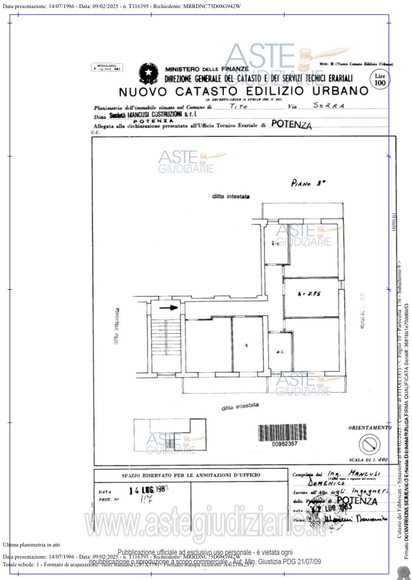 Vendita all'asta Senza incanto, con gara telematica asincrona - LOTTO UNICO: Piena ed intera proprietà di abitazione ubicata in Tito (PZ) alla C.da Serra n. 54, Piano Terzo; il complesso è formato da 7 ambienti destinati rispettivamente a corridoio, cucina-pranzo, letto 1, . Prezzo base € 52.687,50 (offerta minima € 39.515,62). Data inizio operazioni di vendita: 26/03/2026 ore 11:00. Giudice Dott. Angela Alborino. Professionista delegato alla vendita Avv. Gabriele Messina - Email "studiolegalemessina@gmail.com". Custode Giudiziario Avv. Gabriele Messina - Email "studiolegalemessina@gmail.com"; Tel. 097121938. Rif. Tribunale di Potenza - Espropriazione immobiliare (cartabia) n. 34/2024