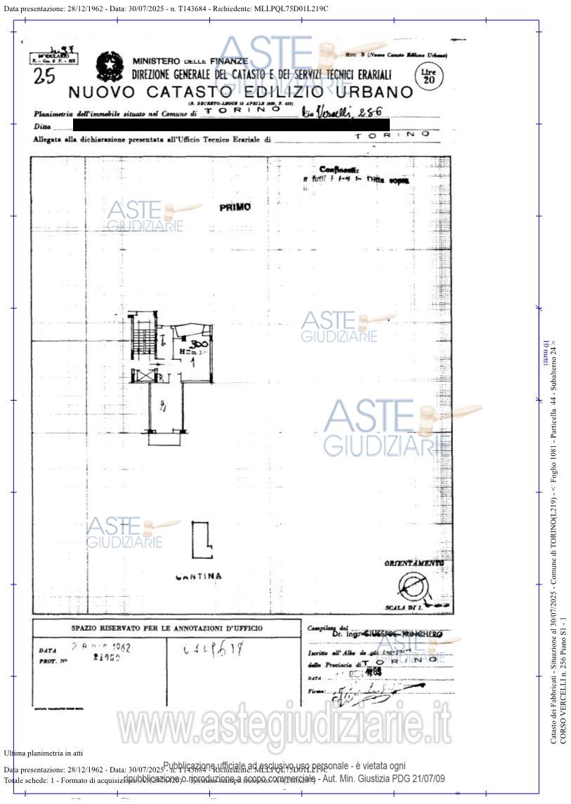 Vendita all'asta Senza incanto, con gara telematica asincrona - LOTTO 1: Appartamento al piano primo (2° f.t.), identificato con il n. 4 e composto da ingresso, una camera, cucina, bagno e ripostiglio; al piano sotterraneo cantina distinta con il numero 204. Prezzo base € 51.000,00 (offerta minima € 38.250,00). Data inizio operazioni di vendita: 21/04/2026 ore 10:00. Giudice Dott. Sabrina Gambino. Professionista delegato alla vendita Dott. Federico Baroni. Custode Giudiziario Dott. Federico Baroni - Email "dottbaroni.custodie@gmail.com"; Cell. 3356594104. Rif. Tribunale di Torino - Espropriazione immobiliare (cartabia) n. 444/2025