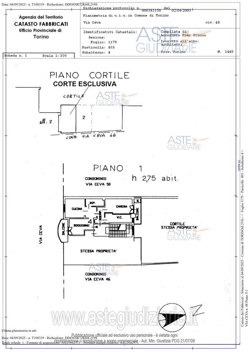 Vendita all'asta Senza incanto, con gara telematica asincrona - LOTTO UNICO: in Comune di Torino (TO), alla Via Ceva n. 48, della superficie commerciale di mq 66,00 in piena proprietà, meglio descritto nell'allegata relazione dell'esperto: - al piano primo (2° f.t.): un alloggio composto da ingresso living su soggiorno, cucina, una camera, bagno, disimpegno e due ripostigli di cui uno sul balcone, distinto con il numero 4;- nel cortile: una porzione di corte esclusiva distinta con il numero 4. Prezzo base € 57.000,00 (offerta minima € 42.750,00). Data inizio operazioni di vendita: 09/06/2026 ore 15:00. Professionista delegato alla vendita Avv. Claudia Stivala - Email "c.stivala@studioavvocatocastagna.it". Custode Giudiziario Istituto Vendite Giudiziarie - I.F.I.R. Piemonte - Email "richieste.visite@ivgpiemonte.it". Rif. Tribunale di Torino - Espropriazione immobiliare (cartabia) n. 436/2025