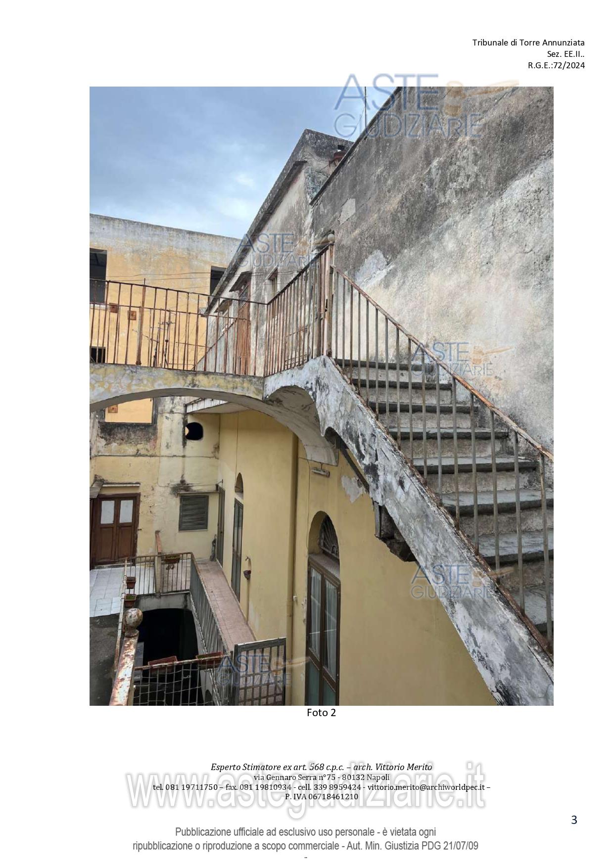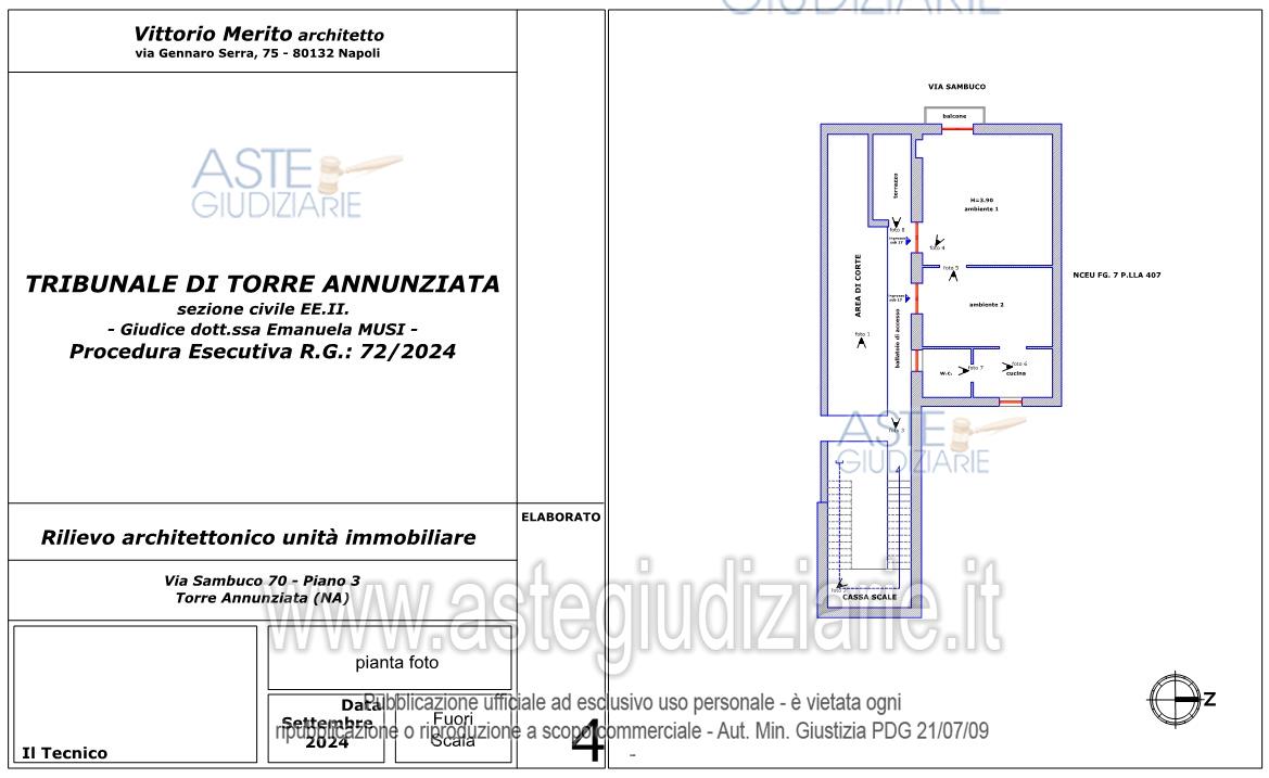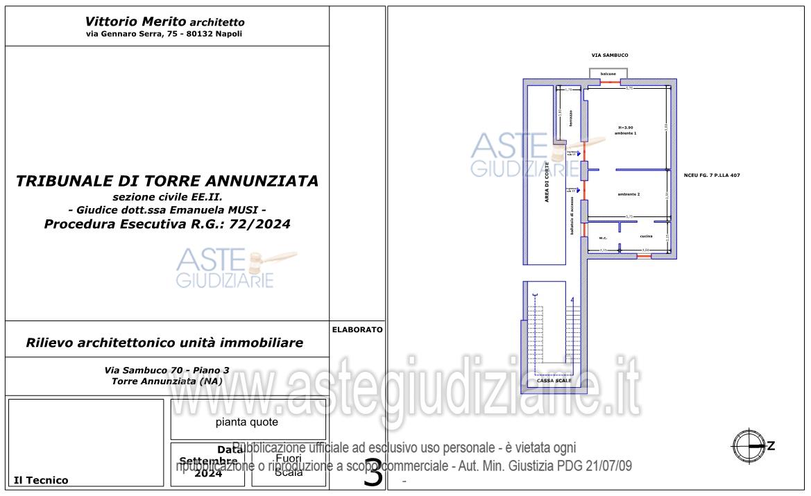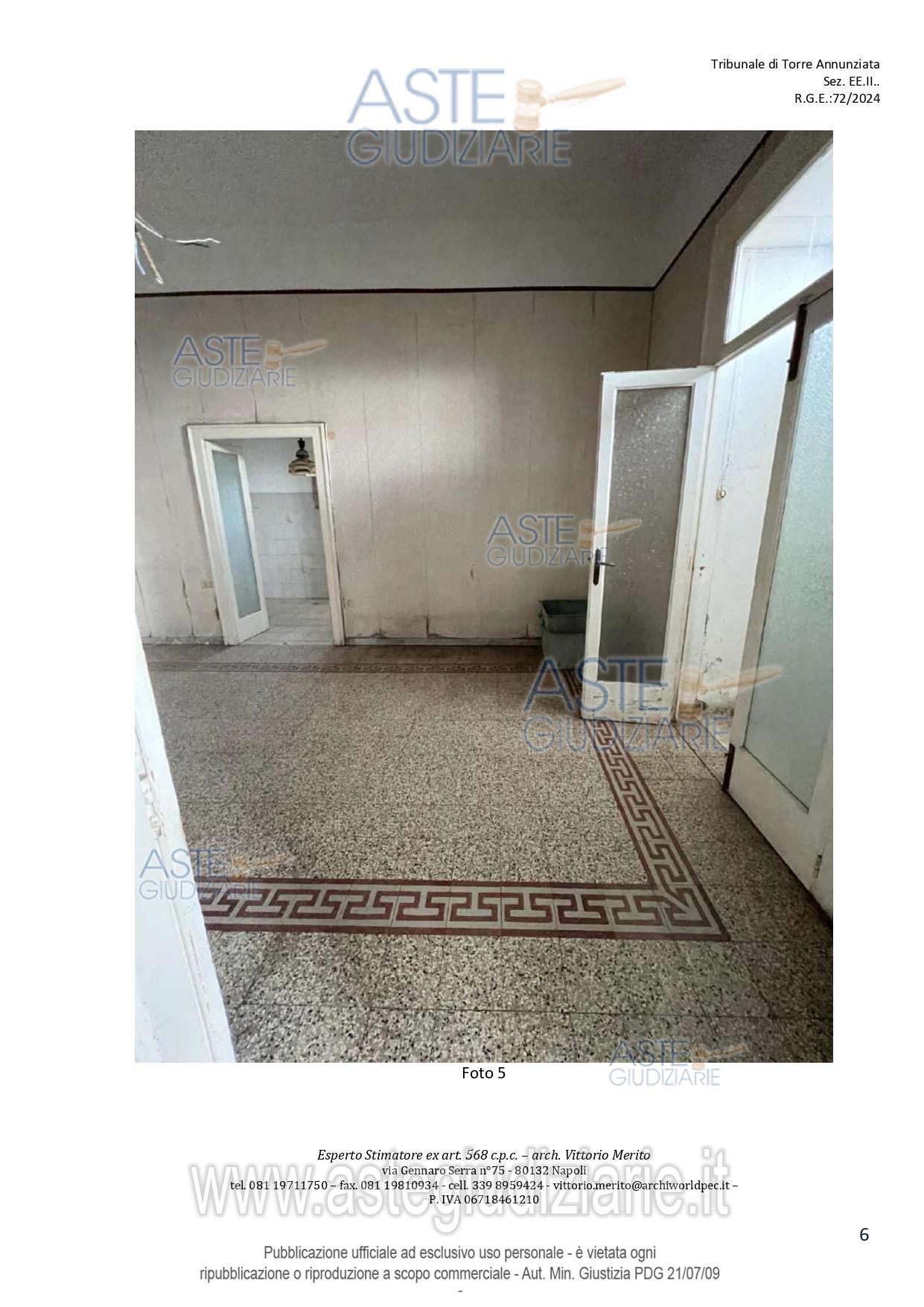 Vendita all'asta Senza incanto, con gara telematica asincrona - LOTTO UNICO: 1000/1000 della piena proprietà Appartamento – ubicato in via Sambuco n. 58 (catastalmente civ. 70), piano 3 – Torre Annunziata (NA) censito al NCEU del Comune di Torre Annunziata al fg. 7, p.lla 409, sub 17, zona cens. 2, cat. A/4, classe 1, cons. 3,5 vani, rendita € 83,51. Prezzo base € 30.750,00 (offerta minima € 23.062,50). Data inizio operazioni di vendita: 16/12/2025 ore 11:00. Professionista delegato alla vendita Avv. Roberta De Rienzo - Email "rderienzo@virgilio.it"; Cell. 3392226149; Tel. 0818506477. Custode Giudiziario Avv. Roberta De Rienzo - Email "rderienzo@virgilio.it"; Cell. 3392226149; Tel. 0818506477. Rif. Tribunale di Torre Annunziata - Espropriazione immobiliare (cartabia) n. 72/2024