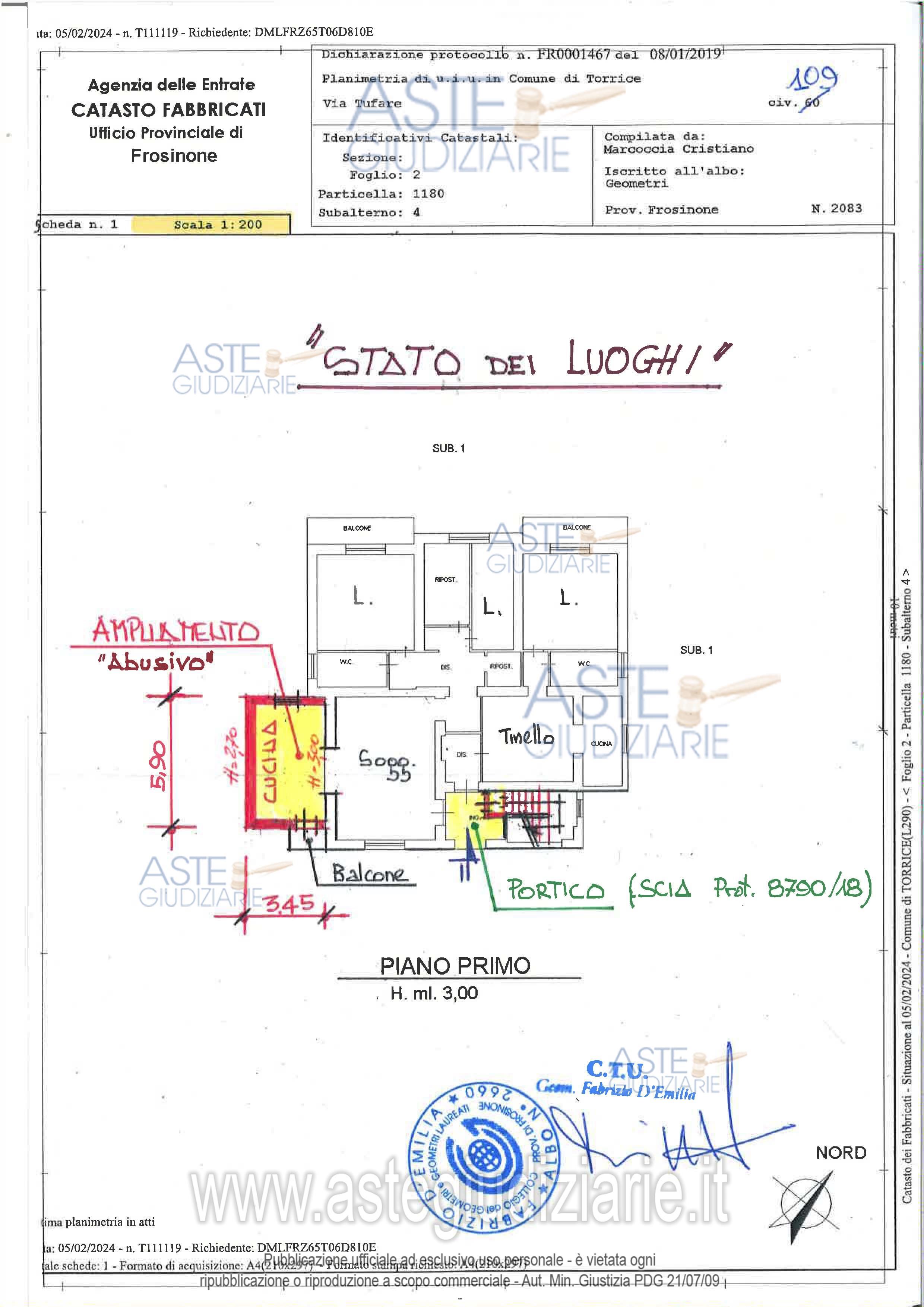 Vendita all'asta Senza incanto, con gara telematica asincrona - LOTTO UNICO: Diritto proprietà 1/1. Appartamento civile abitazione al piano primo di una palazzina di maggior consistenza avente corte comune con l'altra unità abitativa al p. Terra non esecutata. Fabbricato composto di 2 unità immobiliari abitative con accessi indipendenti dalla strada Via Tufare, struttura portante in elevazione in muratura di blocchetti squadrati di tufo copertura mista in parte a due falde e la restante parte retrostante a tetto a falda unica. Mq 192.60. Cat- Fab-Fg. 2, Part. 1180, Sub. 4, Cat A2. Prezzo base € 37.968,75 (offerta minima € 28.476,56). Data inizio operazioni di vendita: 22/04/2026 ore 10:30. Professionista delegato alla vendita Avv. Francesca Sibilia - Email "francesca.sibilia@libero.it"; Tel. 3396122419. Custode Giudiziario Avv. Francesca Sibilia - Email "francesca.sibilia@libero.it"; Tel. 3396122419. Rif. Tribunale di Frosinone - Esecuzione immobiliare post legge 80 n. 151/2023