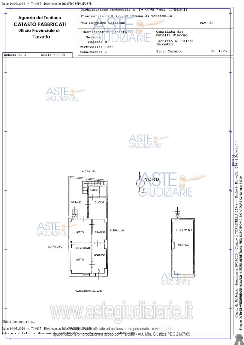 Vendita all'asta Senza incanto, con gara telematica asincrona - LOTTO UNICO: Piena proprietà dell’immobile con ortale, cantina sottoposta e lastrico solare pertinenziali. Prezzo base € 37.125,00 (offerta minima € 27.844,00). Data inizio operazioni di vendita: 09/06/2026 ore 16:00. Giudice Marcello Maggi. Professionista delegato alla vendita Avv. Domenica Stigliano. Rif. Tribunale di Taranto - Contenzioso civile n. 6647/2022