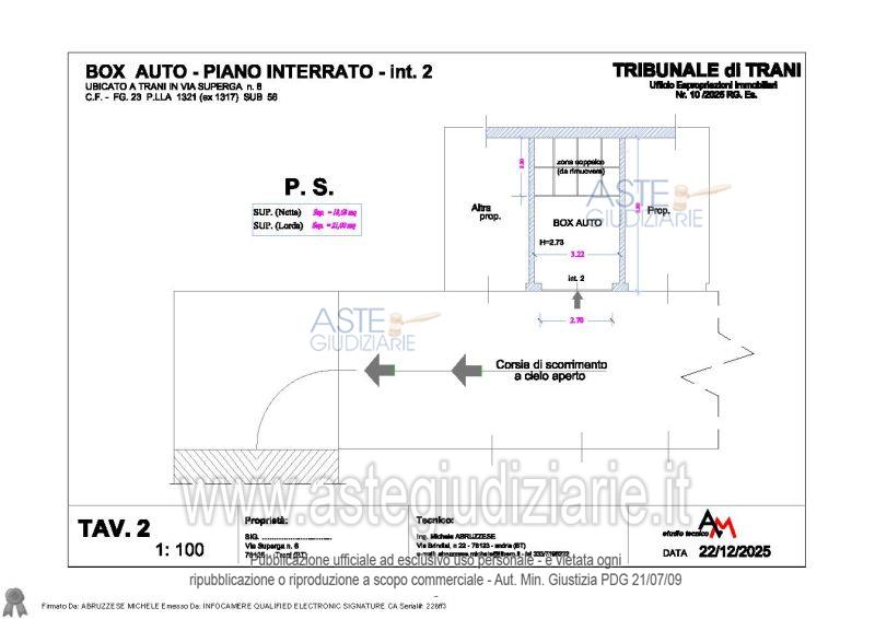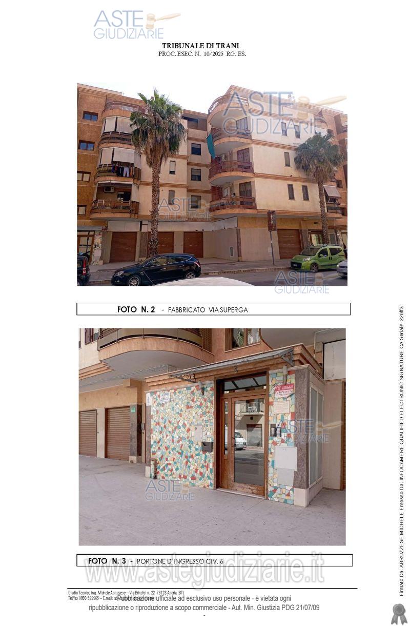 Vendita all'asta Senza incanto, con gara telematica sincrona - LOTTO UNICO: Piena proprietà per la quota di 1000/1000 dell’unità immobiliare ad uso abitativo ubicata al Piano Secondo (int. 5) della scala A con accesso da Via Superga n. 6, e piena proprietà per la quota di 1000/1000 del posto auto ubicato a Trani (BT) Via Superga n. 8, Scala A, interno 2, piano interrato, con accesso mediante rampa scoperta da Via Superga n. 8. Prezzo base € 94.619,00 (offerta minima € 70.965,00). Data vendita 06/07/2026 ore 09:30. Professionista delegato alla vendita Avv. Maurizio Musci - Email "studiomusci@hotmail.it"; Cell. 3477221418; Tel. 0883489506. Custode Giudiziario Avv. Maurizio Musci - Email "studiomusci@hotmail.it"; Cell. 3477221418; Tel. 0883489506. Rif. Tribunale di Trani - Esecuzione immobiliare post legge 80 n. 10/2025