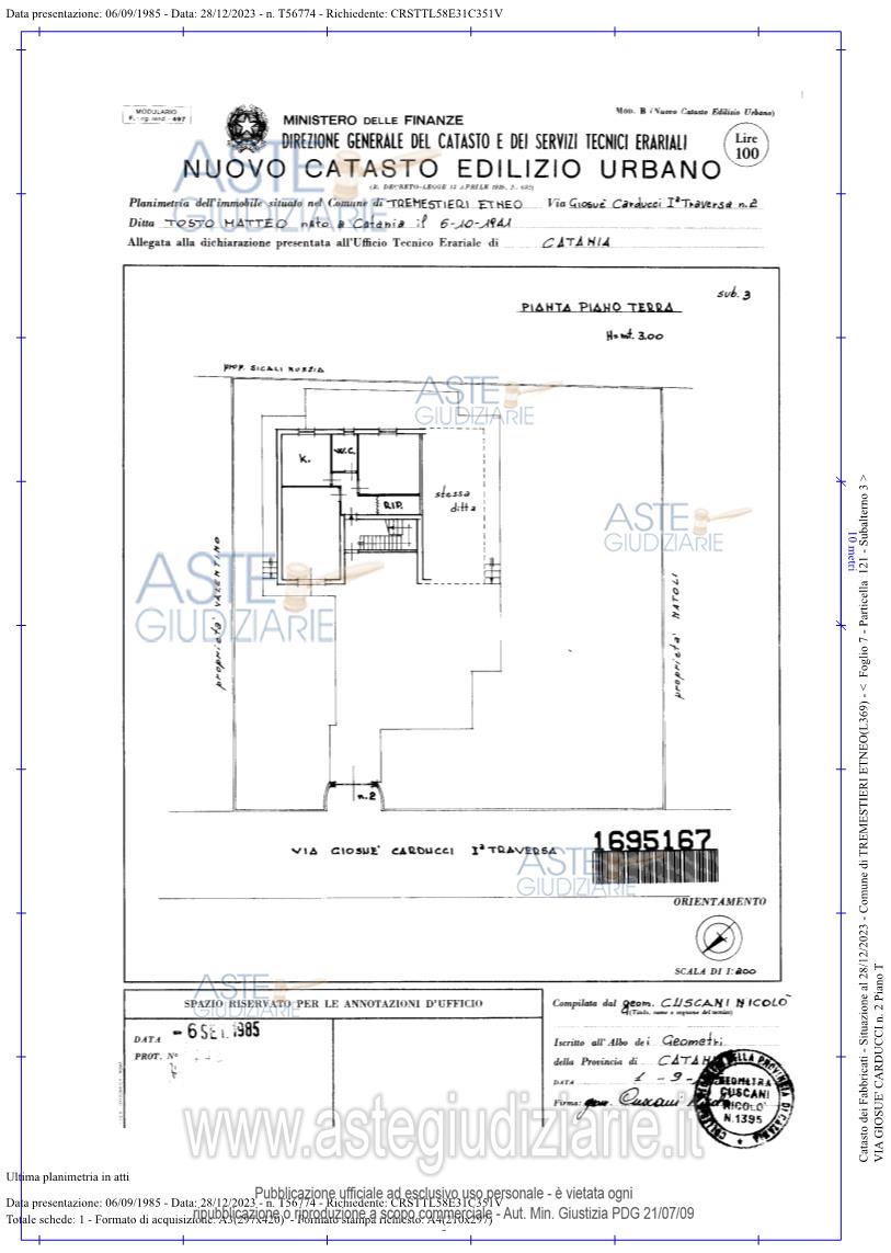 Vendita all'asta Senza incanto, con gara telematica sincrona - LOTTO 1: appartamento in villa bifamiliare posto al pian terreno di un fabbricato a due elevazioni fuori terra ubicato in Tremestieri Etneo (CT), Via Giovanni Pascoli n. 4 (ex tratto della Via Giosuè Carducci n. 2), metri quadri 88, vani 3, accessori e corte comune di circa 650 mq. Composto da ingresso-soggiorno, un vano, una cucina, un bagno ed un antibagno. Oltre un ballatoio ed un portico.