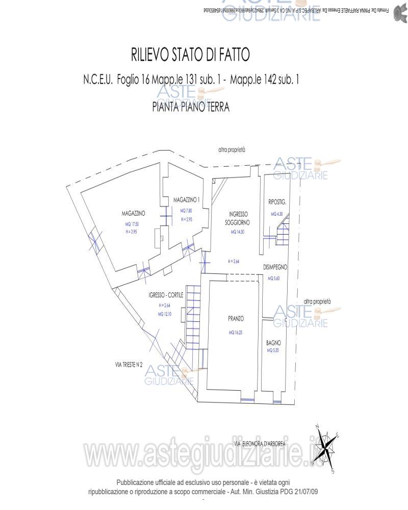 Vendita all'asta Senza incanto, con gara telematica asincrona - LOTTO UNICO: Piena proprietà fabbricato di civile abitazione , vani 7,5, piani T-1-2, censito in NCEU al F.16, mapp.131, sub.1 graffato a mapp.142, sub.1, Cat. A/3. Prezzo base € 88.061,40 (offerta minima € 66.046,05). Data inizio operazioni di vendita: 06/02/2026 ore 17:00. Professionista delegato alla vendita Avv. Lorenza Tamponi - Email "lorenza.tamponi@tiscali.it"; Tel. 079237725. Custode Giudiziario Istituto Vendite Giudiziarie Sassari - Email "visitaivgsassari@gmail.com"; Tel. 079260228. Rif. Tribunale di Sassari - Espropriazione immobiliare (cartabia) n. 109/2023