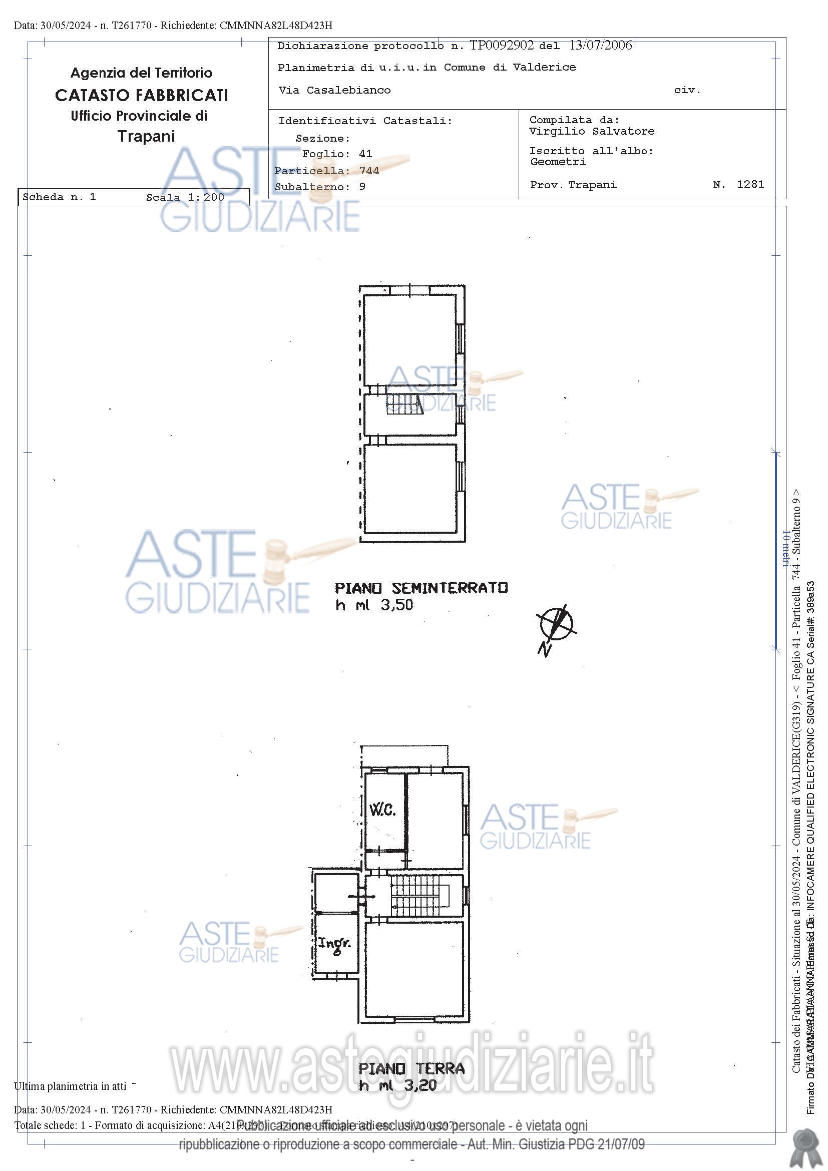 Vendita all'asta Senza incanto, con gara telematica asincrona - LOTTO UNICO: Piena proprietà, per la quota di 1/1, di un fabbricato, di superficie di 141,95 mq e con destinazione civile abitazione, sito in Valderice, in via Casalbianco n°22. Composto da un piano seminterrato e da un piano terra. Il piano seminterrato è composto da cucina, disimpegno, bagno, camera e vano scala. Il piano terra è formato da cucina-soggiorno, disimpegno, bagno, n. 2 camere e ripostiglio. Identificato al NCEU al Fg 41, part. 744, sub. 9. L'immobile risulta occupato. Sono presenti abusi sanabili. Prezzo base € 42.000,00 (offerta minima € 31.500,00). Data inizio operazioni di vendita: 25/03/2026 ore 10:30. Professionista delegato alla vendita Avv. Mario Sergio Scuderi - Email "mariosergio.scuderi@gmail.com"; Cell. 3477219500; Tel. 0923031472. Custode Giudiziario Avv. Mario Sergio Scuderi - Email "mariosergio.scuderi@gmail.com"; Cell. 3477219500; Tel. 0923031472. Rif. Tribunale di Trapani - Esecuzione immobiliare post legge 80 n. 9/2023