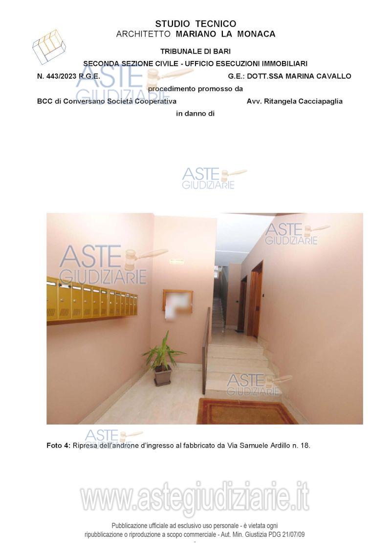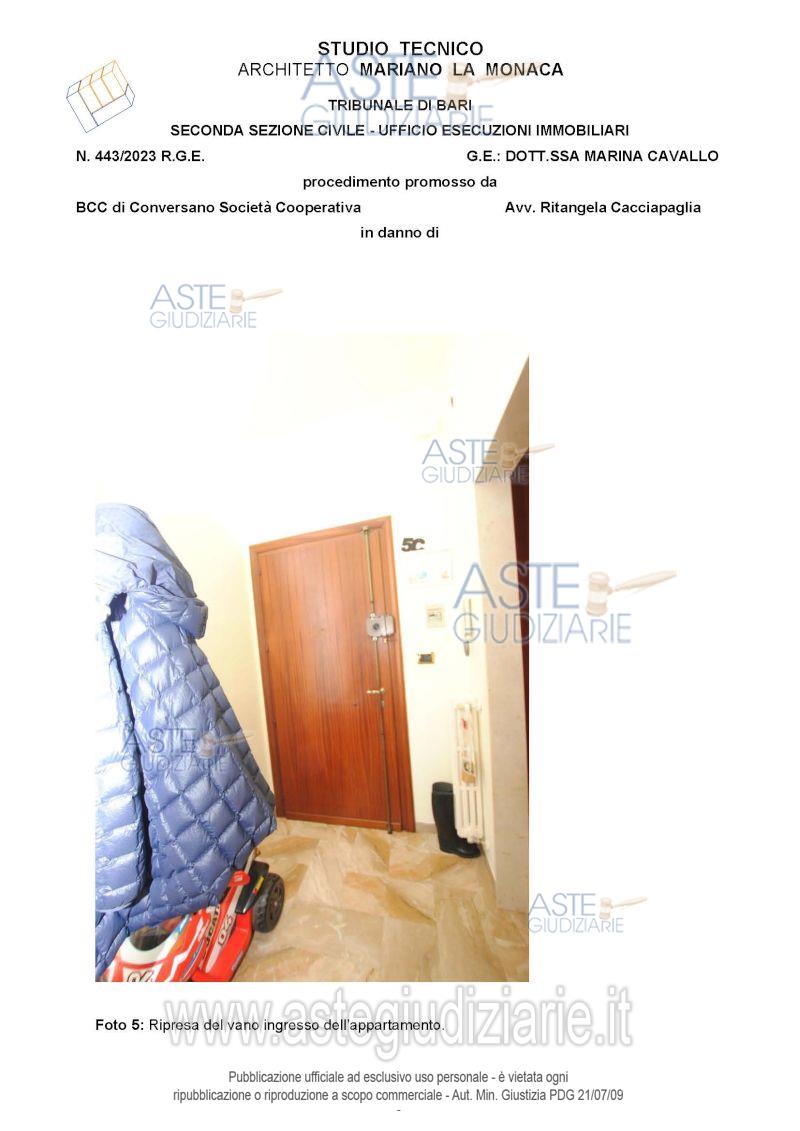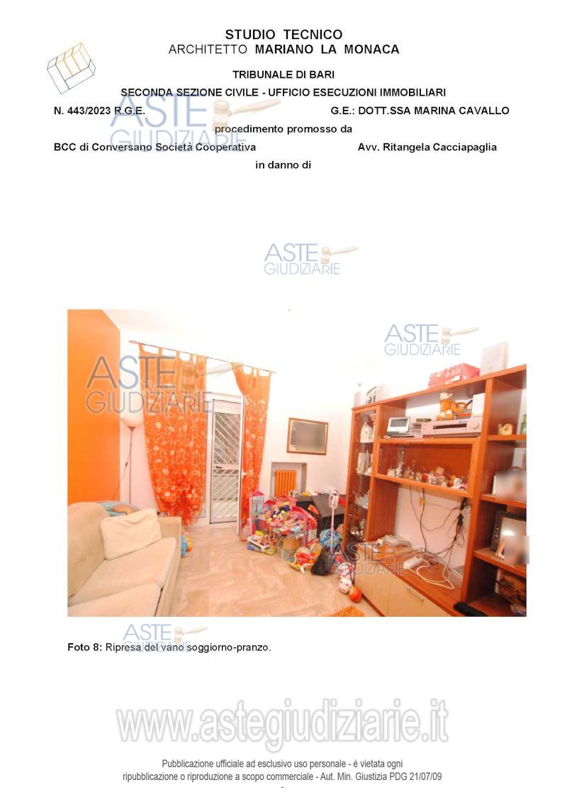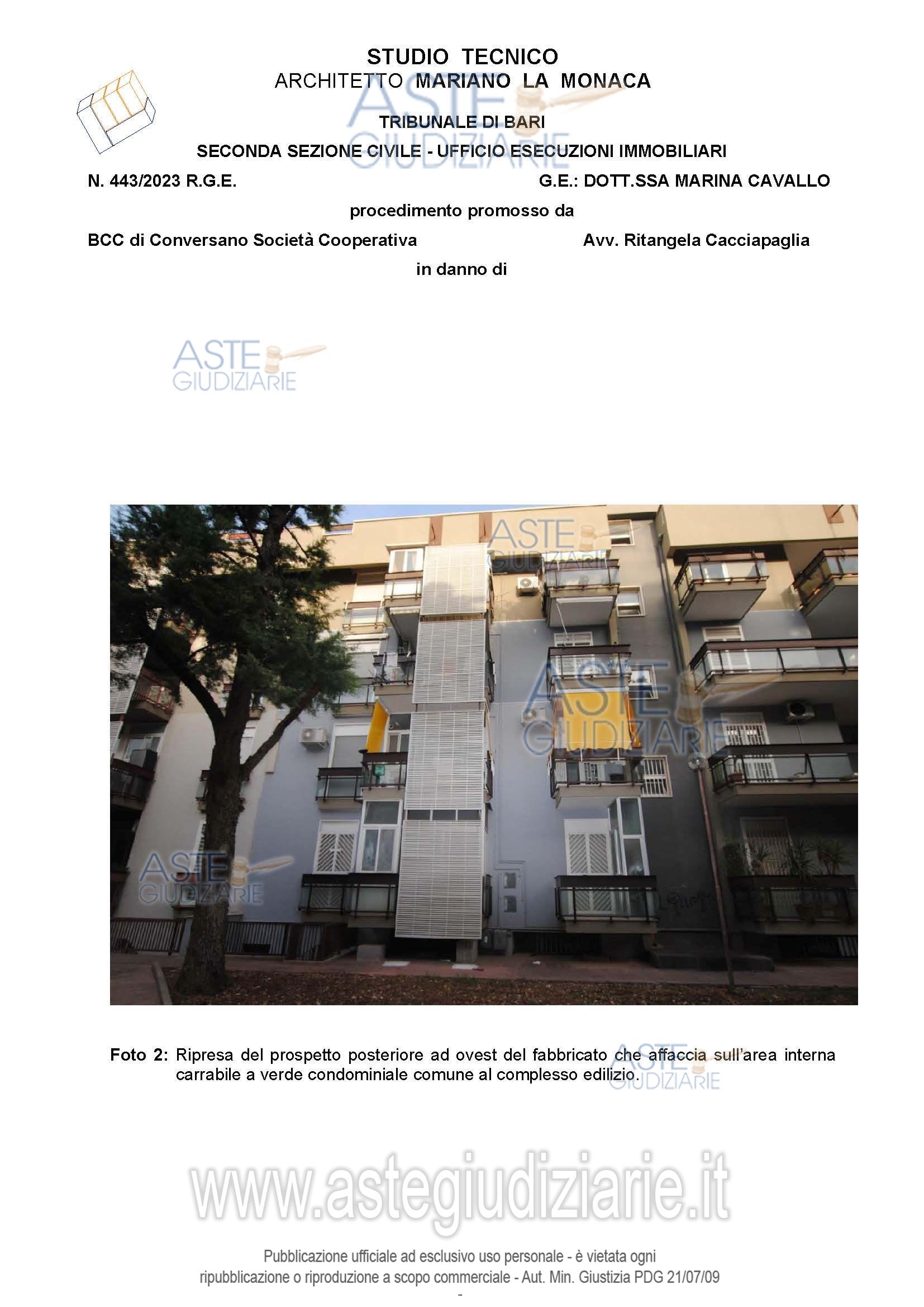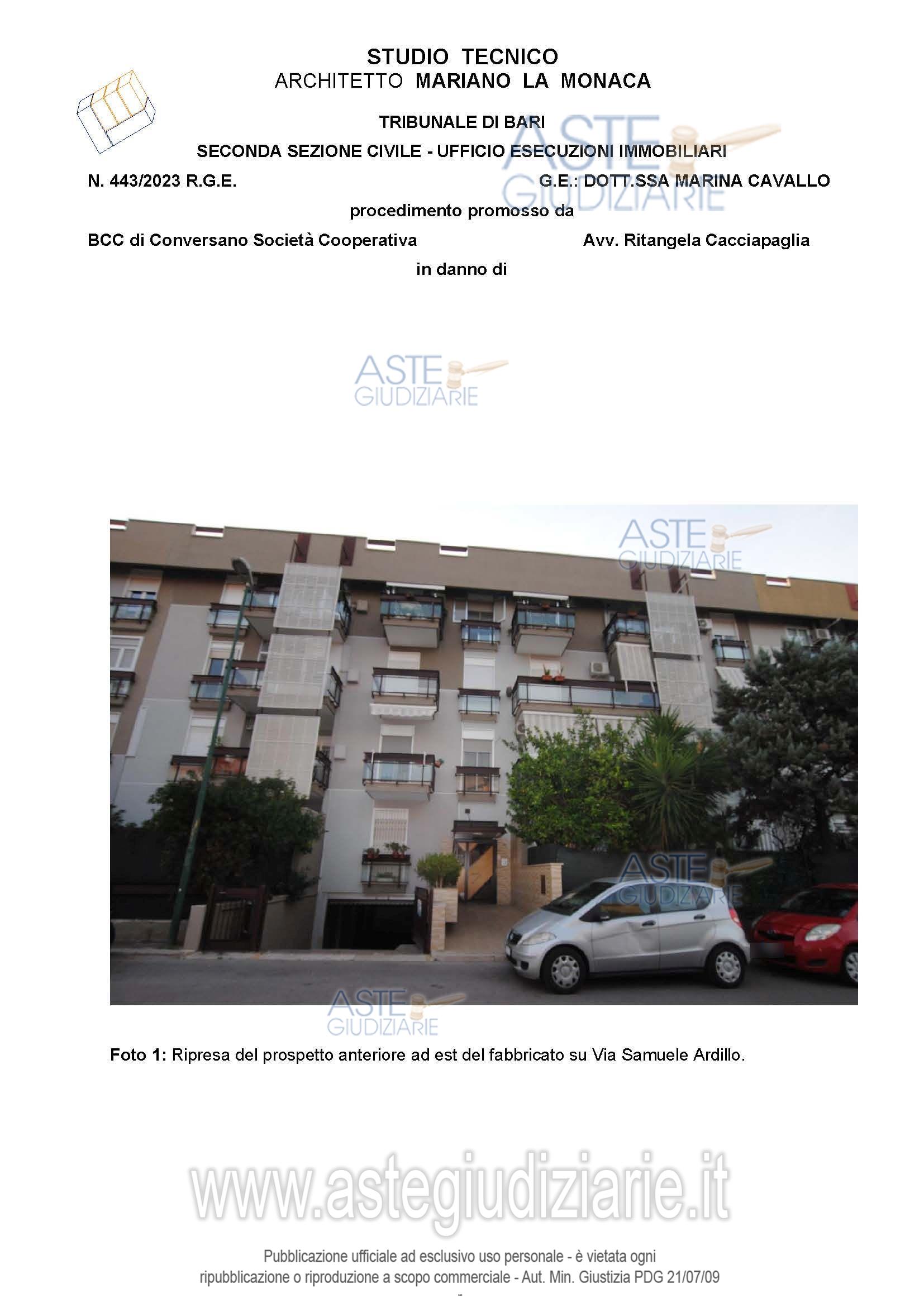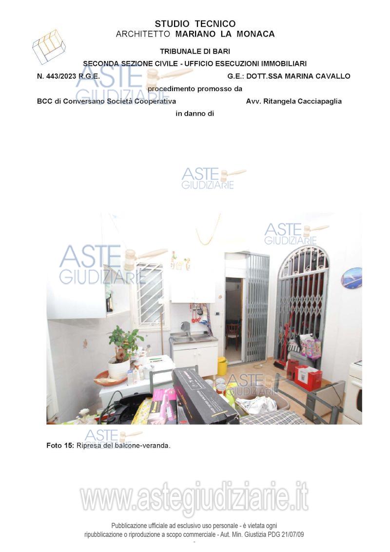 Vendita all'asta Senza incanto, con gara telematica asincrona - LOTTO UNICO: Appartamento per civile abitazione al piano rialzato composto di due vani e accessori, in particolare ingresso, corridoio, soggiorno-pranzo, camera da letto, cucina, bagno, balcone-veranda e balcone. Prezzo base € 70.000,00 (offerta minima € 52.500,00). Data inizio operazioni di vendita: 11/12/2025 ore 16:00. Giudice Dott. Marina Cavallo. Professionista delegato alla vendita Avv. Olimpia Pedota - Email "olimpia.pedota@libero.it". Custode Giudiziario Avv. Olimpia Pedota - Email "olimpia.pedota@libero.it". Rif. Tribunale di Bari - Espropriazione immobiliare (cartabia) n. 443/2023
